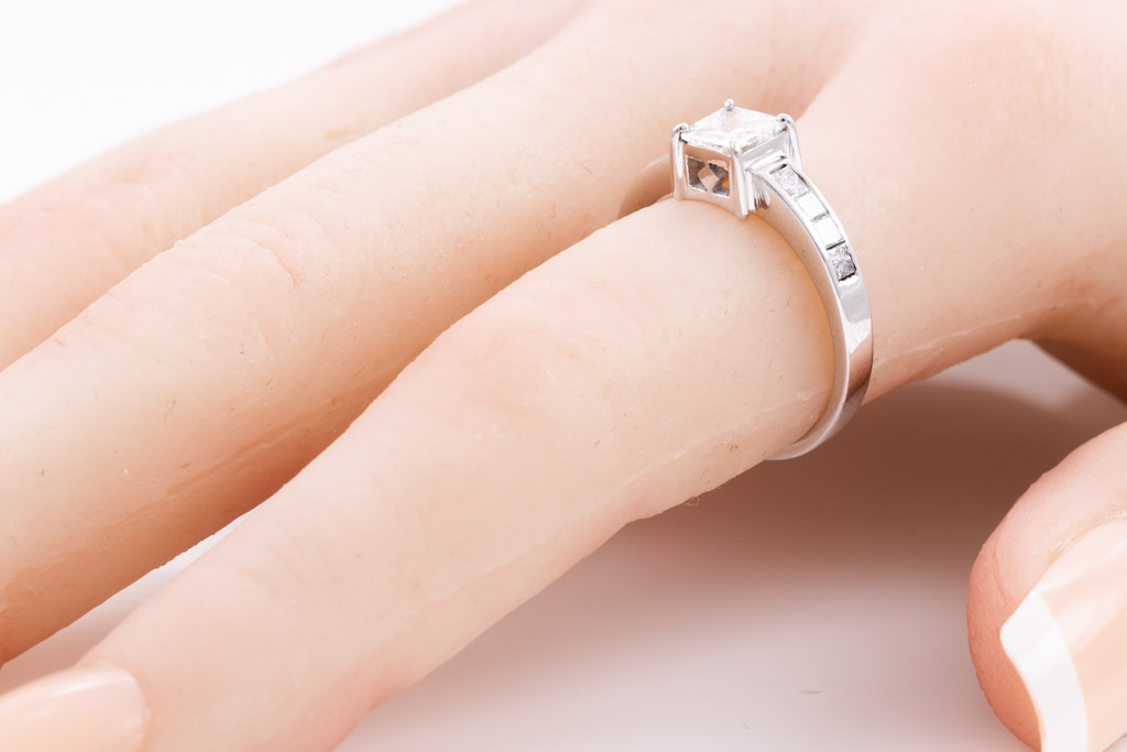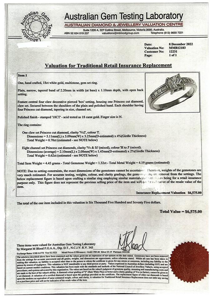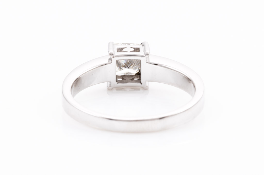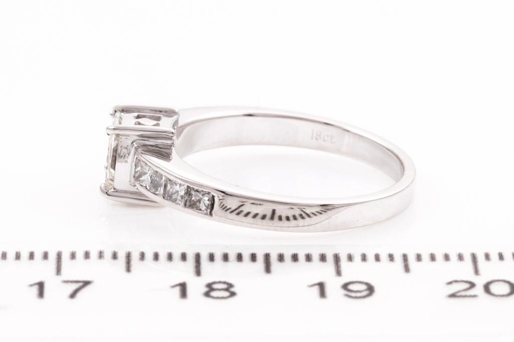 Diamond engagement ring with centre princess cut Diamond of 0.70ct (with copy of valuation report graded as T VS2) and remaining princess cut Diamonds totalling 0.62cts (Estimated grading: H-J VS-SI). 18ct white gold. Ring size N. Weight: 4.4g. (Pre-owned)