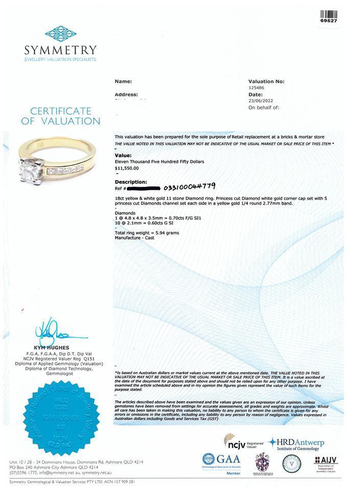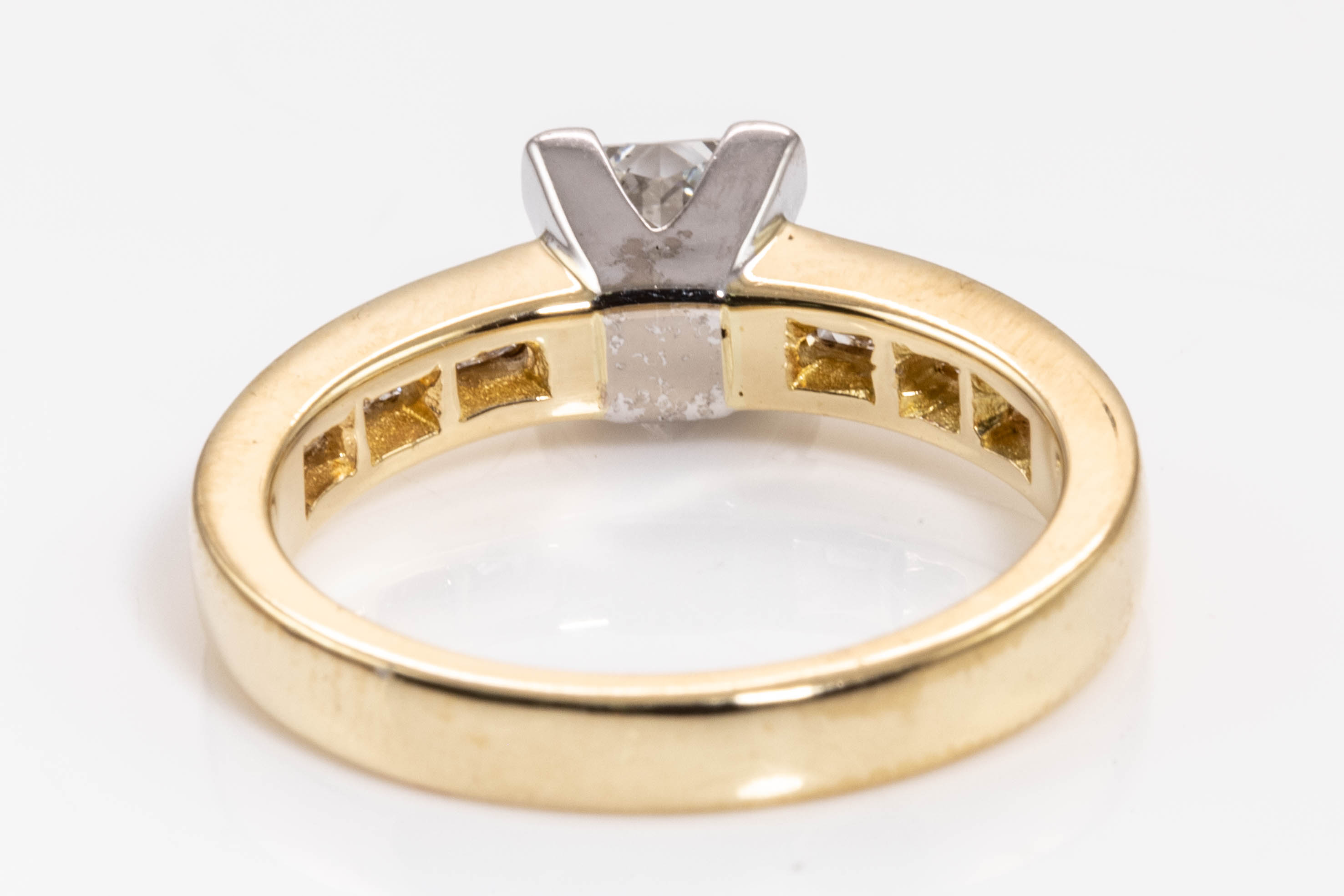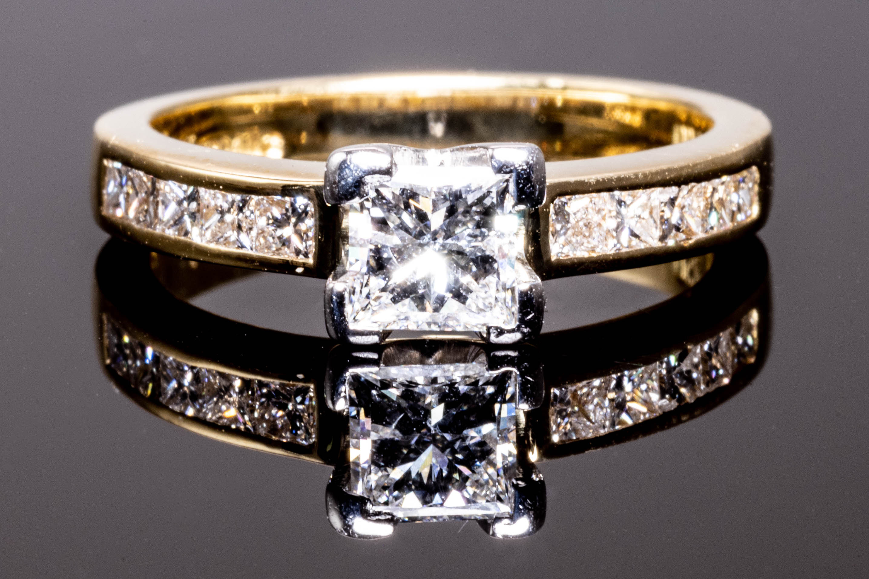 Diamond ring with centred princess cut Diamond of 0.70ct (Estimated grading F-G SI1) and round Diamonds totalling approximately 0.60cts (Estimated grading G SI). 18ct yellow and white gold. Ring size M 1/2 - resizing not recommended. Weight 5.9g. With Valuation #125486. (Pre-owned)
