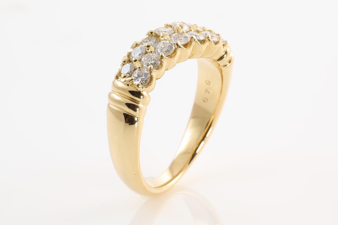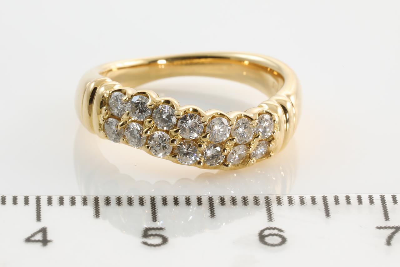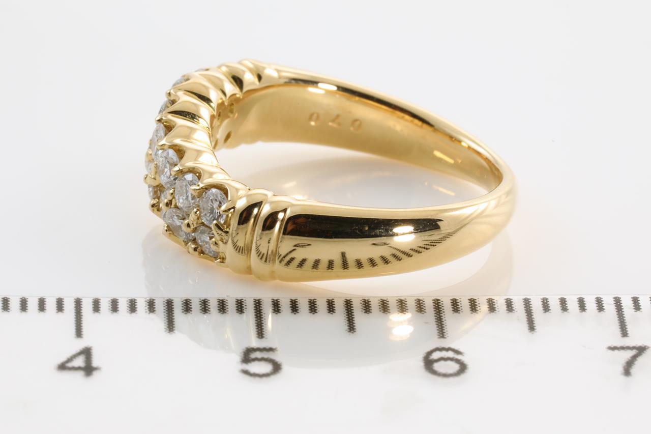 Diamond dress ring with round Diamonds totalling 0.70cts (Estimated grading: H-I P1). 18ct yellow gold. Ring size: K1/2 - Note this ring can only be resized up by a maximum of 3 sizes, down by ring clip. Weight: 7.2g. (Pre-owned)