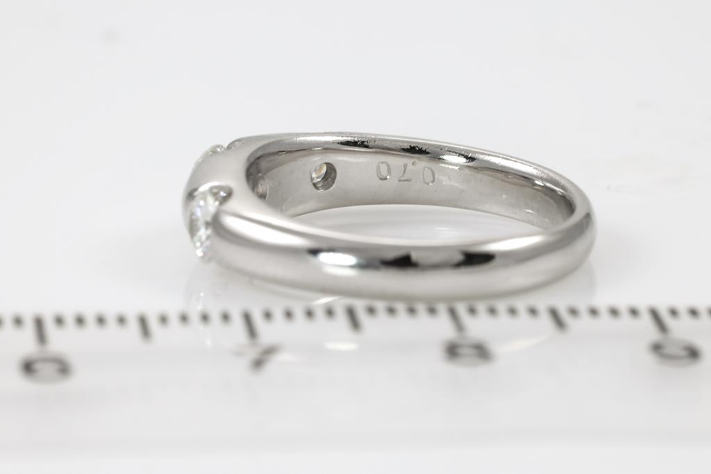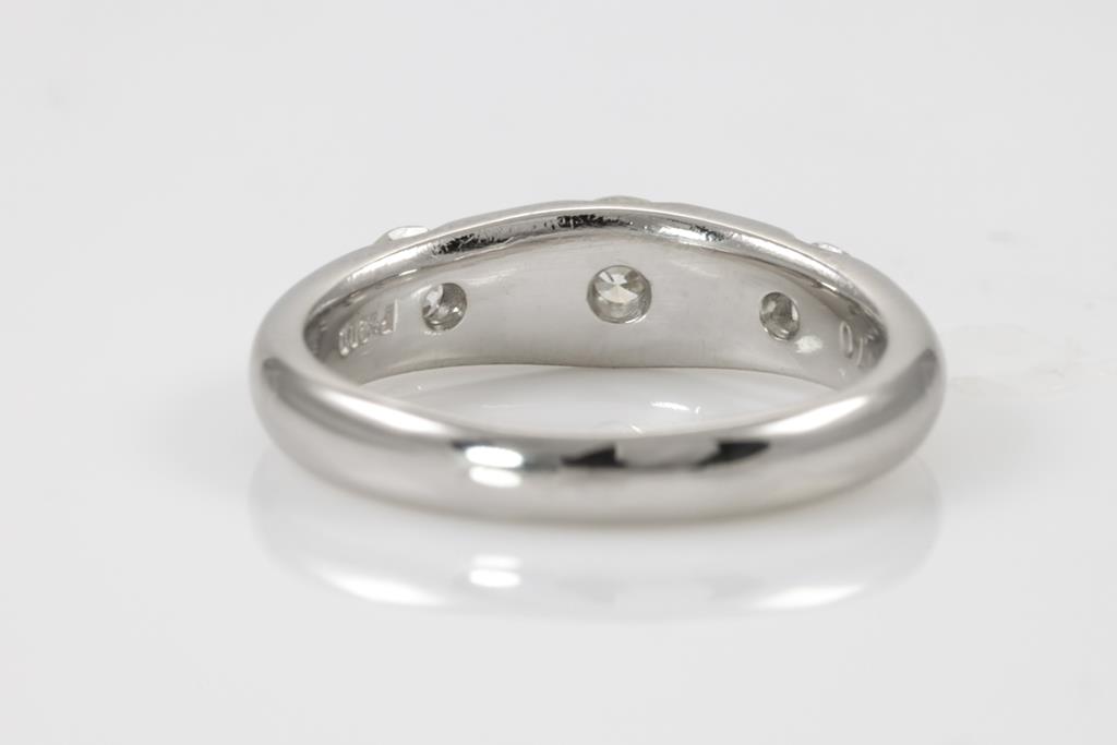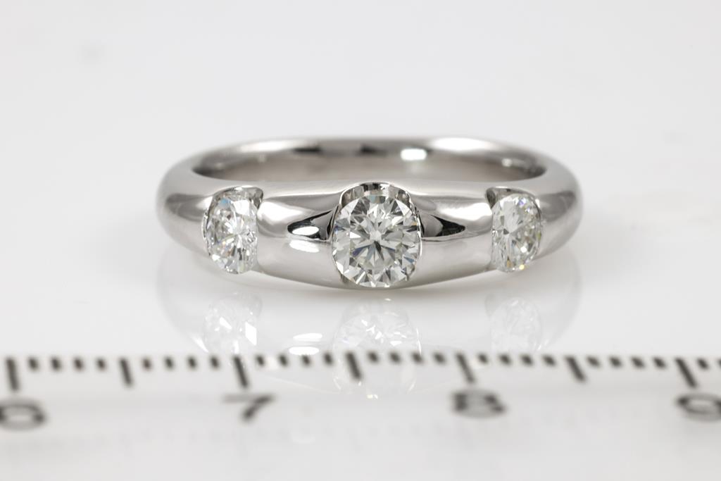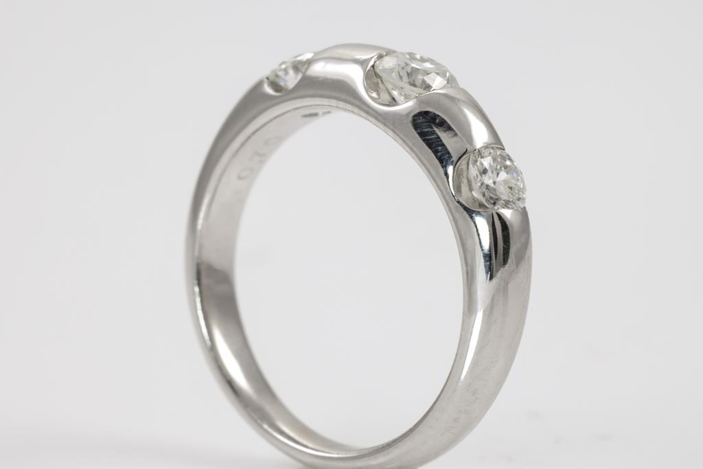 Diamond dress ring with 3 round cut Diamonds totalling 0.70cts (Estimated grading: H-I SI). Platinum. Ring size: K1/2. Weight: 7.4g. (Pre-owned)