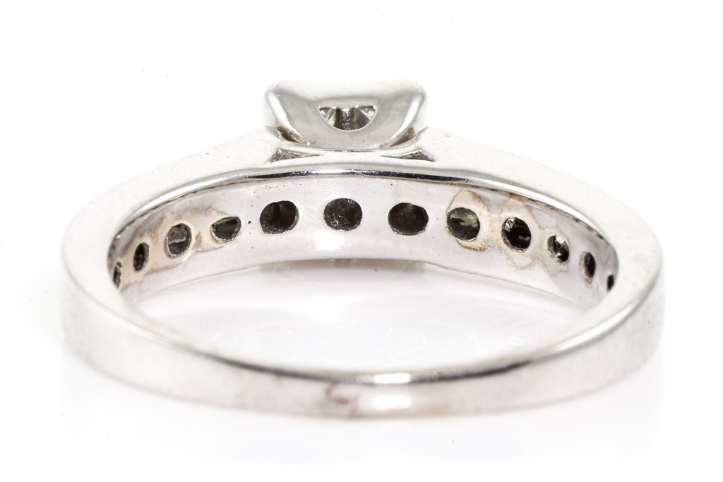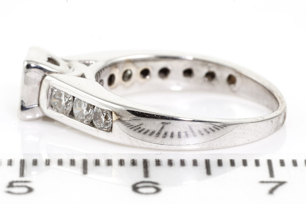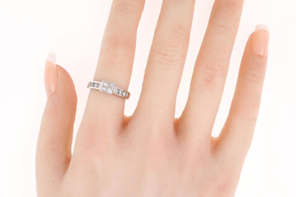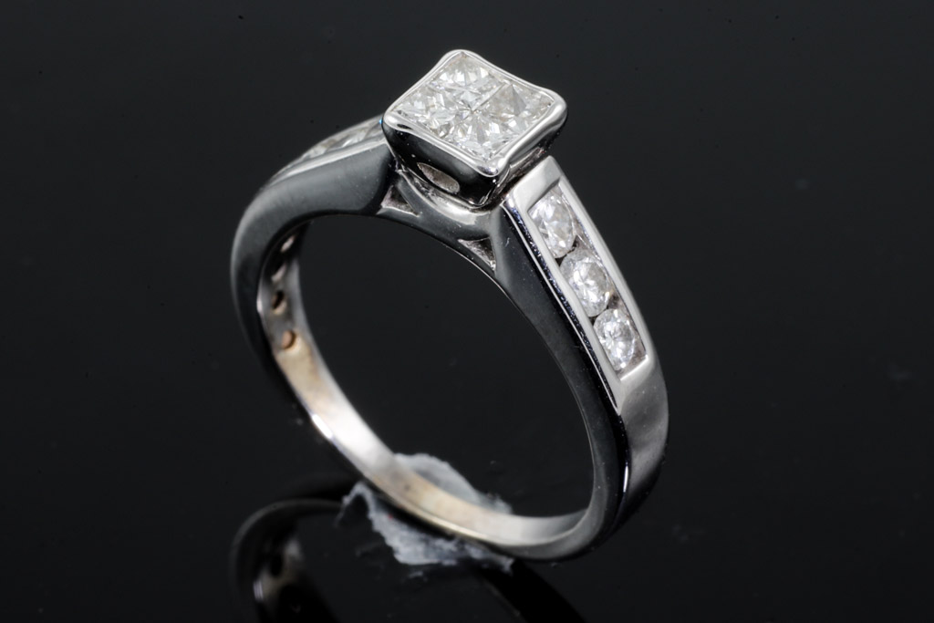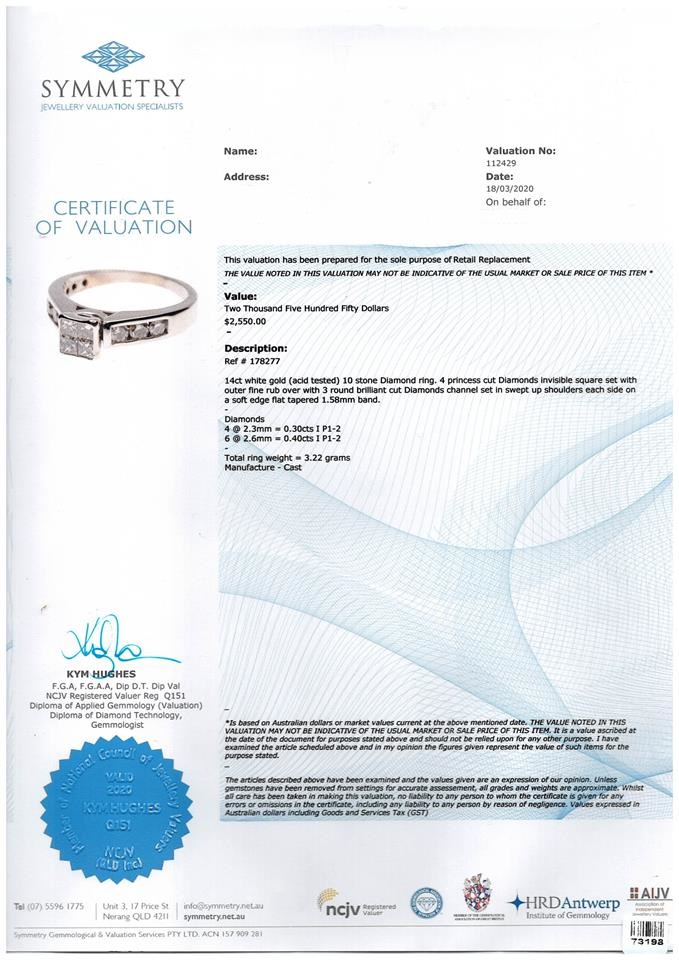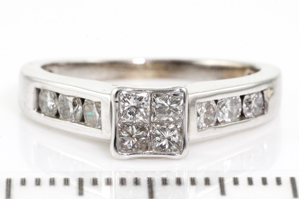 Diamond dress ring with round and princess cut Diamonds totalling 0.70cts (Estimated grading: I P1-2). 14ct white gold. Ring size I 1/2. Weight: 3.2g. With Valuation Certificate Ref #024000178277. (Pre-owned)