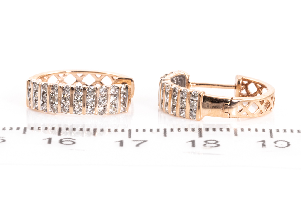Diamond hoop earrings with 60 round diamonds totalling 0.70cts. (Estimated grading: H SI). 14ct rose gold. Weight: 3.3g. (New)