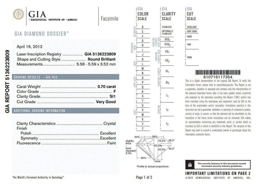 Diamond solitaire ring with Round Brilliant cut Diamond of 0.70ct (with a copy GIA report graded as F SI1 #5136223809). 18ct white gold. Ring size J. With Midas Jewellers appraisal dated 23 Dec 2014, purchase receipt & Midas Jewellery box. Weight: 3.3g (Pre-owned)