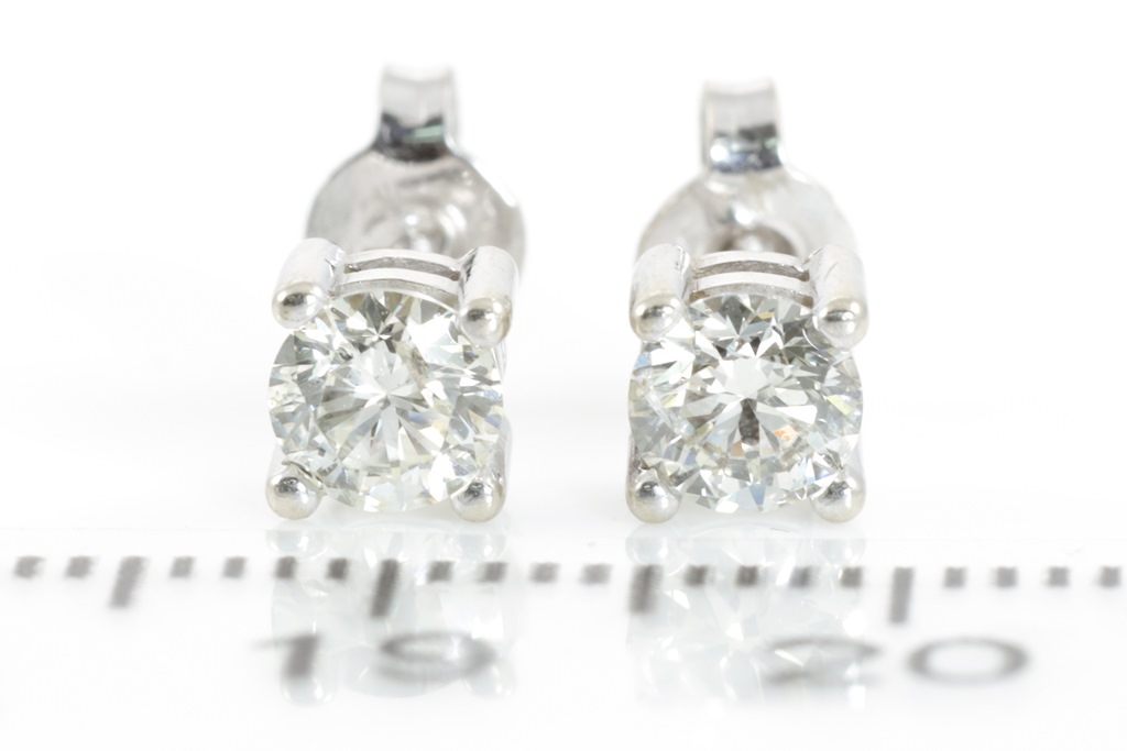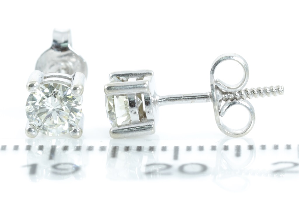 Diamond stud earrings with 2 round brilliant cut Diamonds totalling 0.70cts (Estimated grading K-L SI2-P1). 9ct white gold with srew backs. Weight: 1.3g. (Pre-owned)