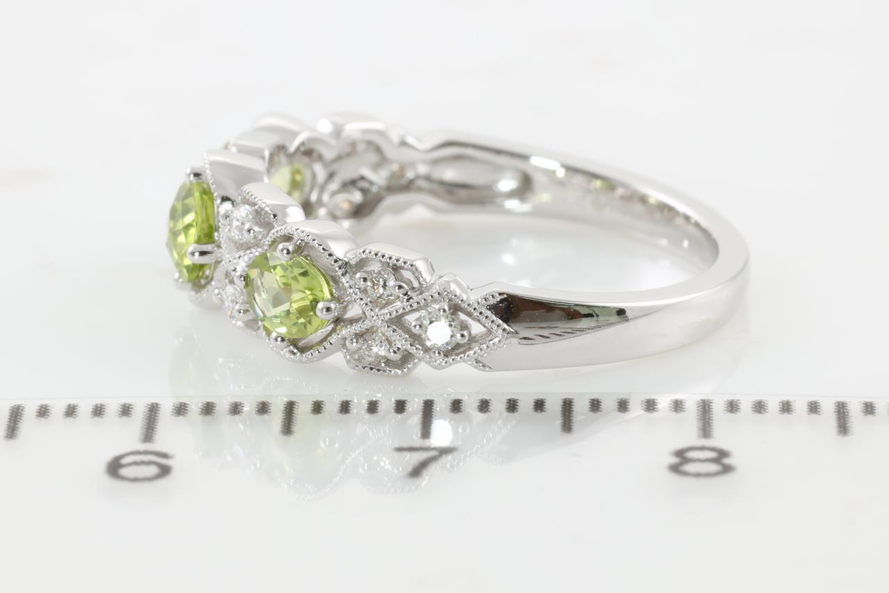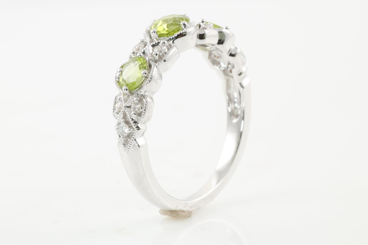 Peridot and Diamond ring with oval shape Peridots totalling 0.70cts and Diamonds totalling 0.11cts. 14ct white gold. Ring size N1/2 - It is not recommended to resize this ring. Weight: 3.1g (New)