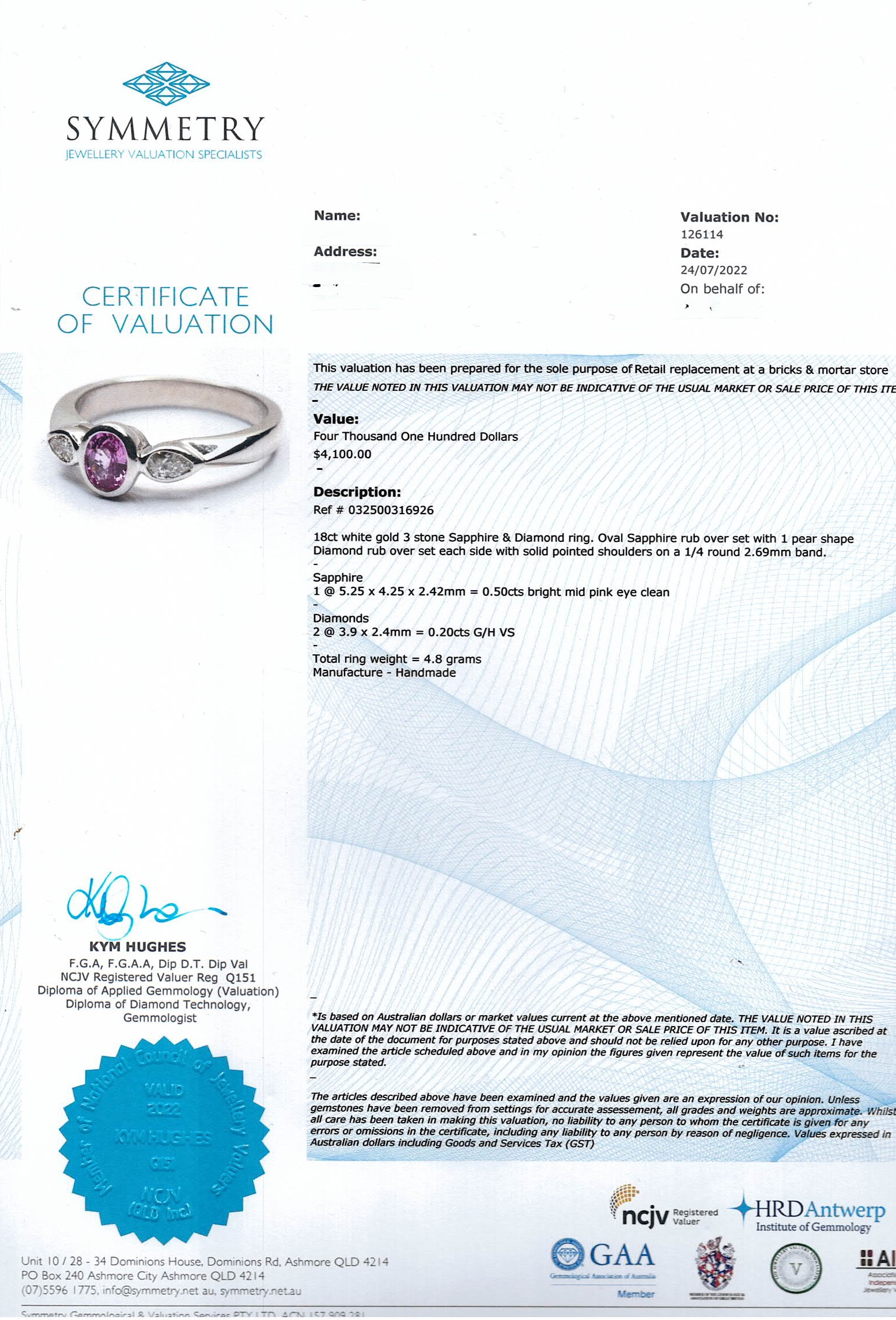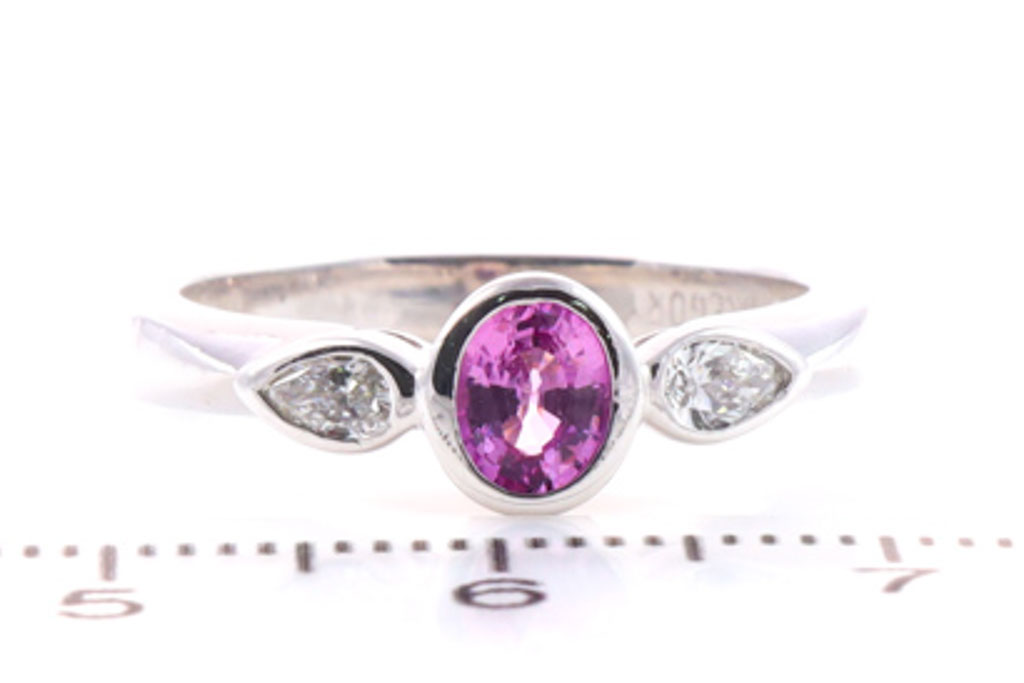 Sapphire and Diamond ring with oval pink Sapphire of 0.50ct and pear shape Diamonds totalling 0.20cts. 18ct white gold. Ring size M. Weight: 4.8g. With Valuation Certificate #032500316926.
