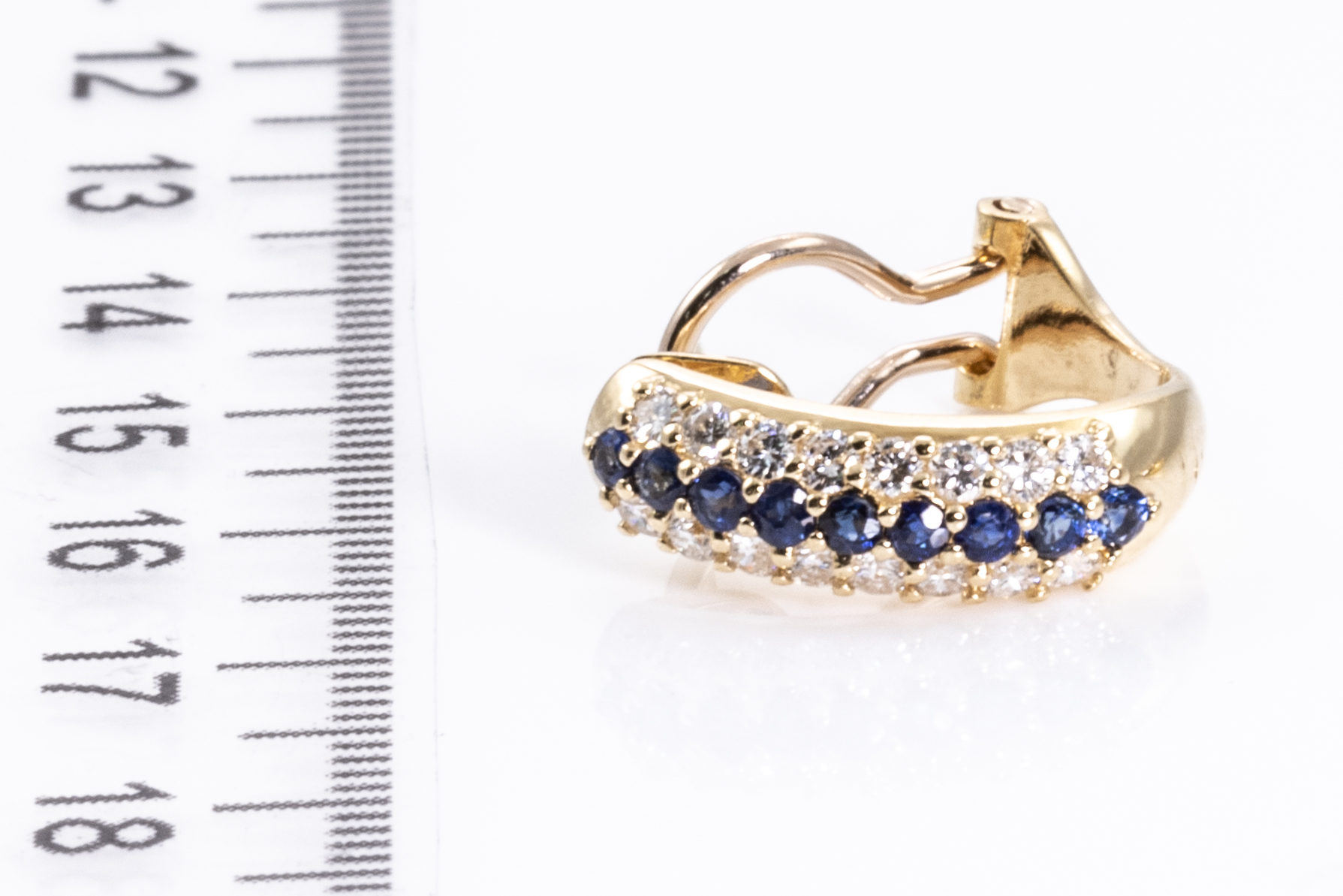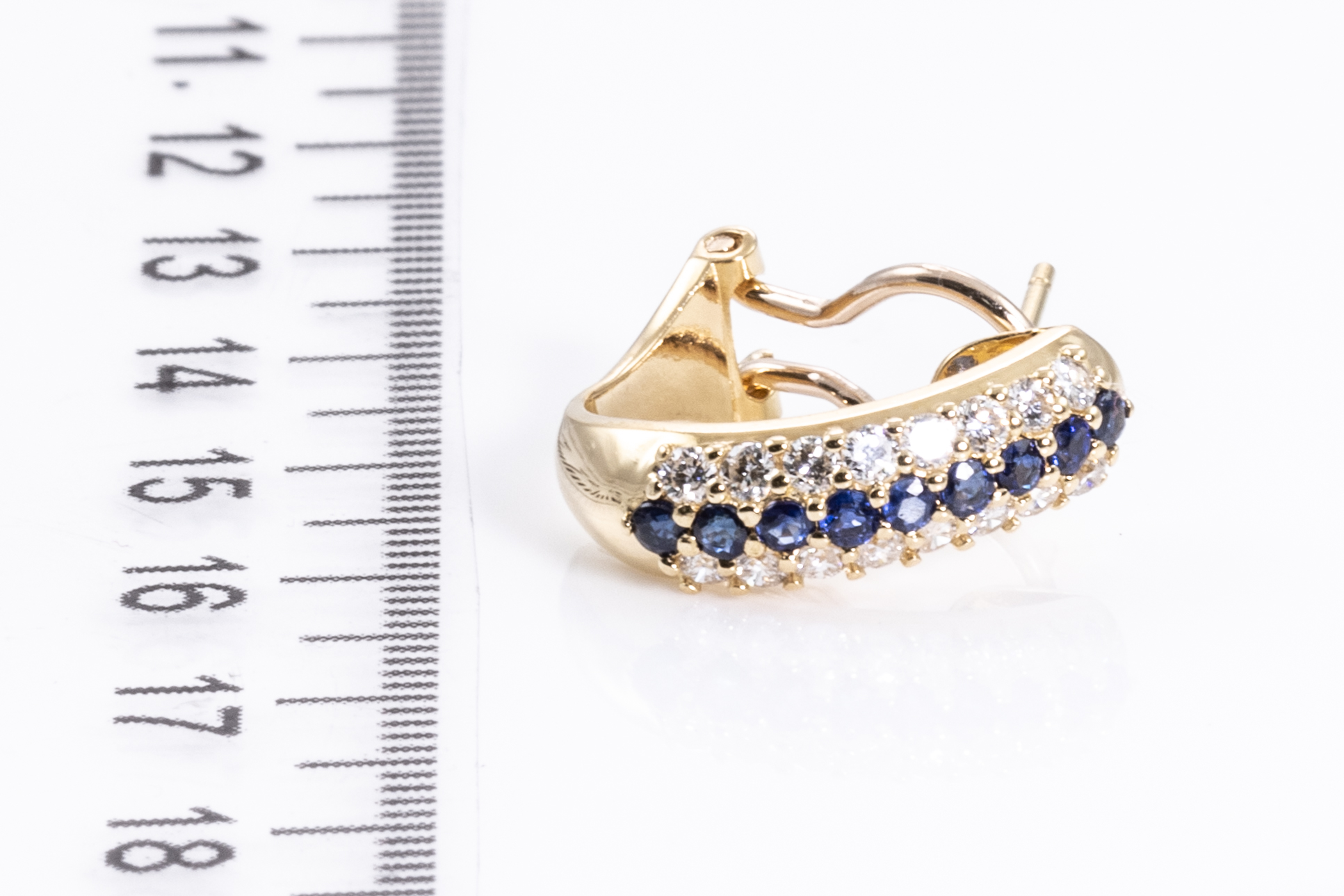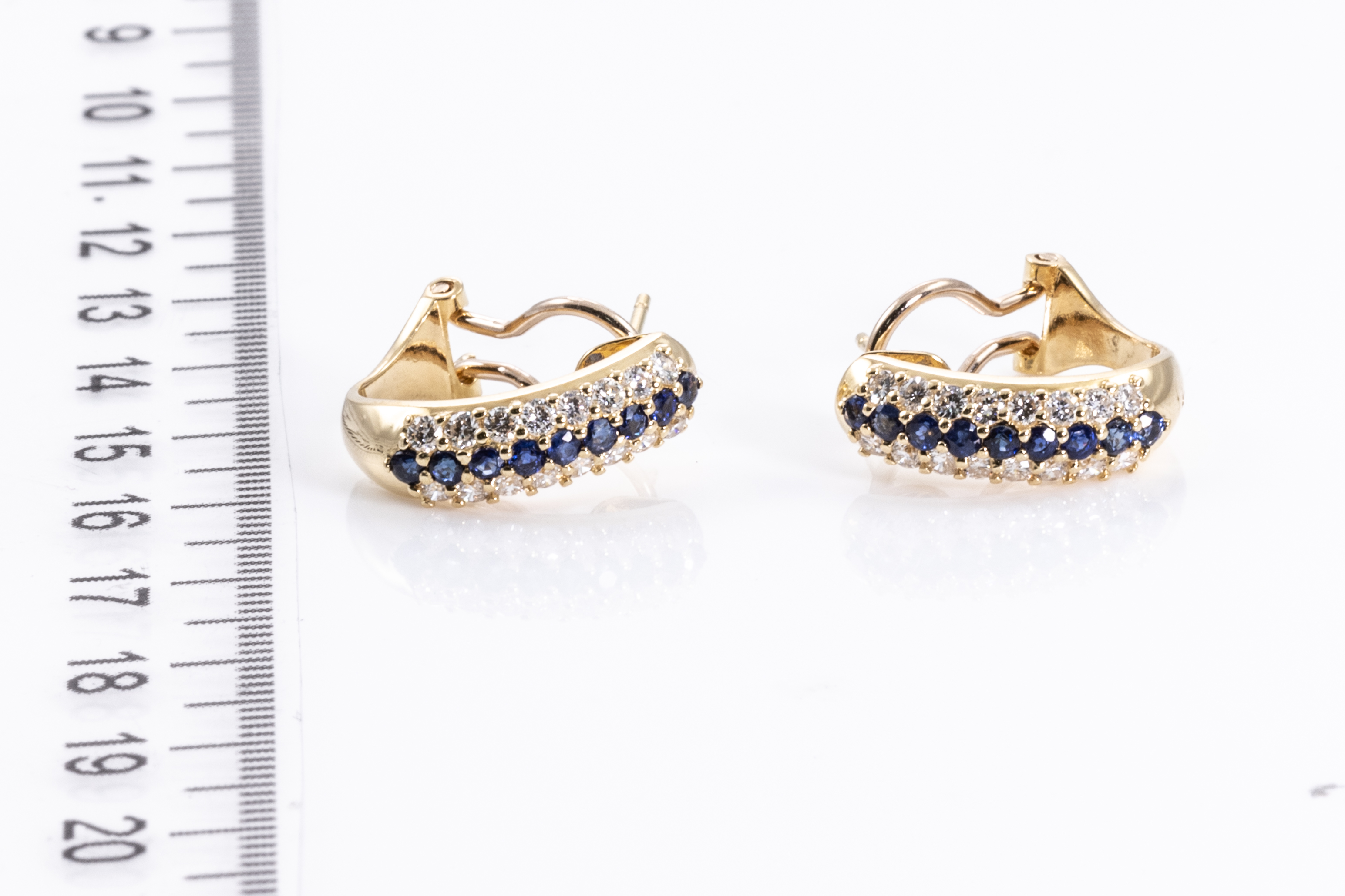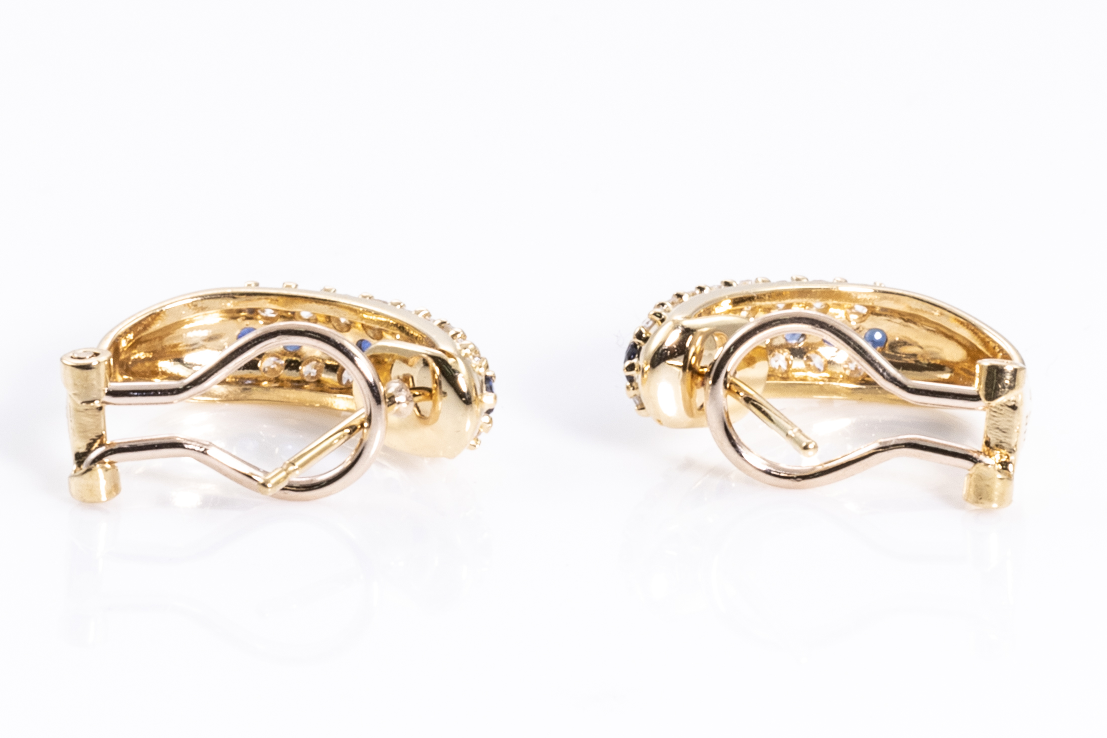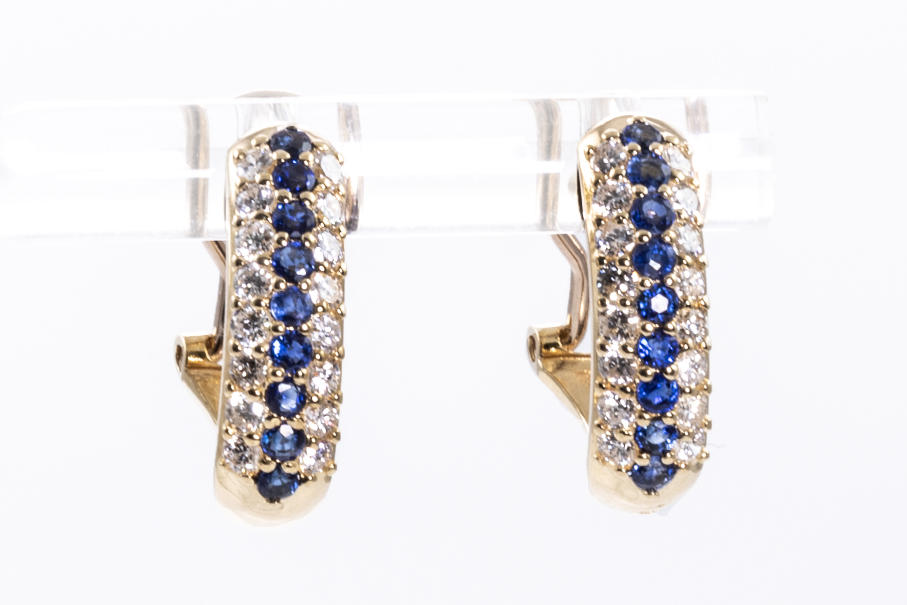Sapphire and Diamond earrings with round blue Sapphires totalling 0.70cts and round Diamonds totalling 0.70cts (Estimated grading: H SI). 18ct yellow gold. Weight: 5.5g. (Pre-owned)