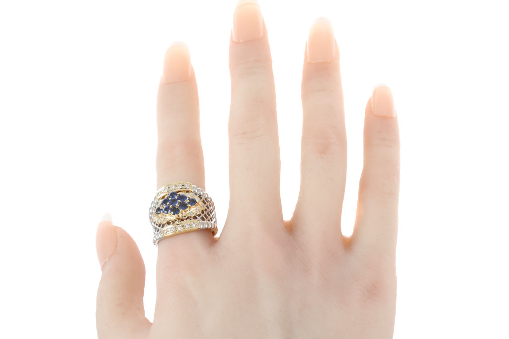 Sapphire and Diamond ring with round blue Sapphires totalling approximately 0.70cts and round Diamonds totalling approximately 0.30cts (Estimated grading: G-H SI-P1). 18ct yellow gold and Platinum-900. Ring size O1/2. Weight: 15.9g (Pre-owned)