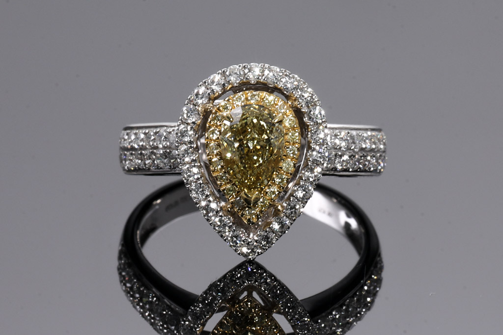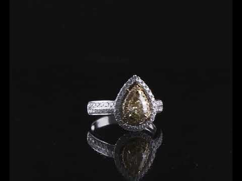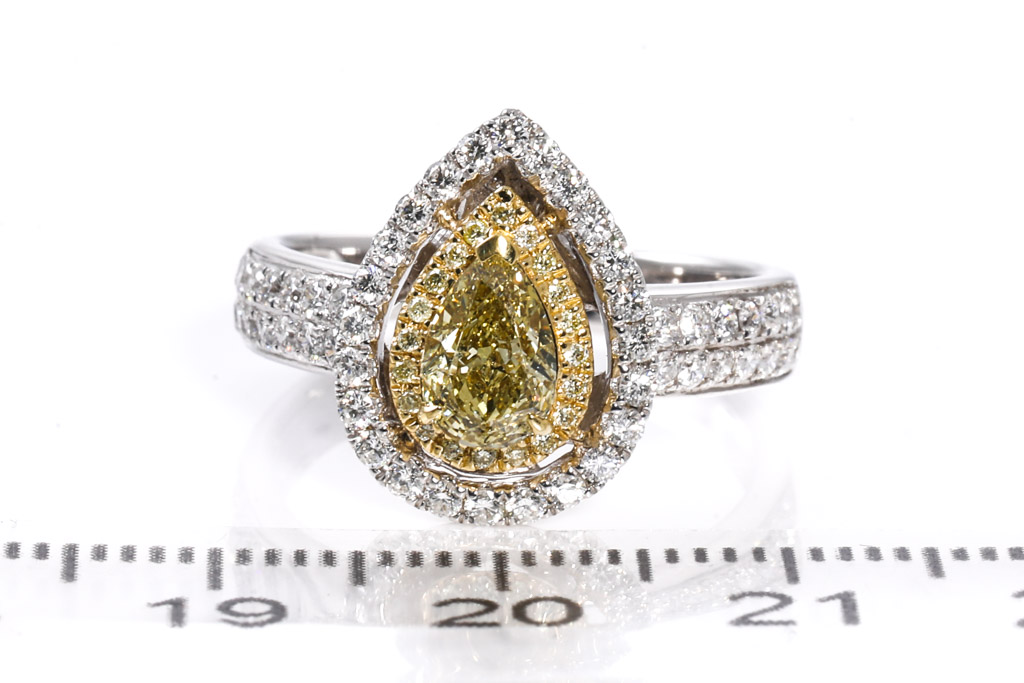 Diamond double halo ring with pear shape Diamond of 0.71ct (Estimated grading: Fancy Yellow SI) and surrounding round Diamonds totalling 0.68cts (Estimated grading: Fancy Yellow & G-H SI). 18ct yellow gold and white gold. Ring size N. Weight: 5.6g. With Certificate #416444. (As new)