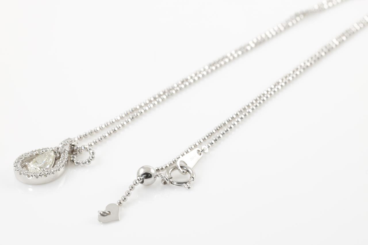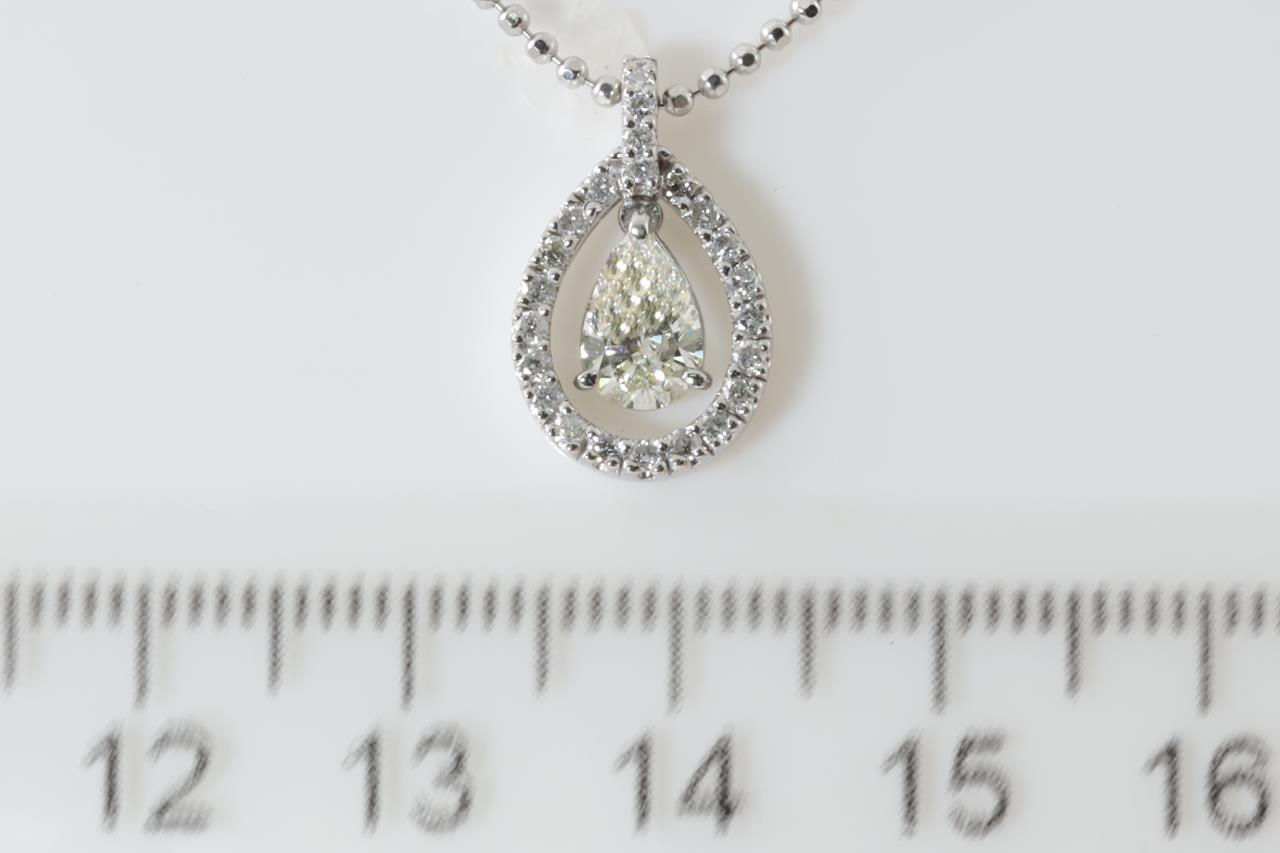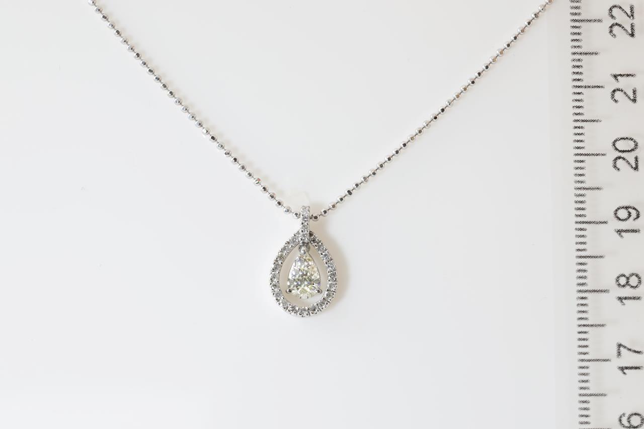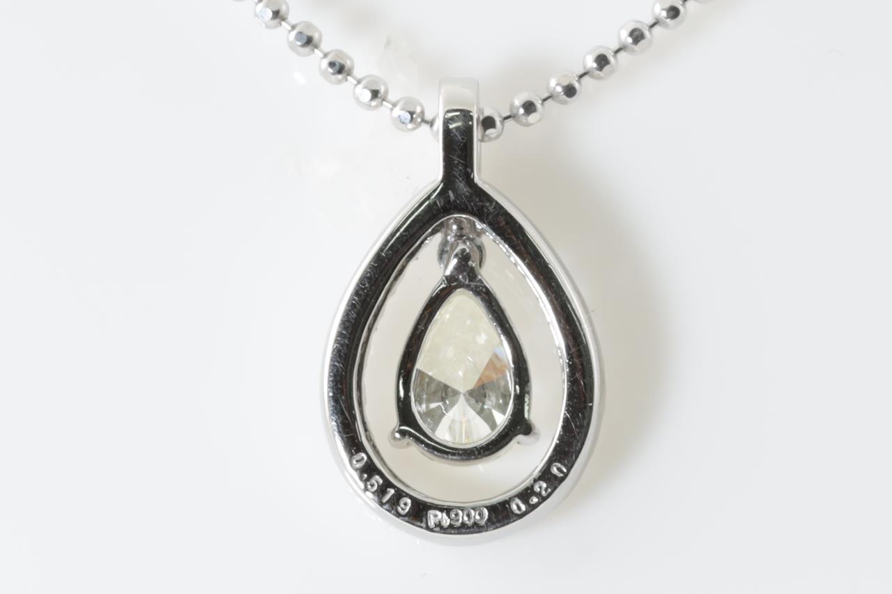 Diamond pendant with a centre pear shape Diamond of 0.51ct (Estimated grading: J-K SI) and remaining Diamonds totalling 0.20cts. Platinum with 45cm platinum adjustable chain. Weight: 5.9g. (Pre-owned)