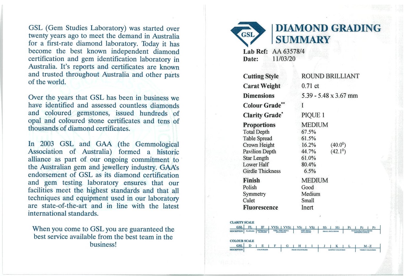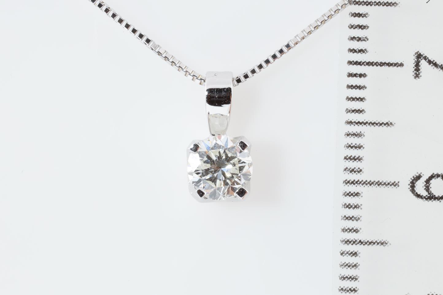 Diamond solitaire pendant with round brilliant cut Diamond of 0.71ct (with GSL summary report graded as J P2 #AA 63578/3). 18ct white gold with 45cm adjustable 18ct white gold chain. Weight: 2.7g (New)