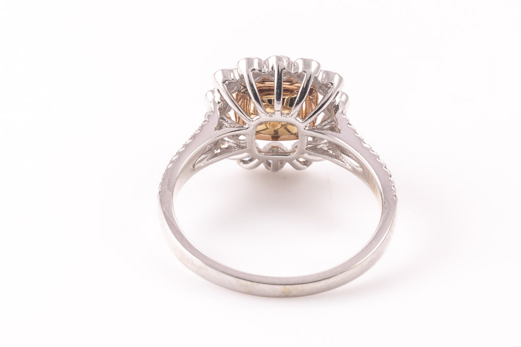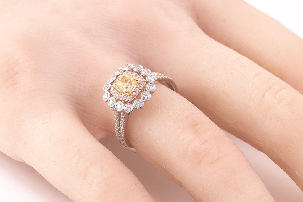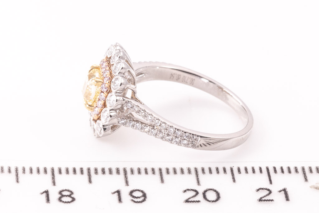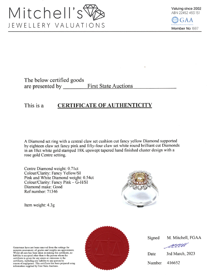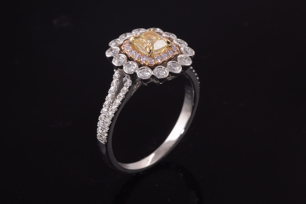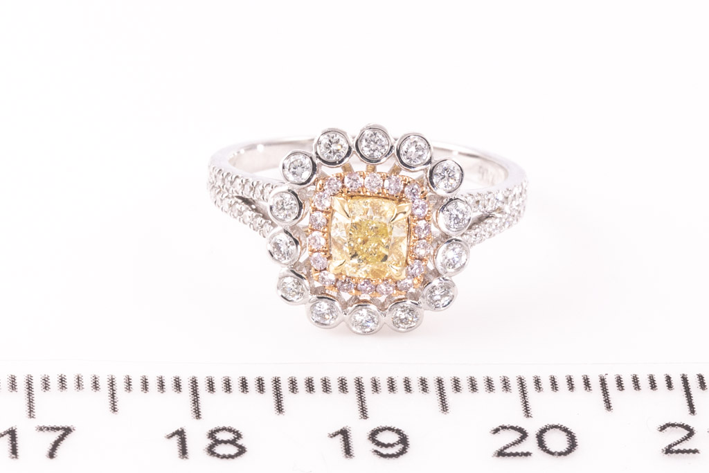 Diamond ring with centre cushion cut Yellow Diamond of 0.71ct (Estimated grading Fancy Yellow SI) and round Diamonds totalling 0.54cts (Estimated grading: Fancy Pink & G SI). 18ct rose and white gold. Ring size N - ring resizing is not recommended. Weight: 4.3g. With certificate #416652. (As New)