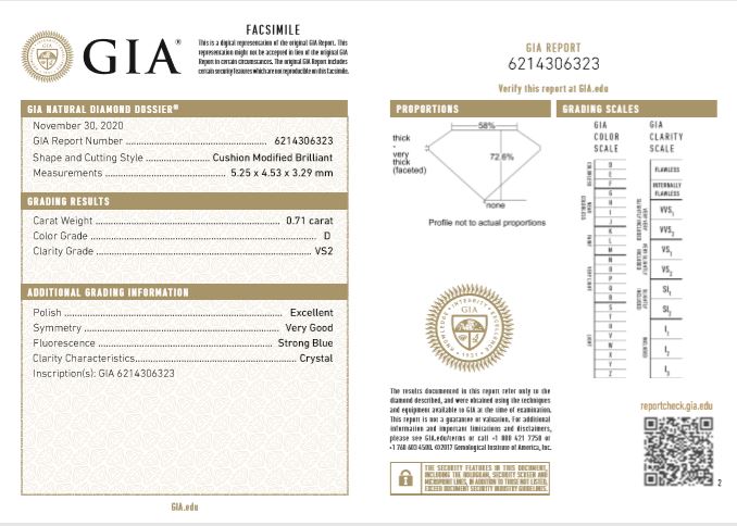 A loose Cushion Cut Diamond of 0.71ct (with GIA report graded as D VS2 #6214306323). (New)