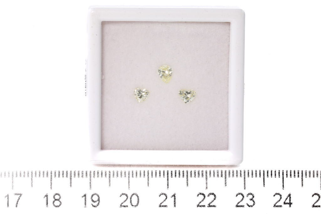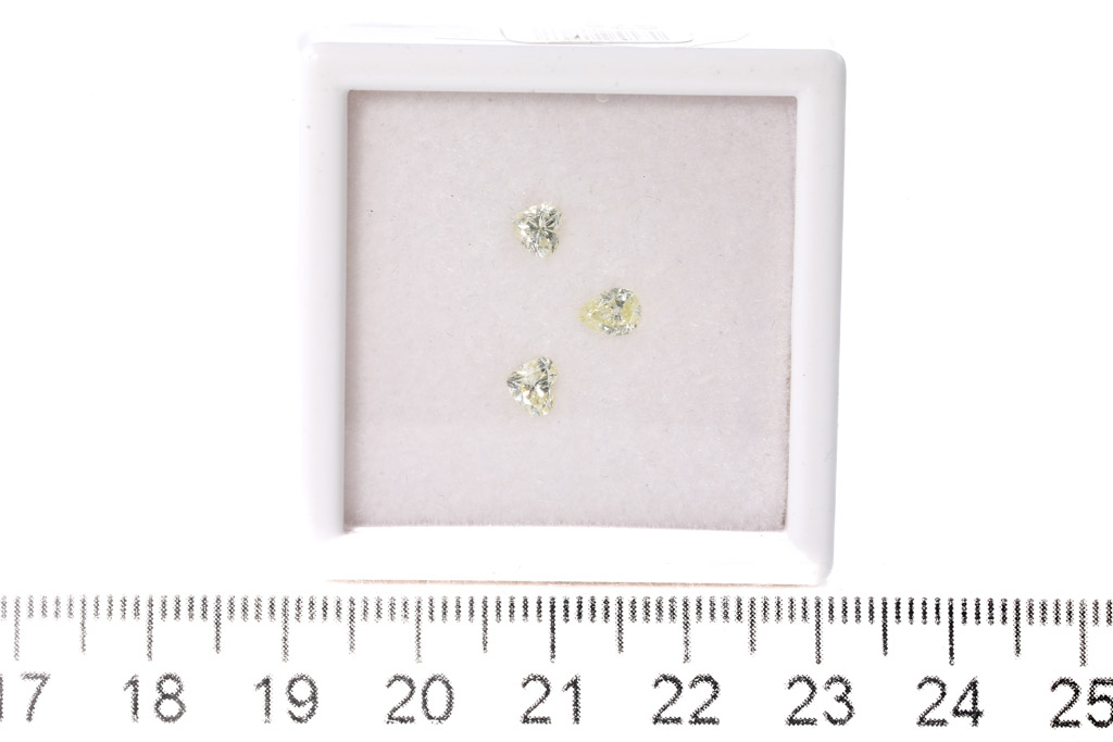 A loose parcel of 2 heart shaped Diamond and 1 pear shape Diamond totalling 0.71cts (Estimated grading: Fancy Light Yellow SI). (New)