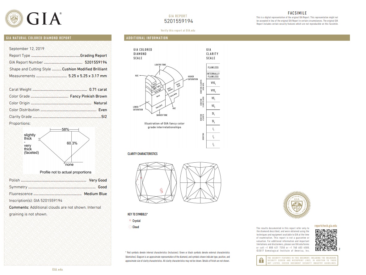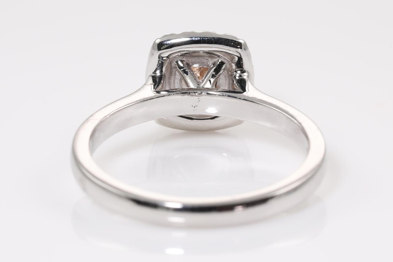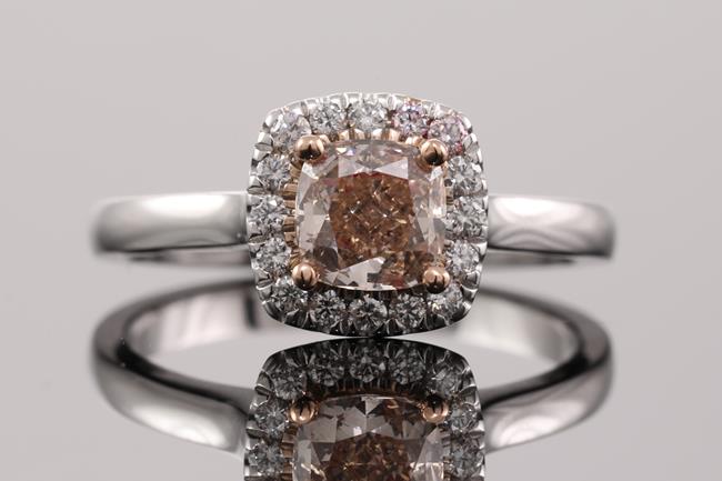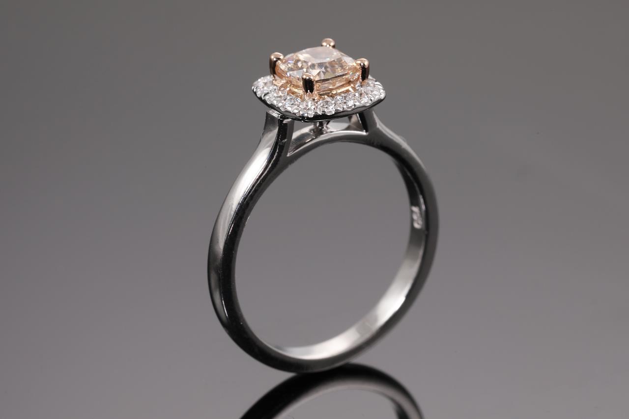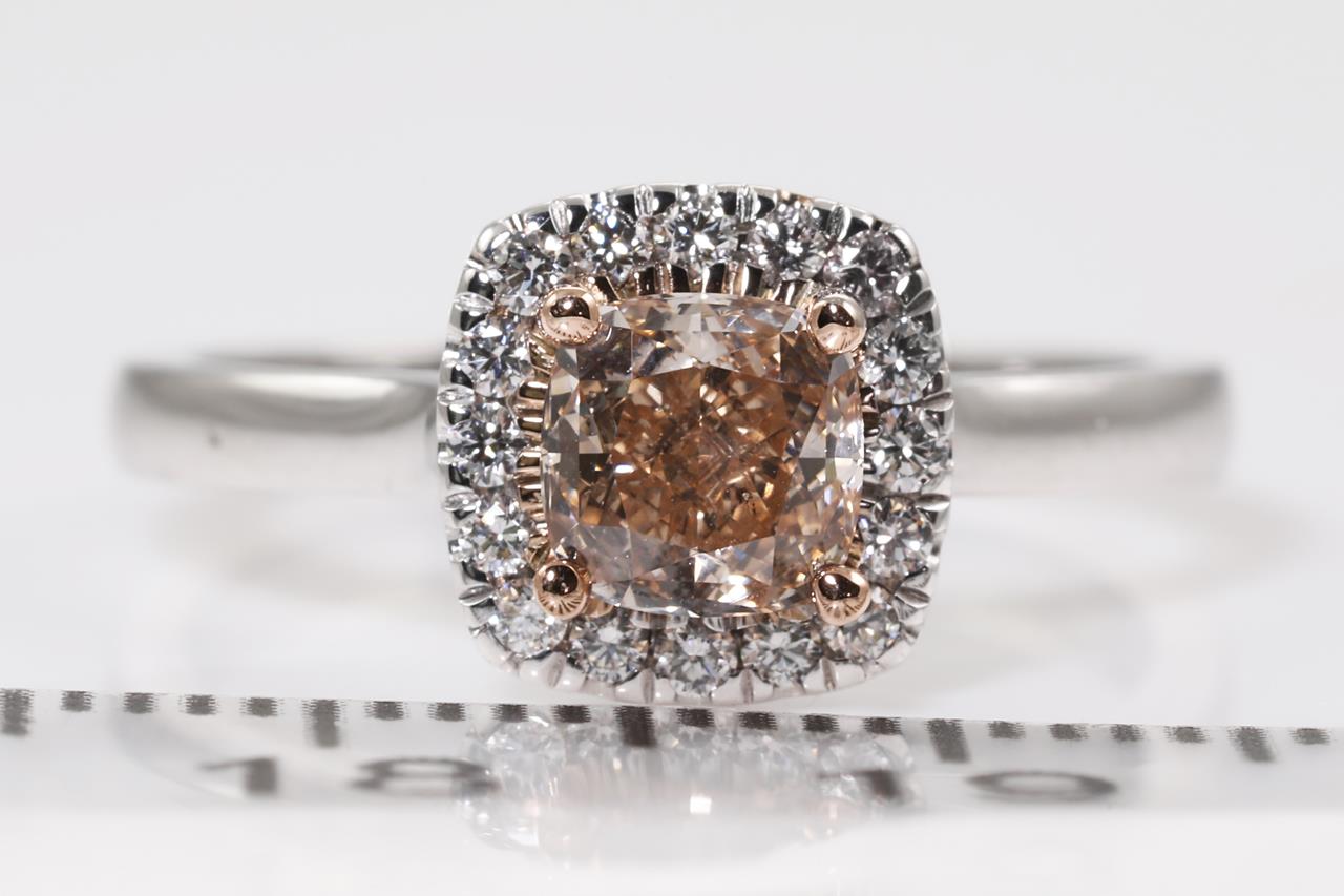 Diamond halo ring with centre cushion cut Diamond of 0.71ct (with GIA report graded as Natural Fancy Pinkish Brown Even SI2 #5201559194) and surrounding diamonds totalling 0.14cts. 18ct white and rose gold. Ring size K. Weight: 4g. (New)