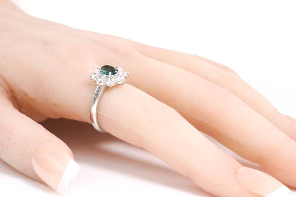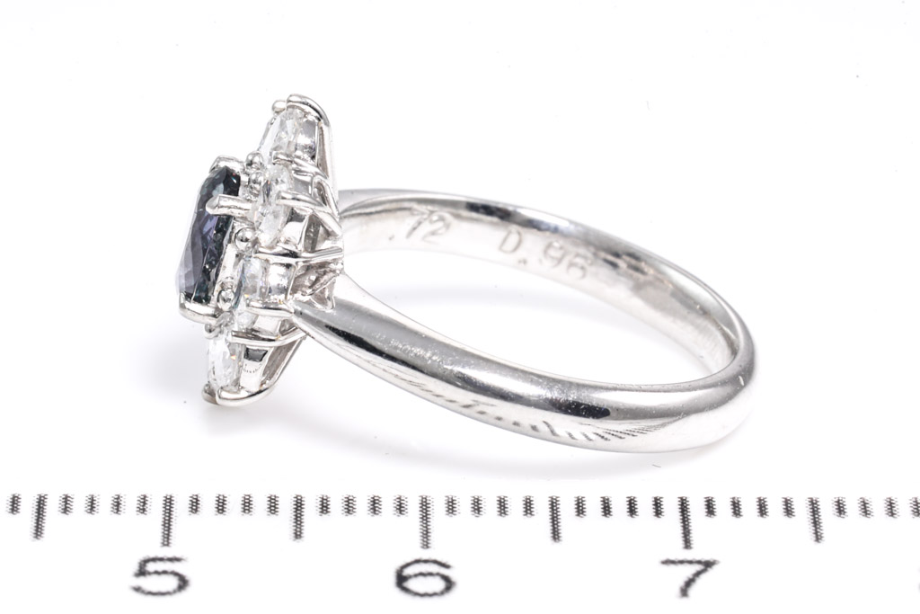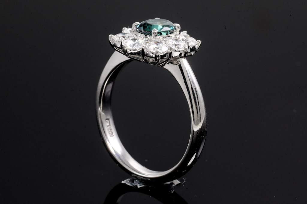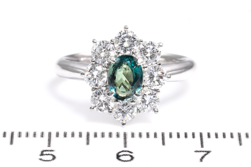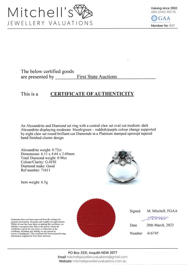 Alexandrite and Diamond ring with oval shape Alexandrite of 0.72ct and round Diamonds totalling 0.96cts (Estimated grading: G-H SI). Platinum. Ring size K1/2. Weight: 6.5g. With certificate #416745. (Pre-owned)