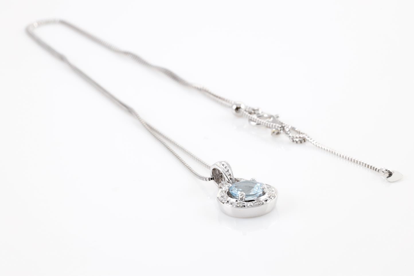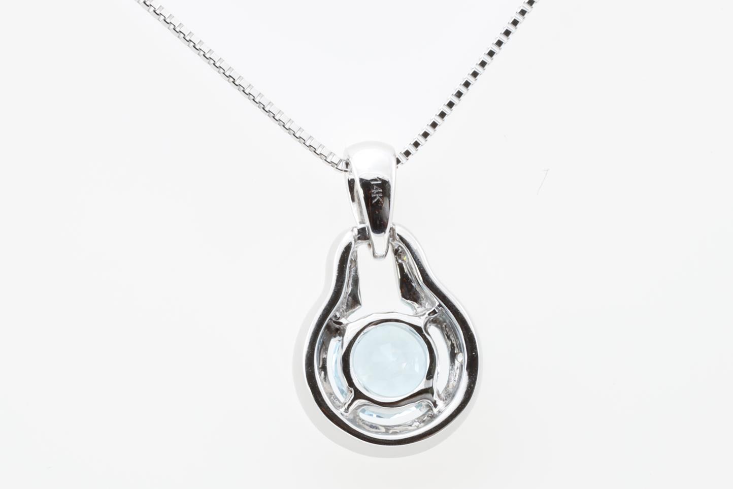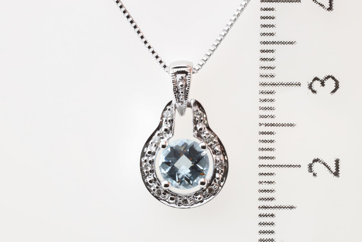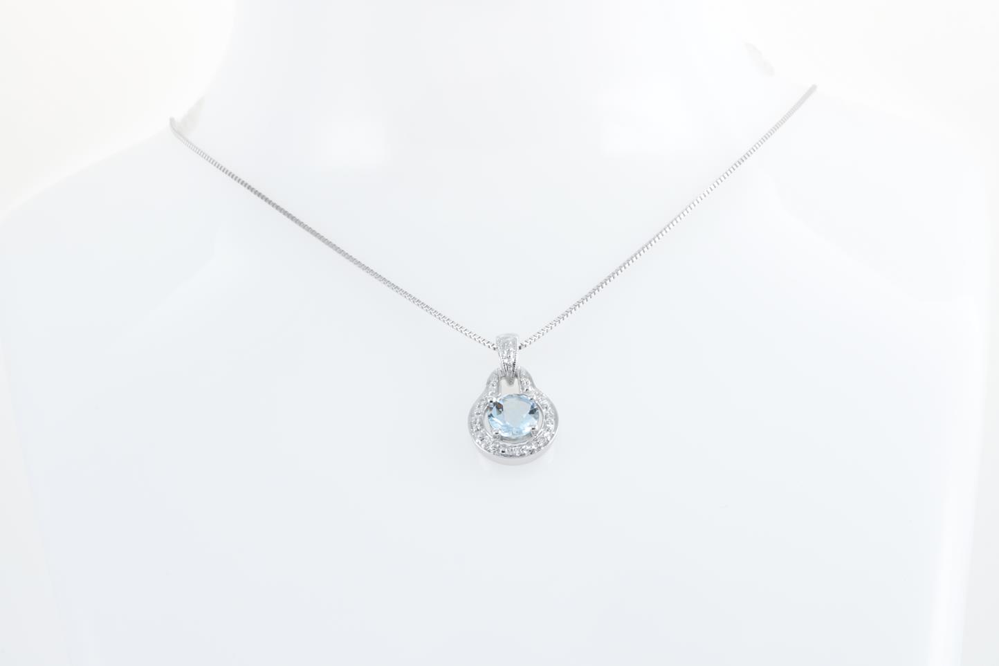 Aquamarine and Diamond pendant with a round shape Aquamarine of 0.72ct and Diamonds totalling 0.06cts. 14ct White gold with 18ct gold adjustable 45cm chain. Weight: 5.6g (New)