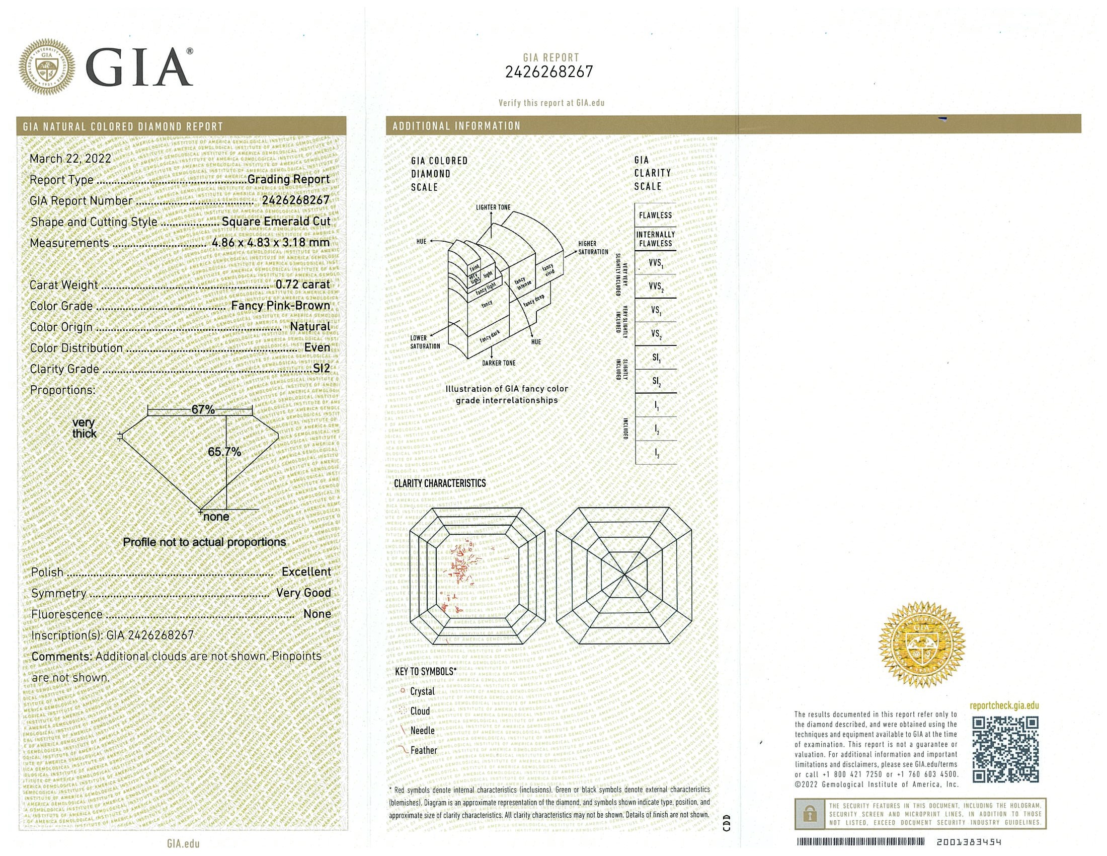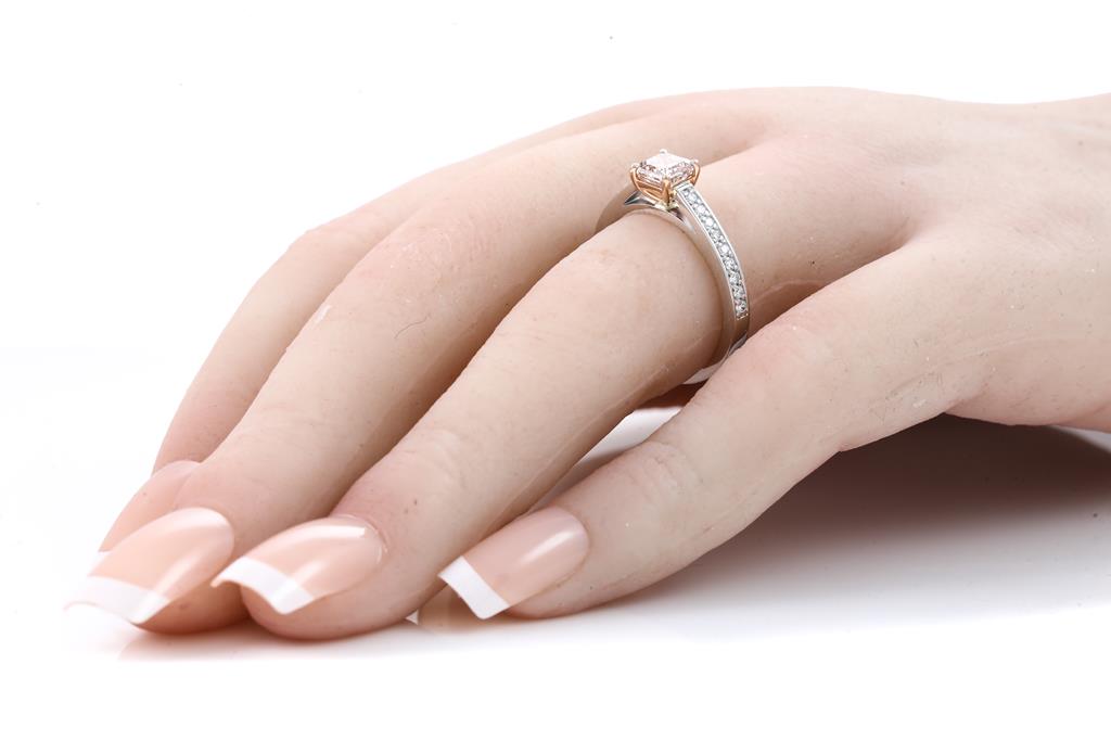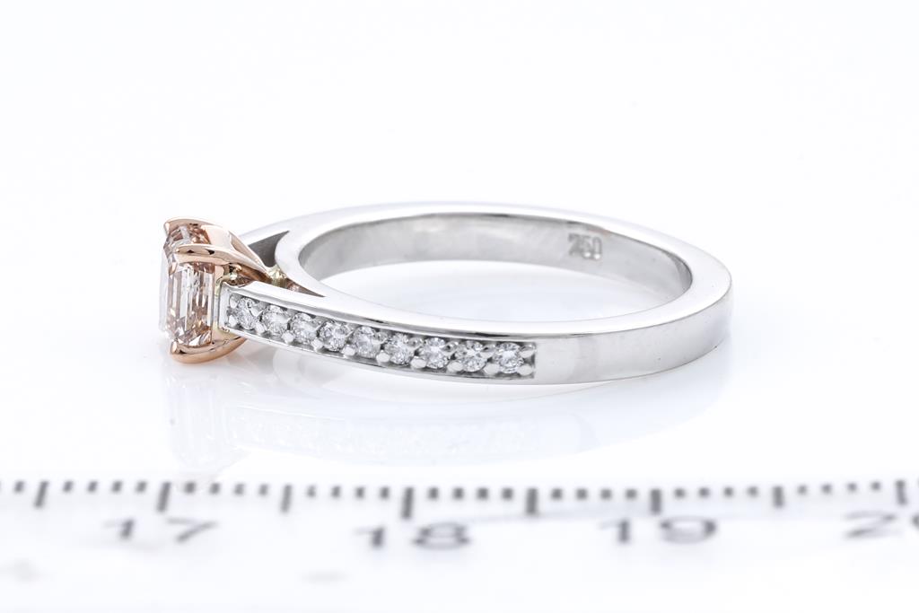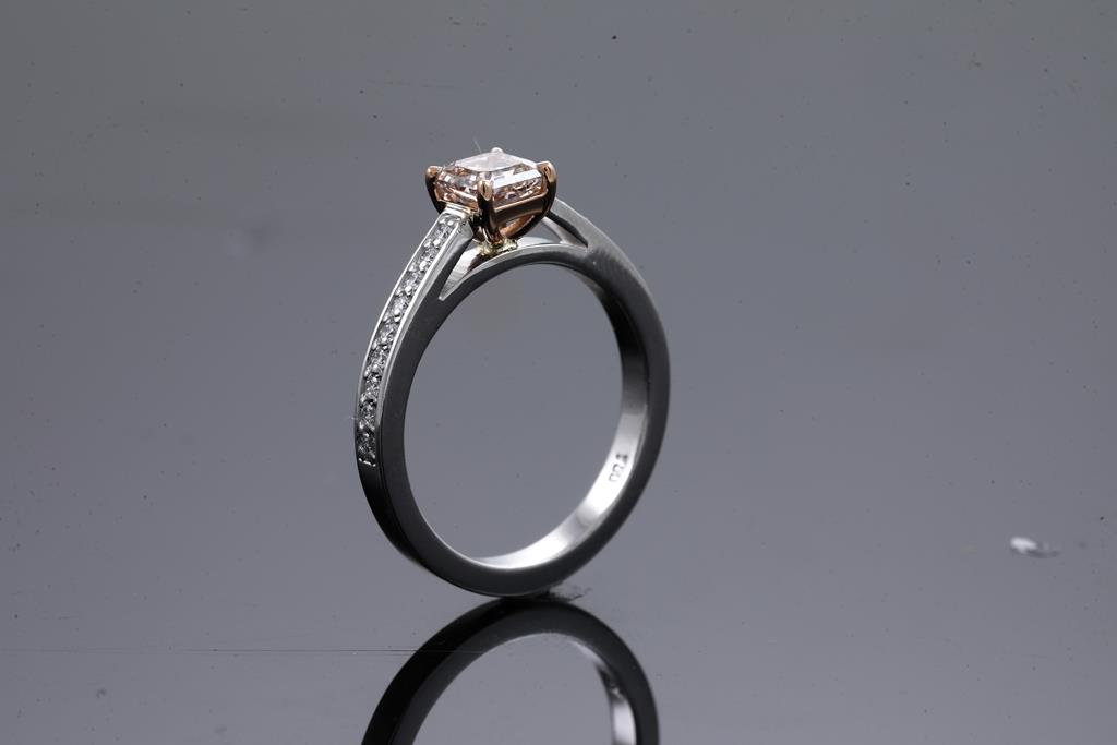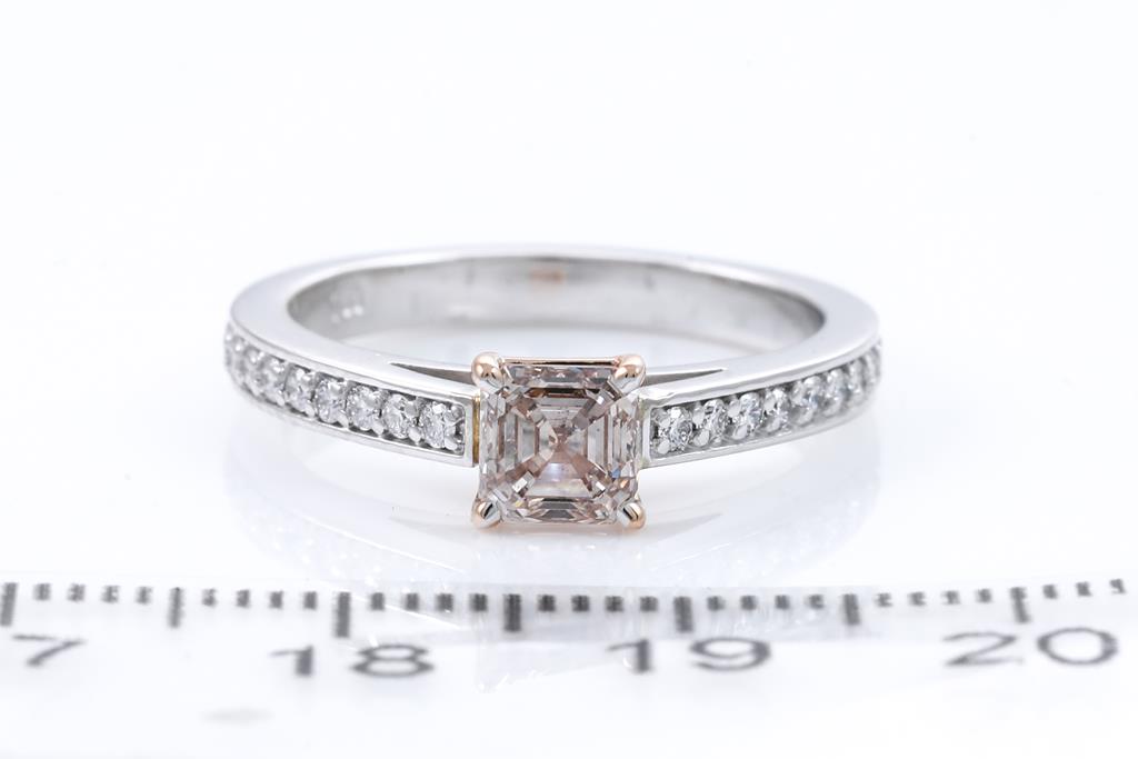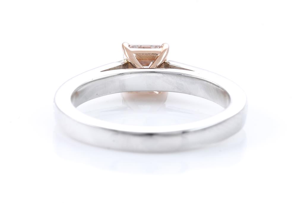 Diamond ring with centre square emerald cut Diamond of 0.72ct (with GIA report graded as Natural Fancy Pink-Brown Even SI2 #2426268267) and shoulder Diamonds totalling 0.18cts. 18ct rose and white gold. Ring size: M. Weight: 4.8g. (New)