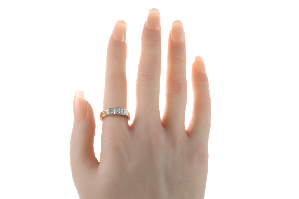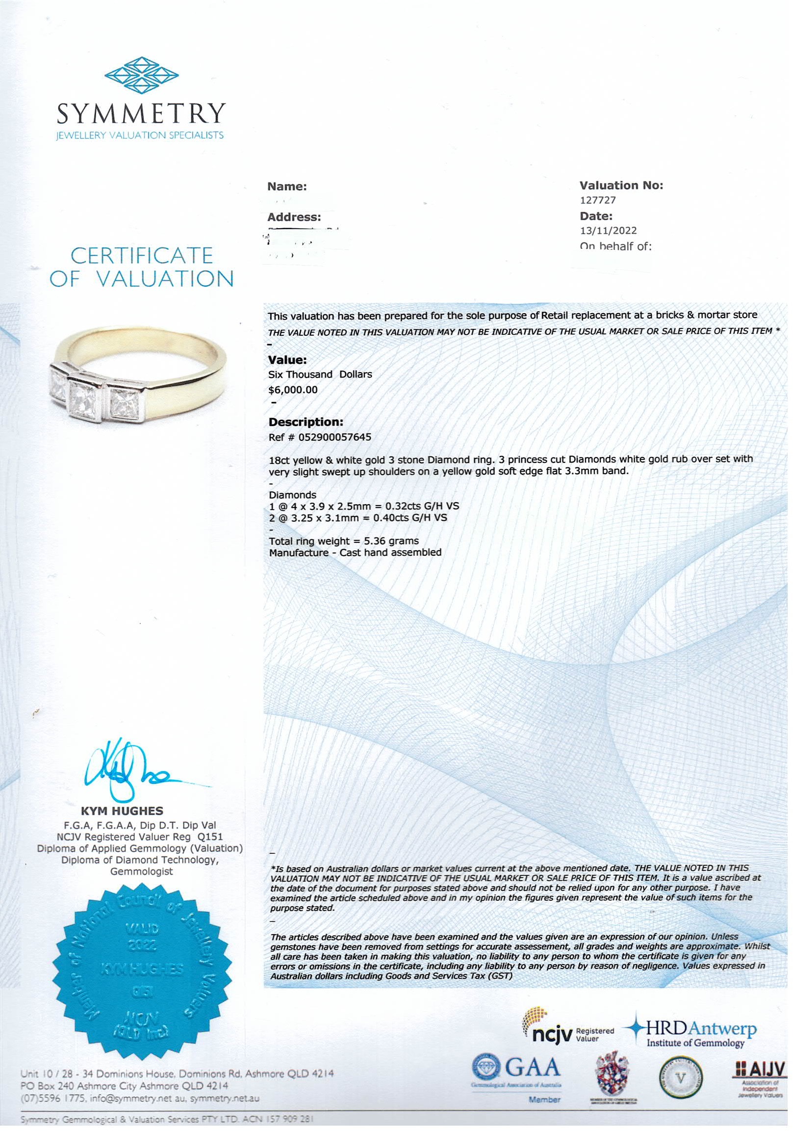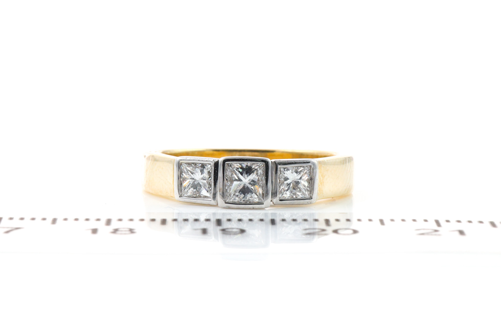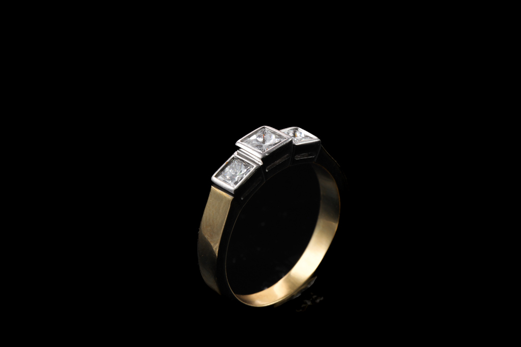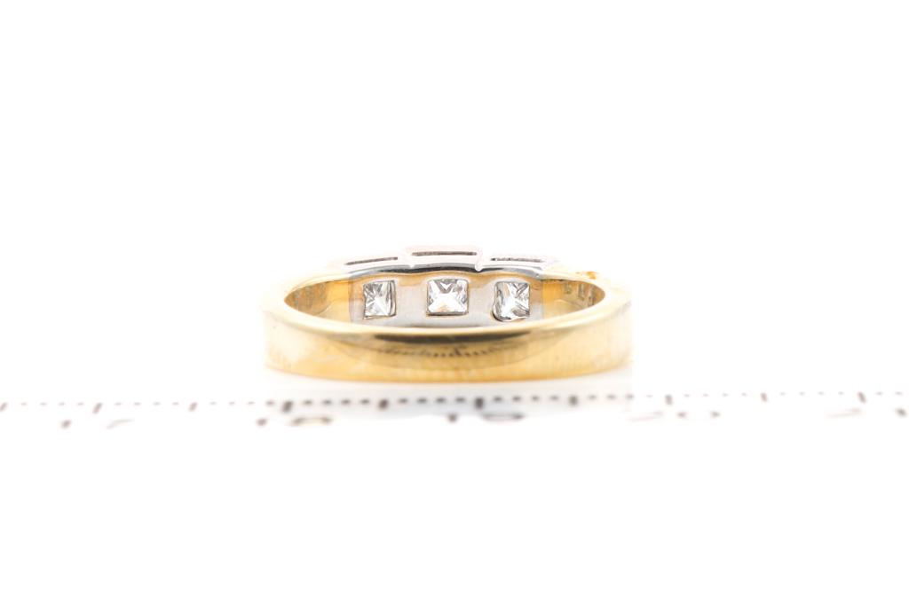 Diamond dress ring with 3 princess cut Diamonds of 0.72ct (Estimated grading: G-H VS). 18ct yellow and white gold. Ring size N. Weight: 5.4g. With Valuation Certificate #052900057645. (Pre-owned)