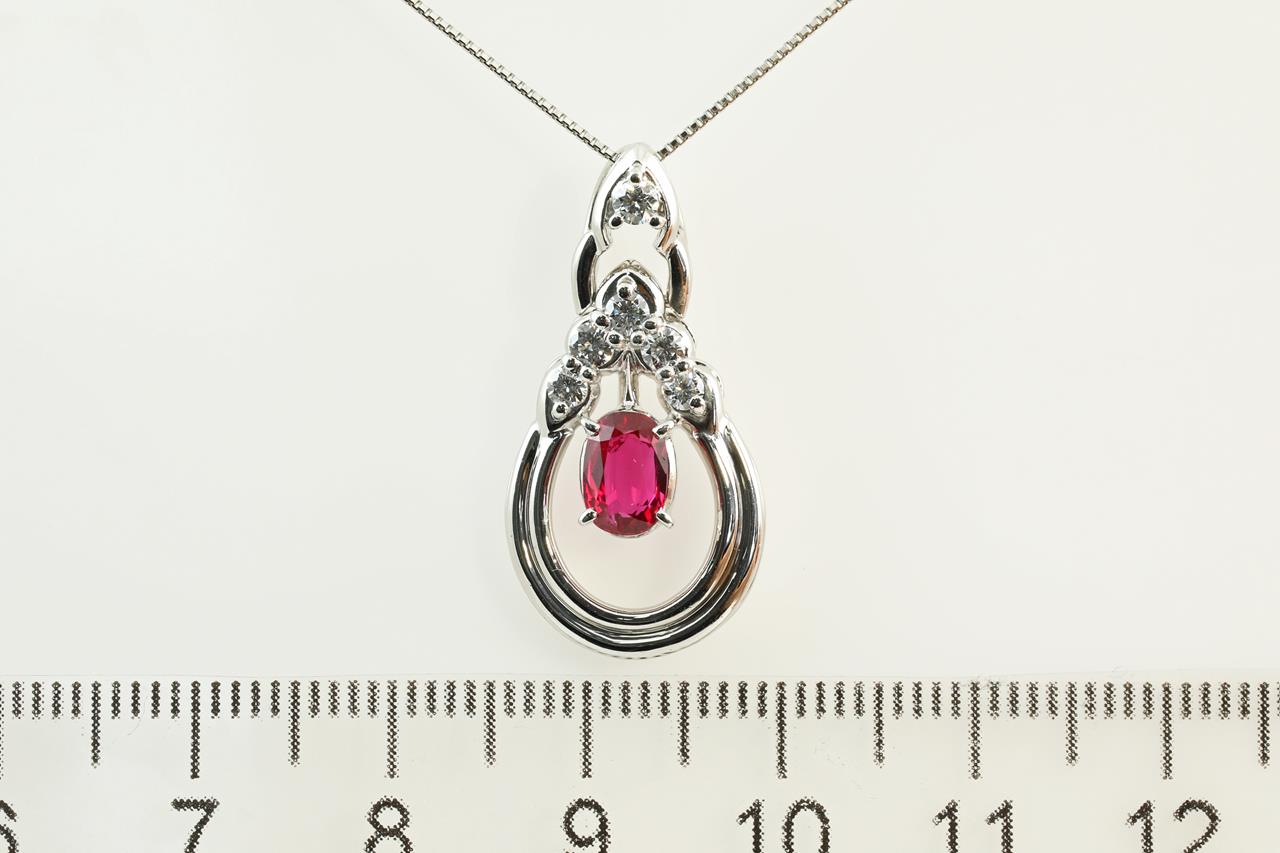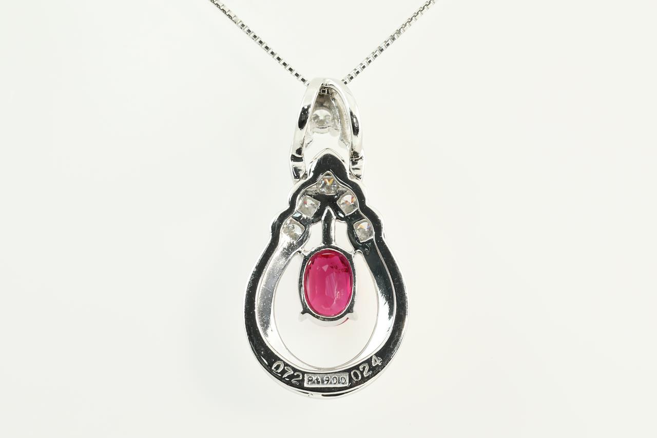 Ruby and Diamond pendant with oval shape Ruby of 0.72ct and Diamonds totalling 0.24cts (Estimated grading: G-H VS). Platinum with platinum 40cm chain. Weight: 6.2g (Pre-owned)