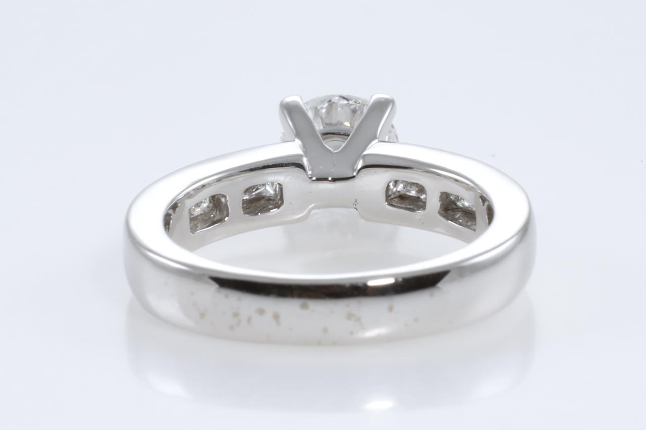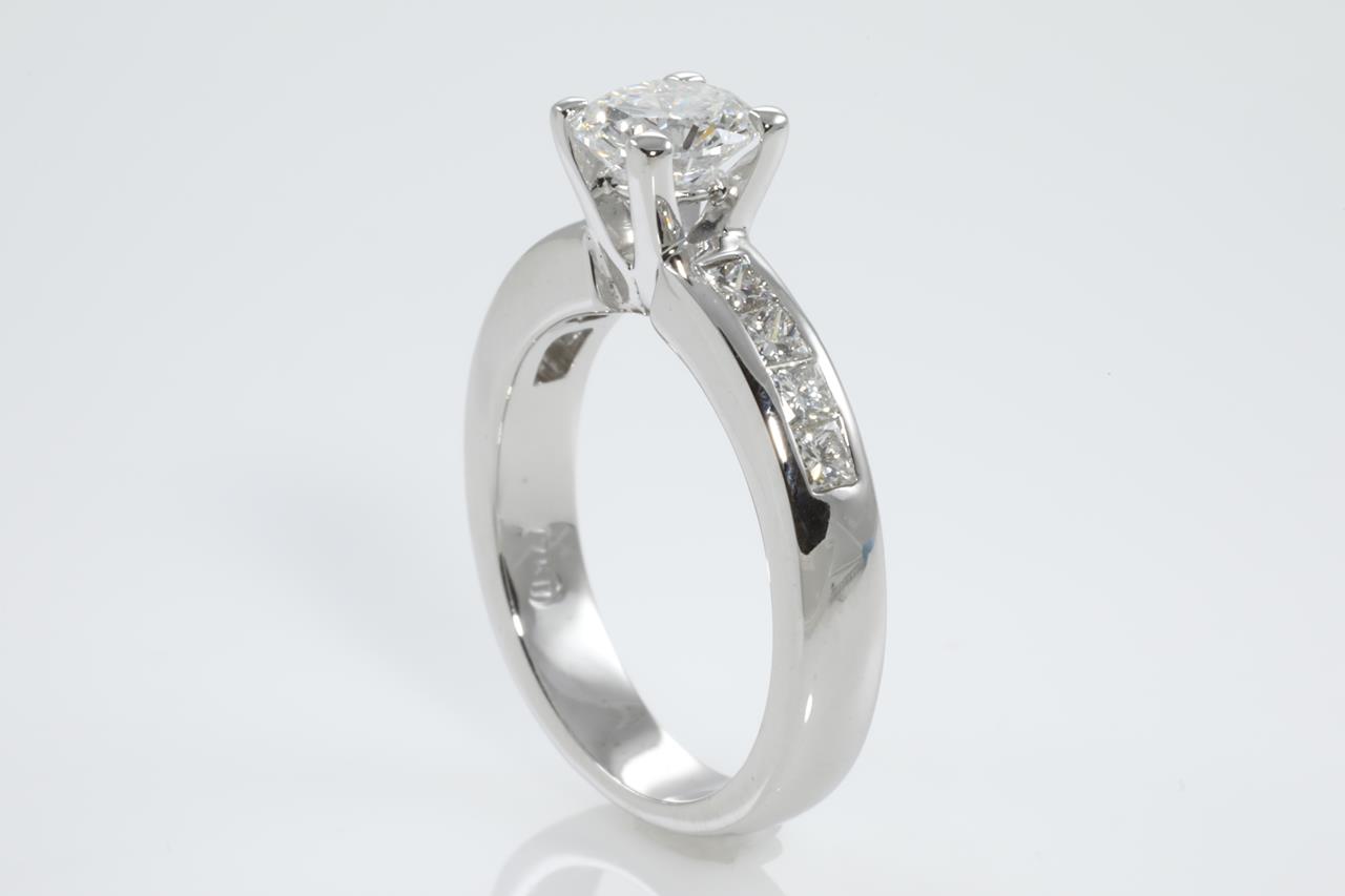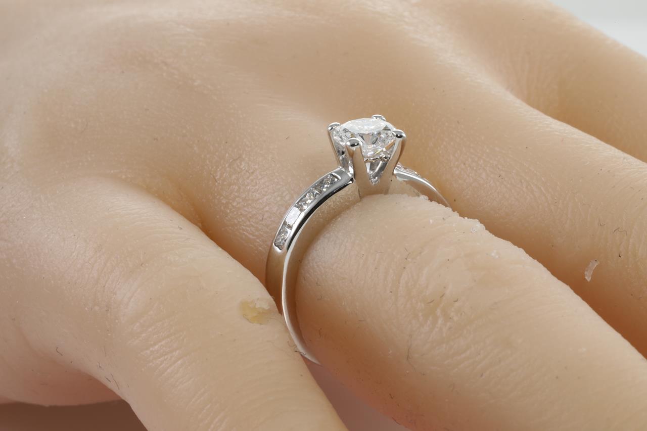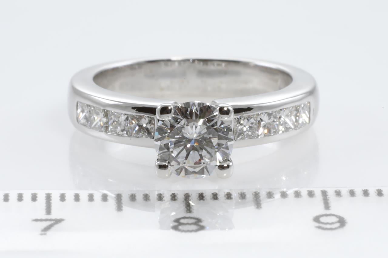 Diamond ring with centre Round Brilliant cut Diamond of 0.73ct (with copy of GIA report check page graded as D SI2 #13625591) and remaining princess cut Diamonds totalling approximately 0.30cts. 18ct white gold. Ring size H1/2. Weight: 5.6g (Pre-owned)