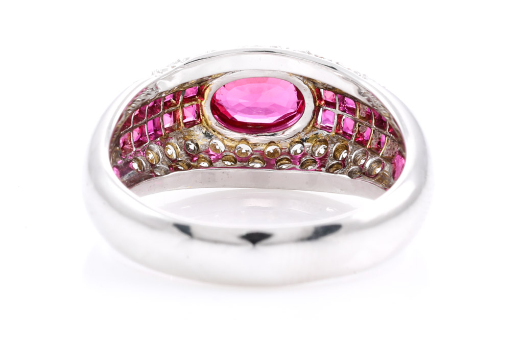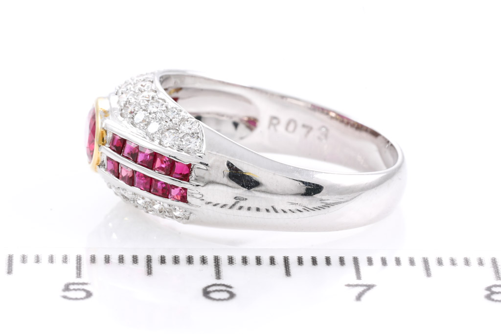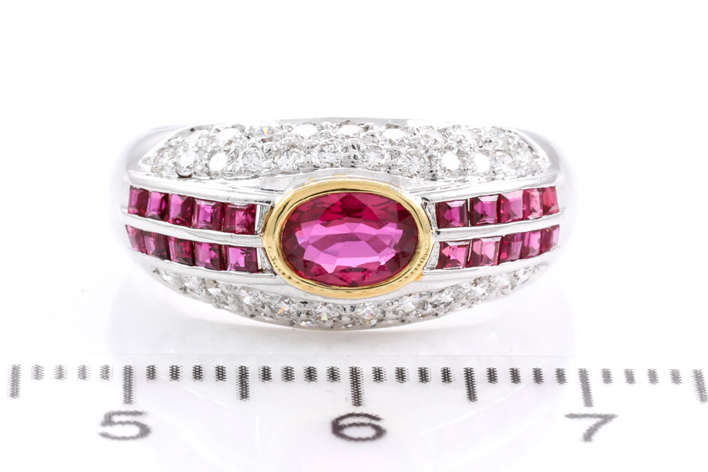 Ruby and Diamond ring with a centre oval shape Ruby of 0.73ct, carre cut Rubies totalling 0.64cts and round Diamonds totalling 0.59cts (Estimated grading: H SI). 18ct white gold. Ring size O1/2 - ring resizing is not recommended. Weight: 6.7g. (Pre-owned)