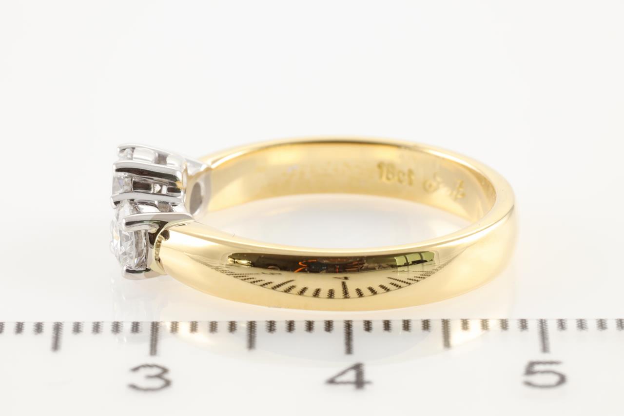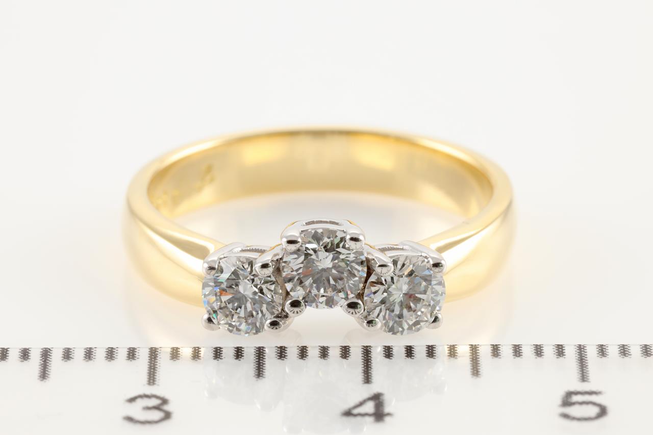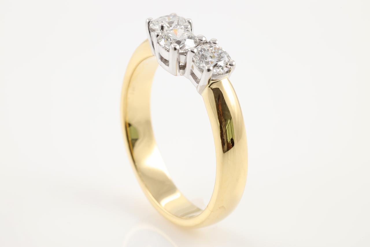 Diamond ring with 3 round Diamonds totalling 0.73cts (Estimated grading: F VS-SI). 18ct yellow and white gold. With valuation dated 16/12/2015. Ring size L. Weight: 4.7g. (Pre-owned)