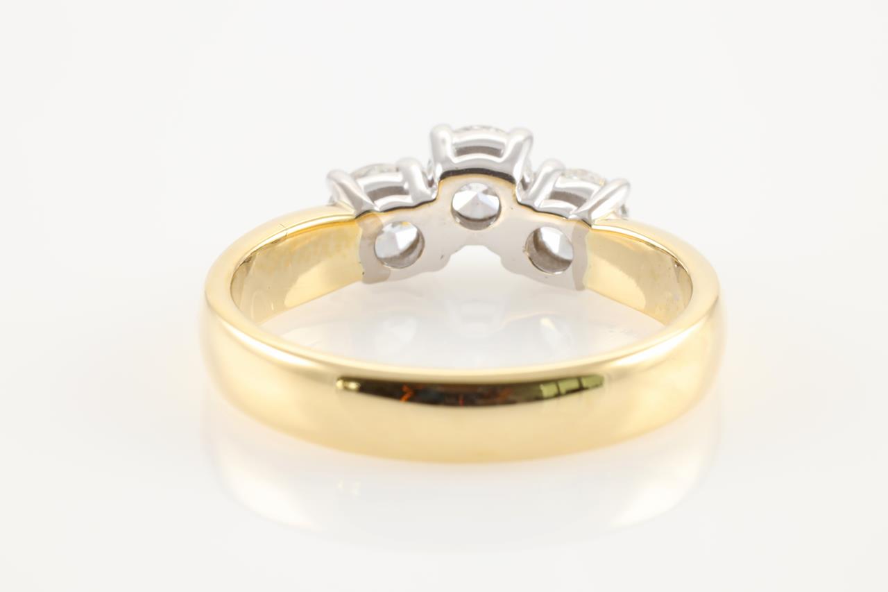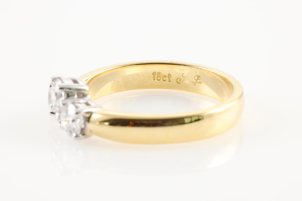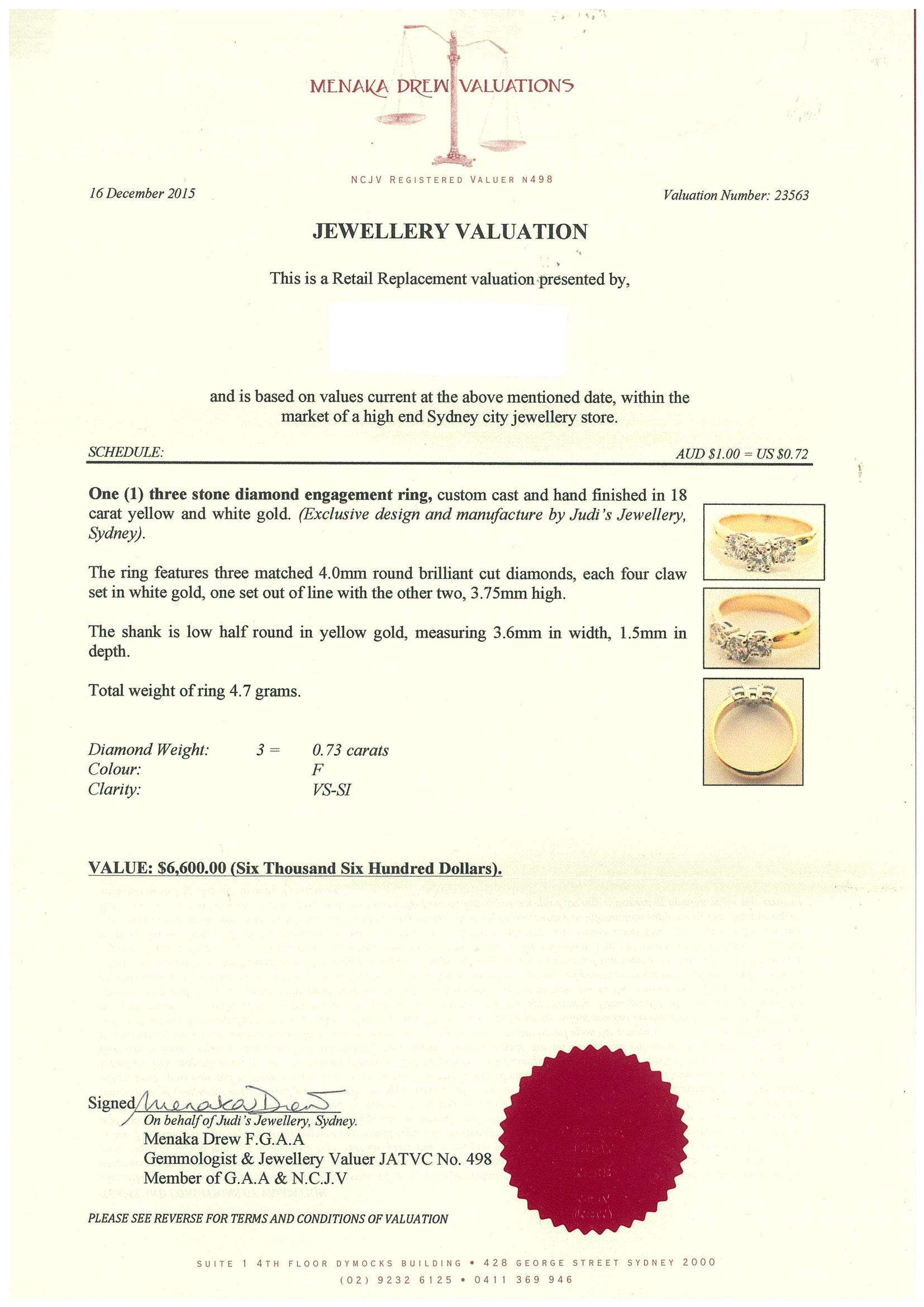 Diamond ring with 3 round Diamonds totalling 0.73cts (Estimated grading: F VS-SI). 18ct yellow and white gold. With valuation dated 16/12/2015. Ring size L. Weight: 4.7g. (Pre-owned)