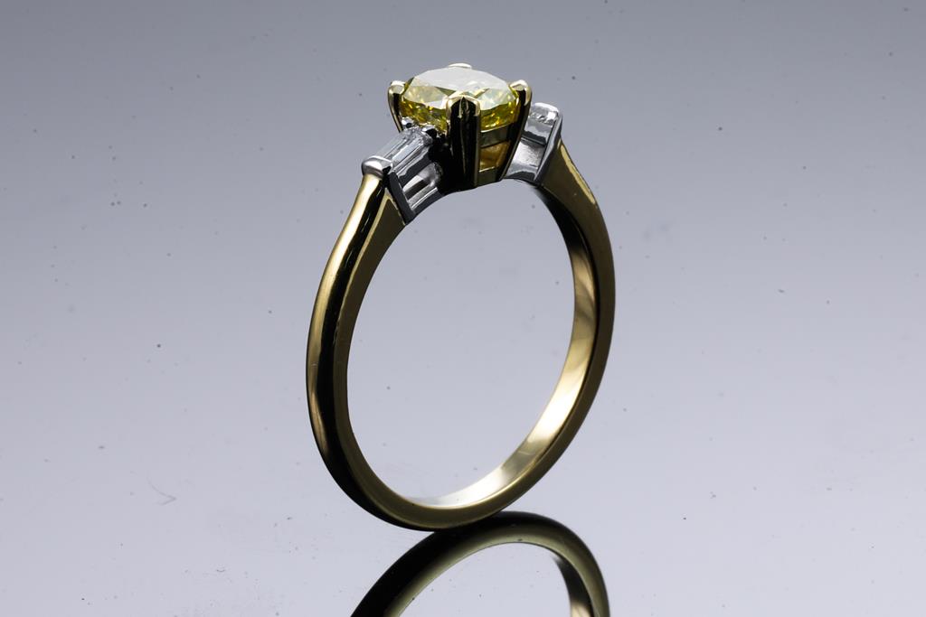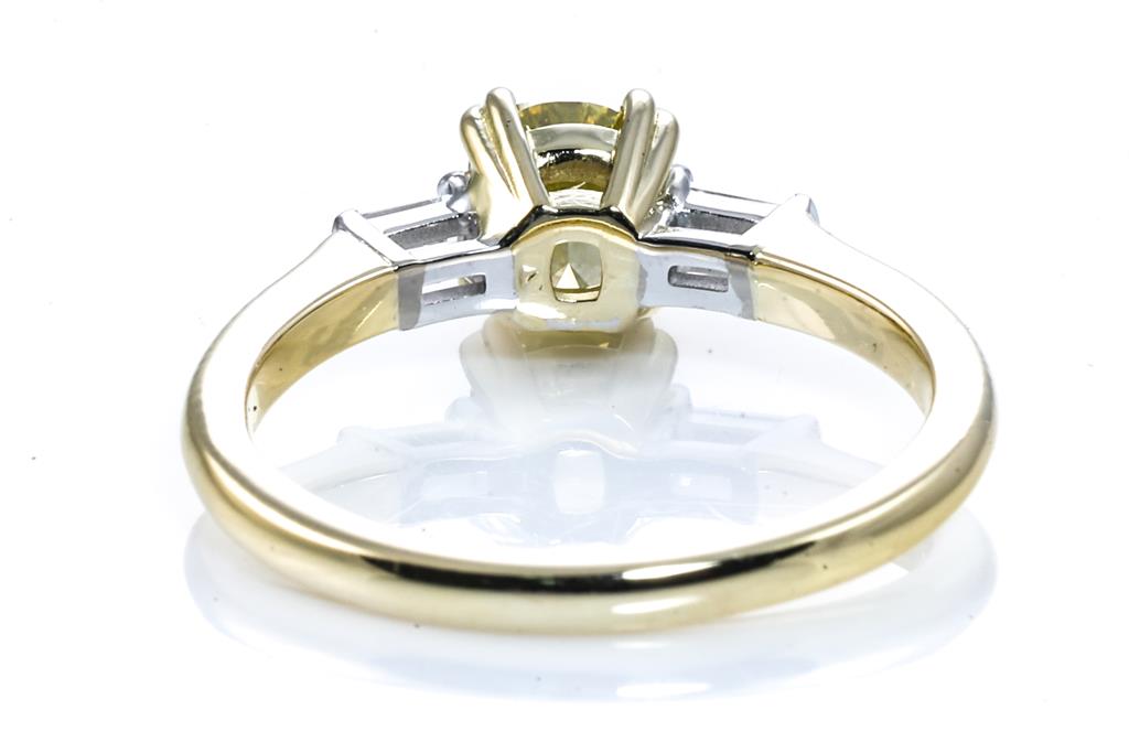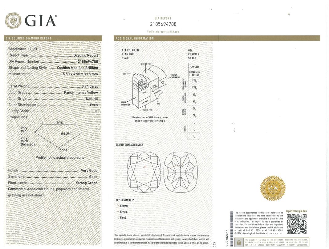Diamond ring with centre cushion cut Diamond of 0.74ct (with GIA report graded as Natural Fancy Intense Yellow Even#2185694788. FSA Estimated clarity grade: P1) and 2 baguette cut Diamonds totalling 0.10cts. 18ct yellow and white gold. Ring Size K. Weight 3.2g (New)
