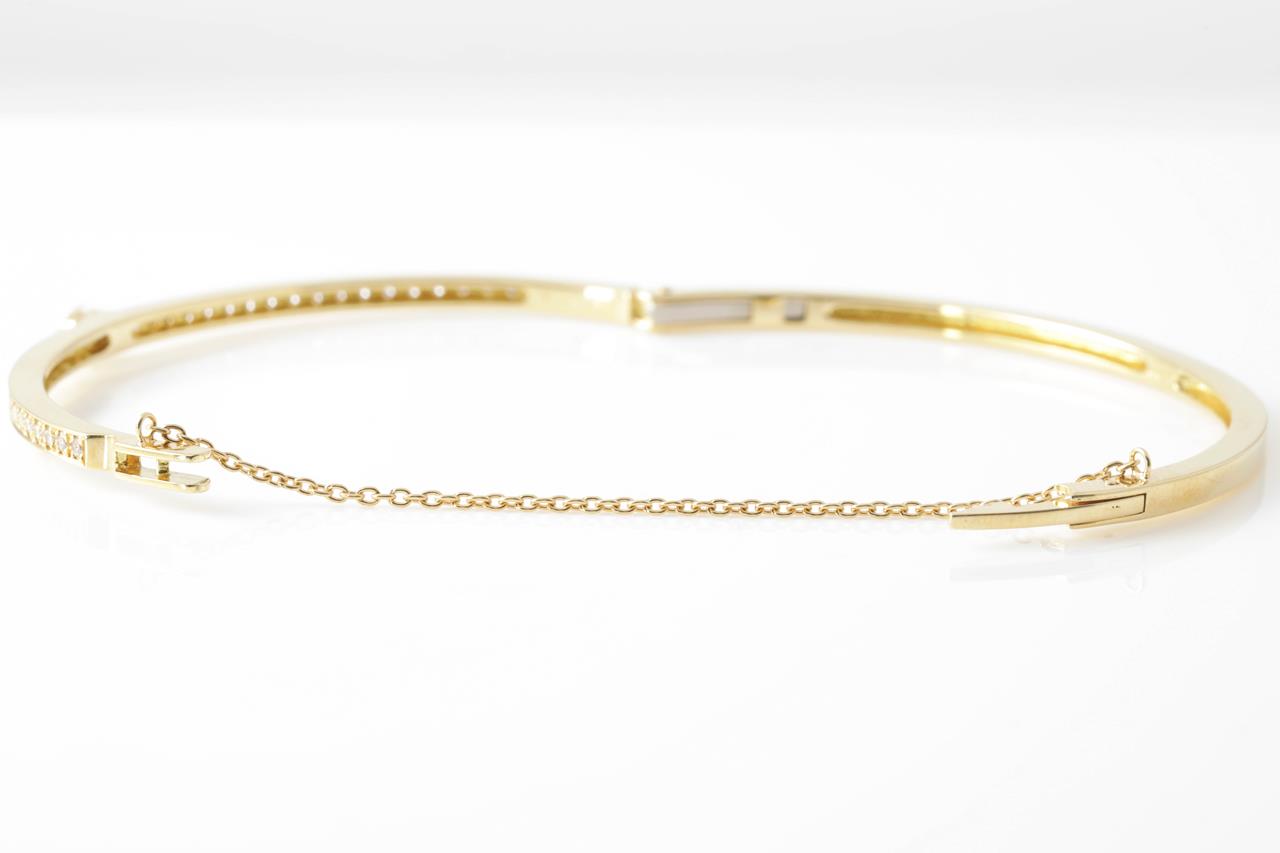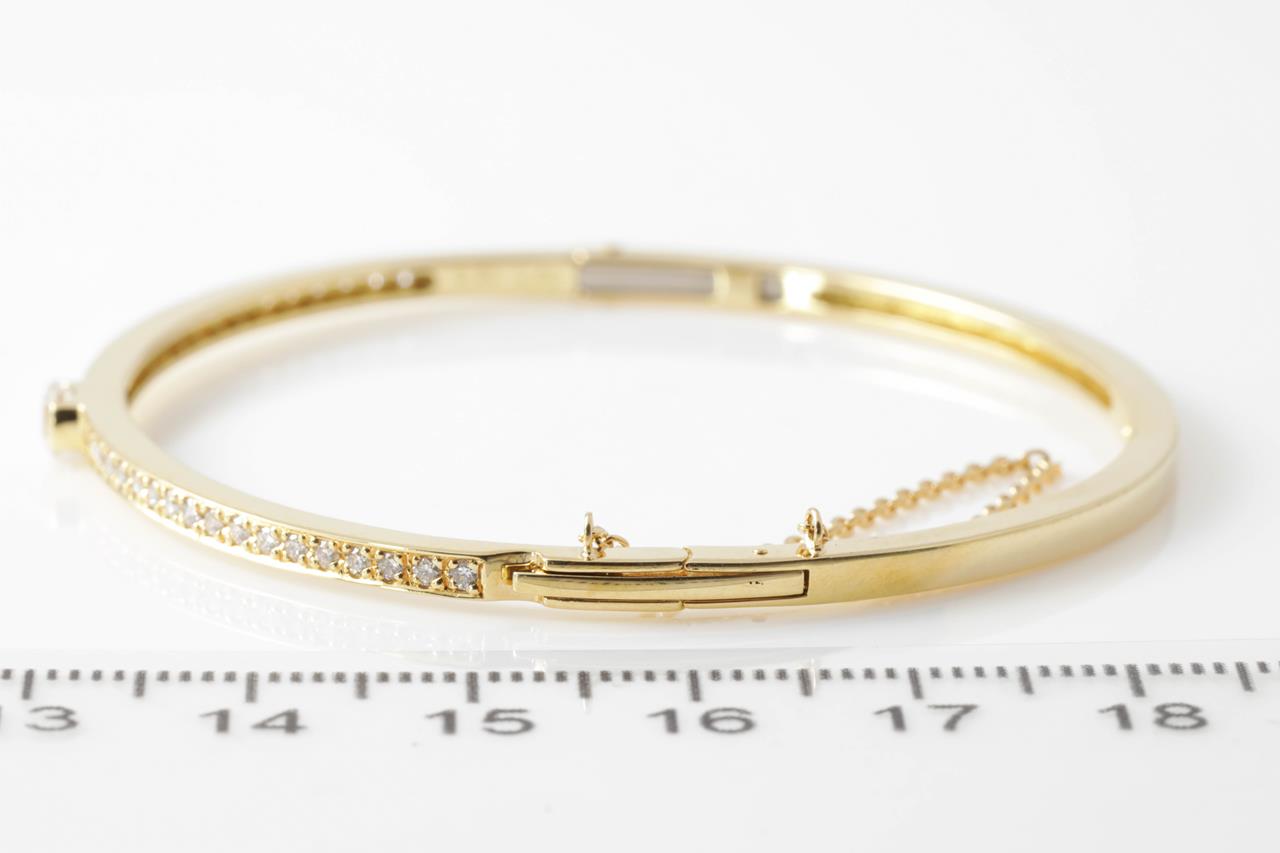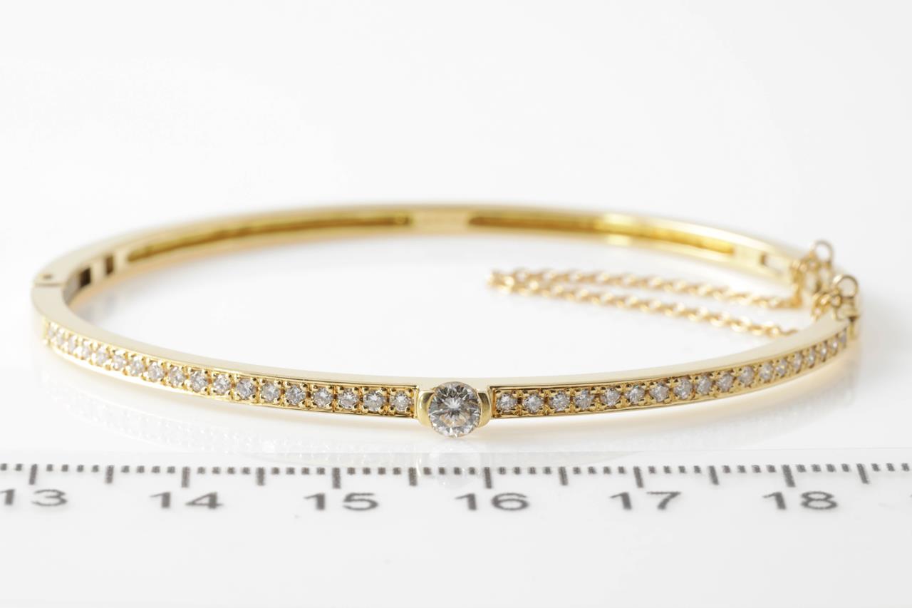 Diamond bangle with a centre round Diamond of 0.25ct (Estimated grading: H VS ) and remaining Diamonds totalling 0.50cts (Estimated grading: H SI). 18ct yellow gold. Circumference 16cm. Weight: 12.6g. (Pre-owned)