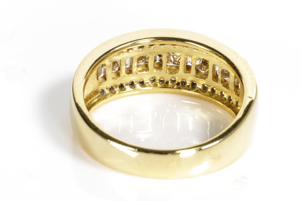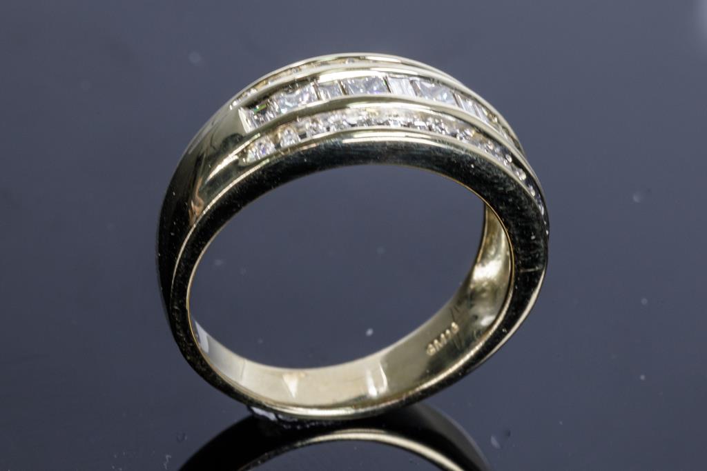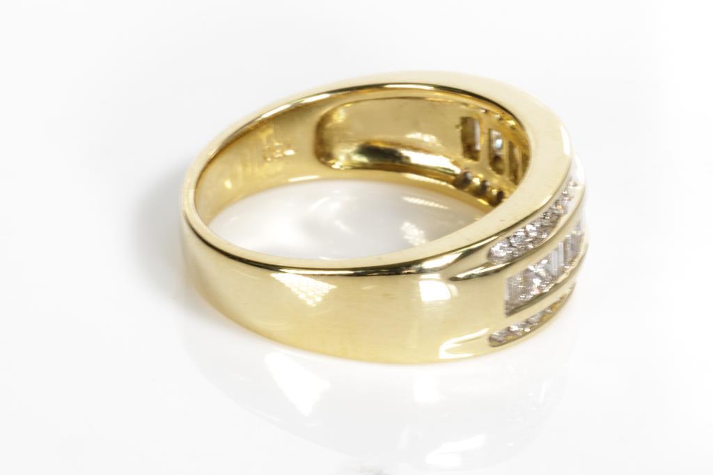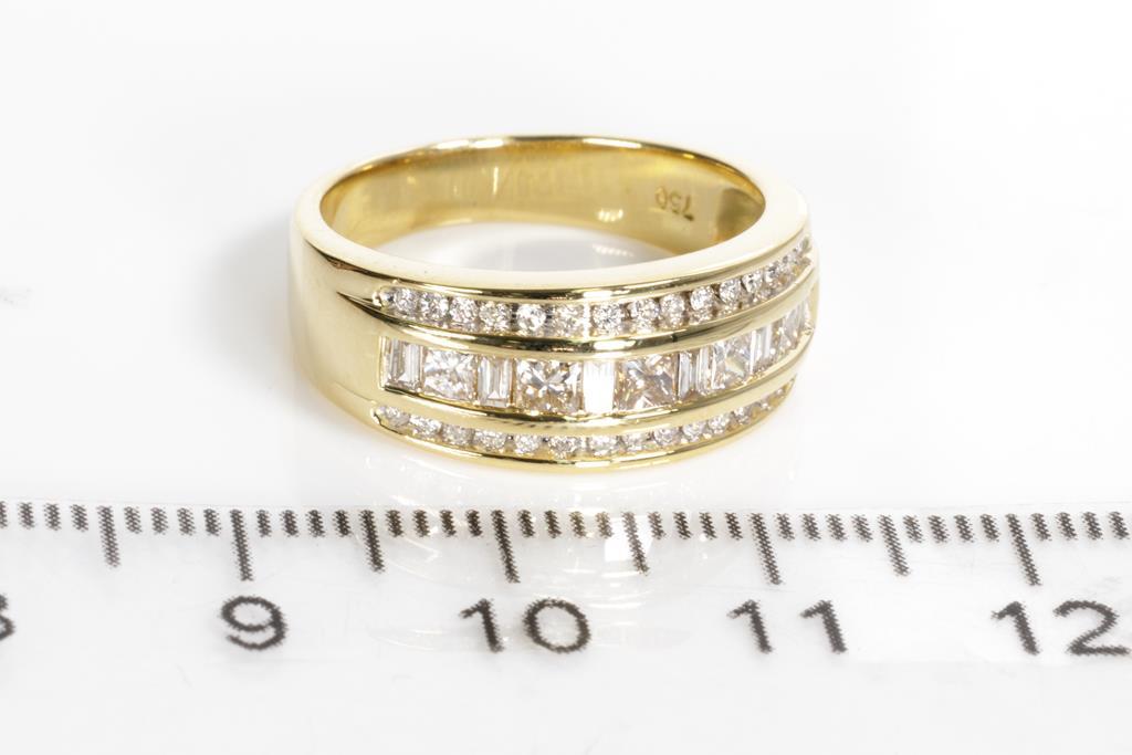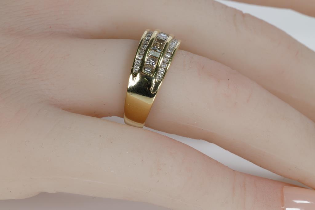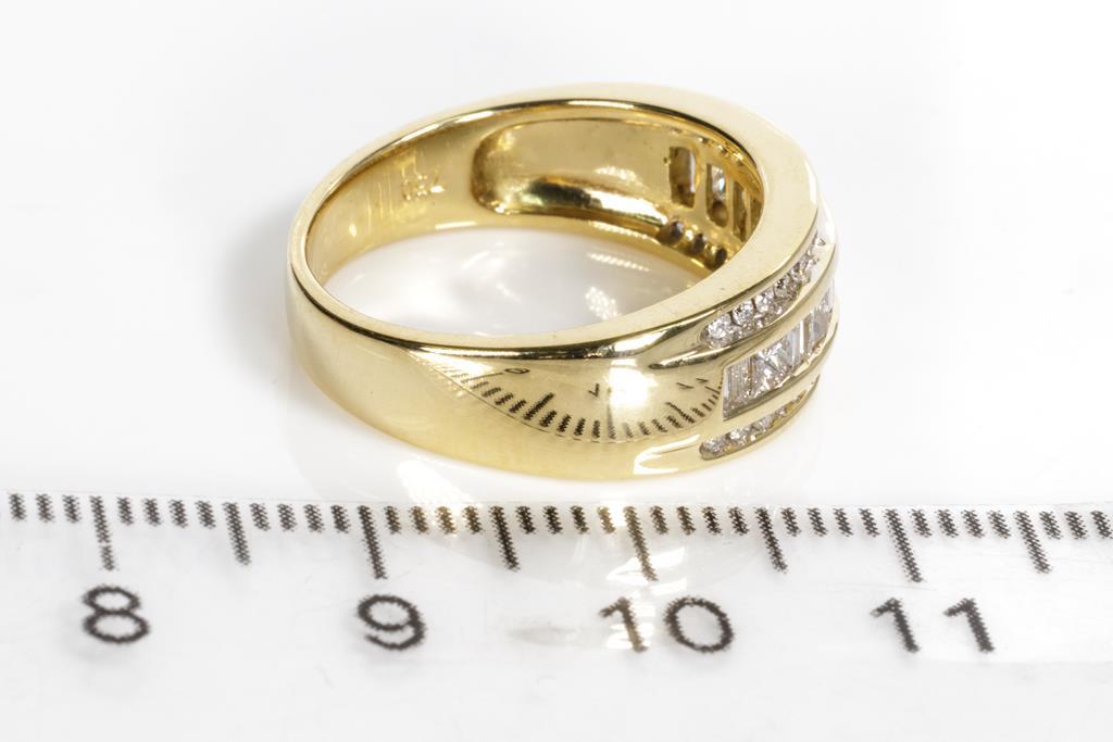 Diamond dress ring with princess and baguette cut Diamonds totalling approximately 0.75cts (Estimated grading I-K SI-P1-2). 18ct yellow gold. Ring size N. Weight 6.5g. With Valuation. (Pre-owned)