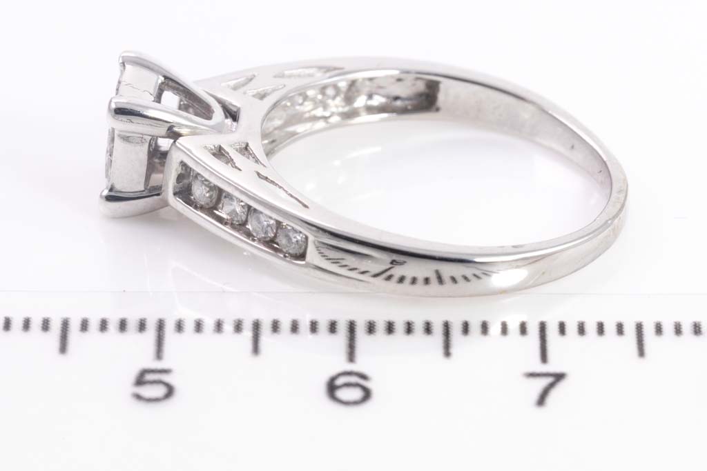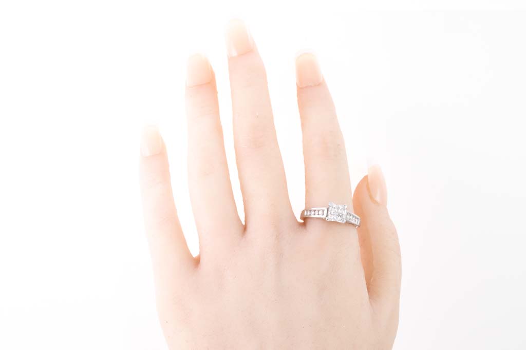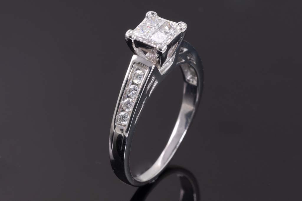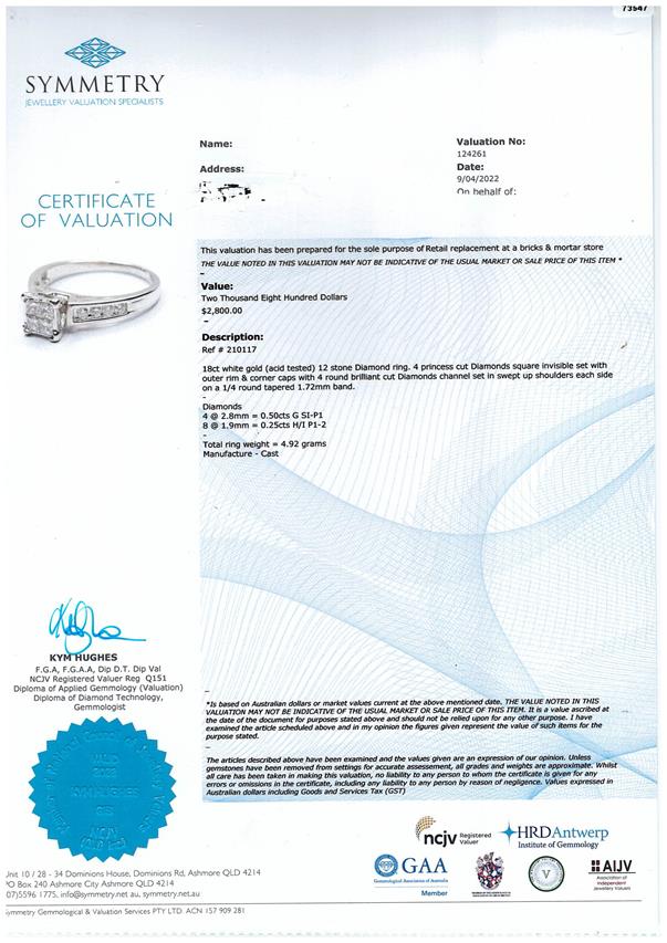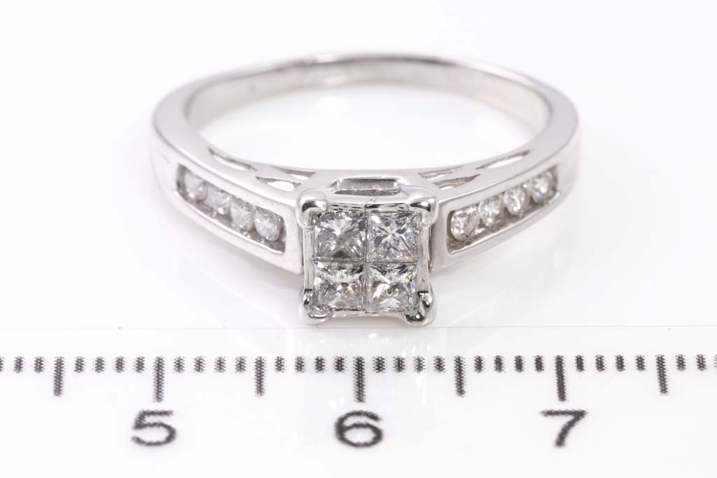 Diamond dress ring with 4 invisible set princess cut Diamonds totalling 0.50cts (Estimated grading: G SI-P1) and shoulder round Diamonds totalling 0.25cts. 18ct white gold. Ring size R. Weight: 4.9g. With Valuation Certificate Ref #024000210119. (Pre-owned)