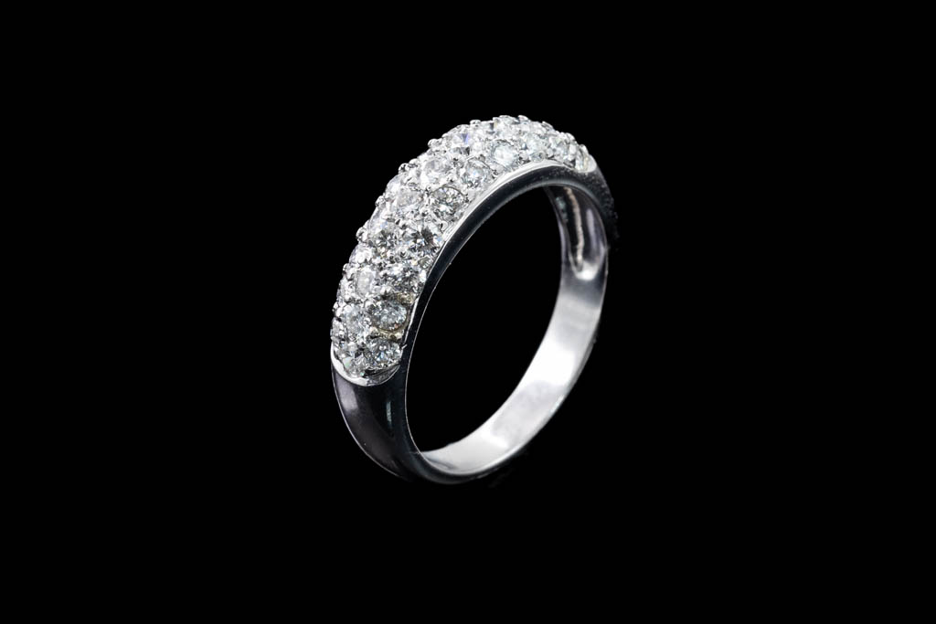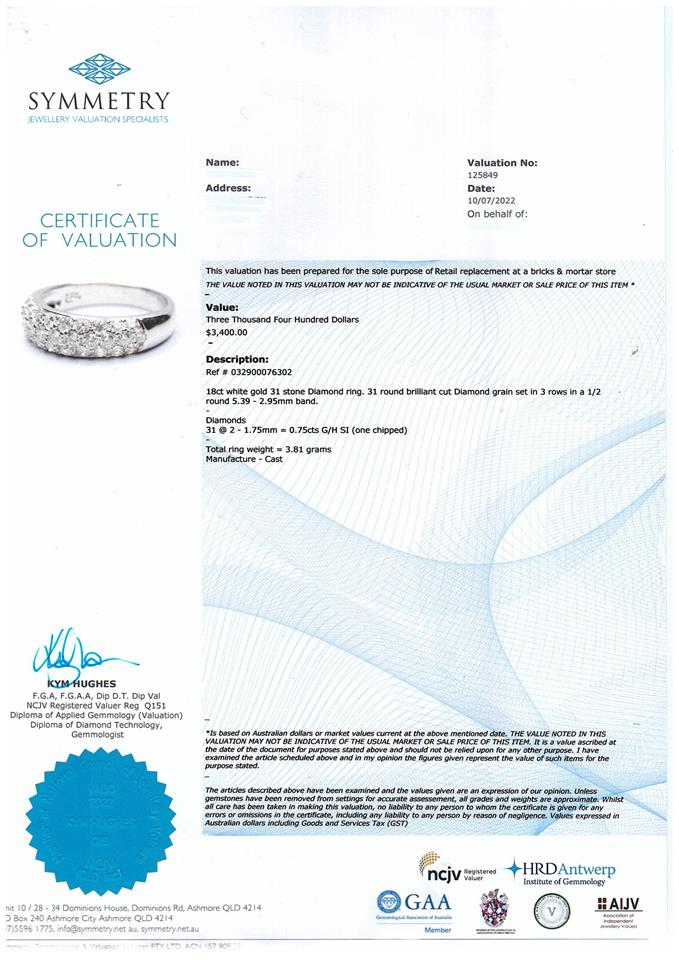 Diamond Dress ring with round Diamonds totalling 0.75ct (Estimated grading: G-H SI). 18ct white gold. Ring size L 1/2. Weight: 3.8g With Valuation Certificate #032900076302.
