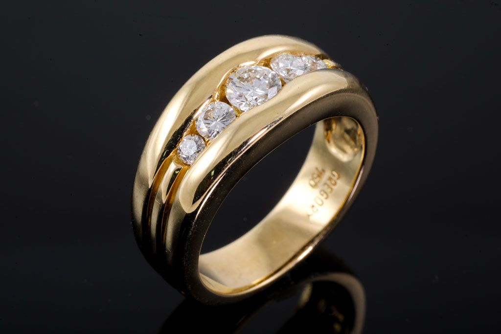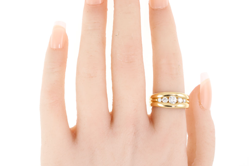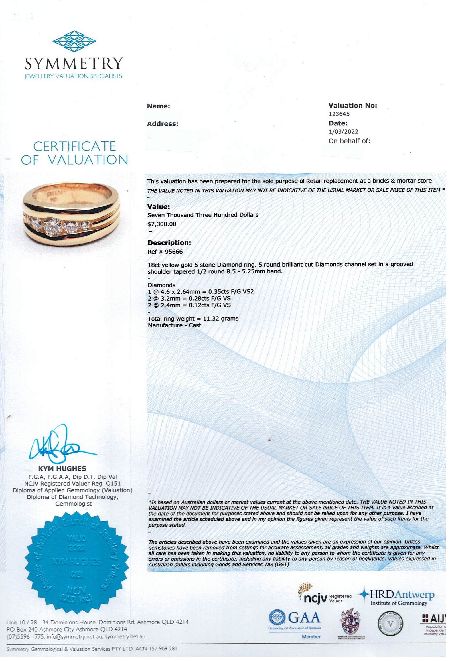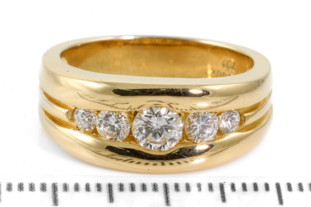 Diamond Dress ring with 5 round brilliant cut Diamonds of 0.75cts (Estimated grading: F-G VS2). 18ct yellow gold. Ring size: N. Weight: 11.3g. With Valuation Certificate (Reference #023900095666). (Pre-owned)