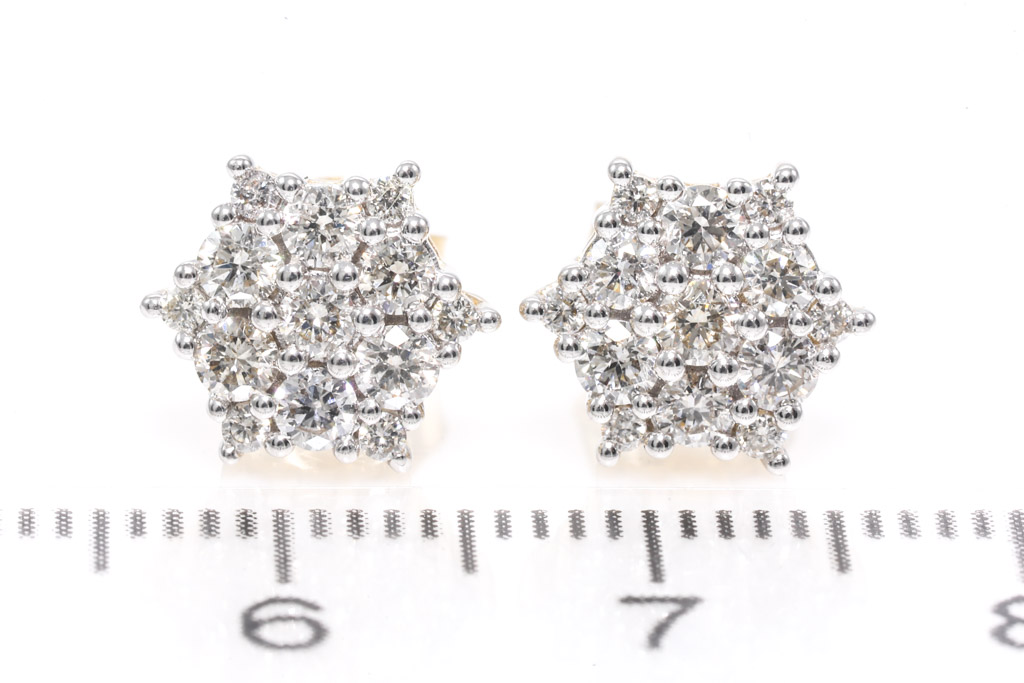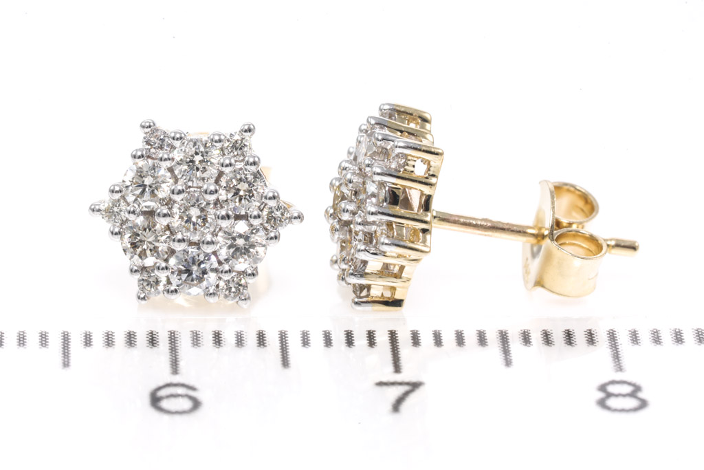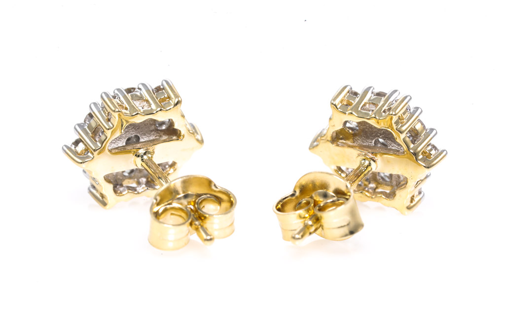 Diamond earrings with 26 round diamonds totalling 0.75cts. (Estimated grading: H SI). 14ct yellow gold with rhodium plated claws. Weight: 2.4g. (New)