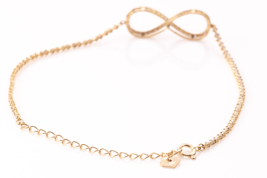 Diamond infinity bracelet with round Diamonds totalling 0.75cts (Estimated grading: J P1). 18ct yellow gold. Maximum adjustable length: 21cm. Weight: 2.8g. (Pre-owned)