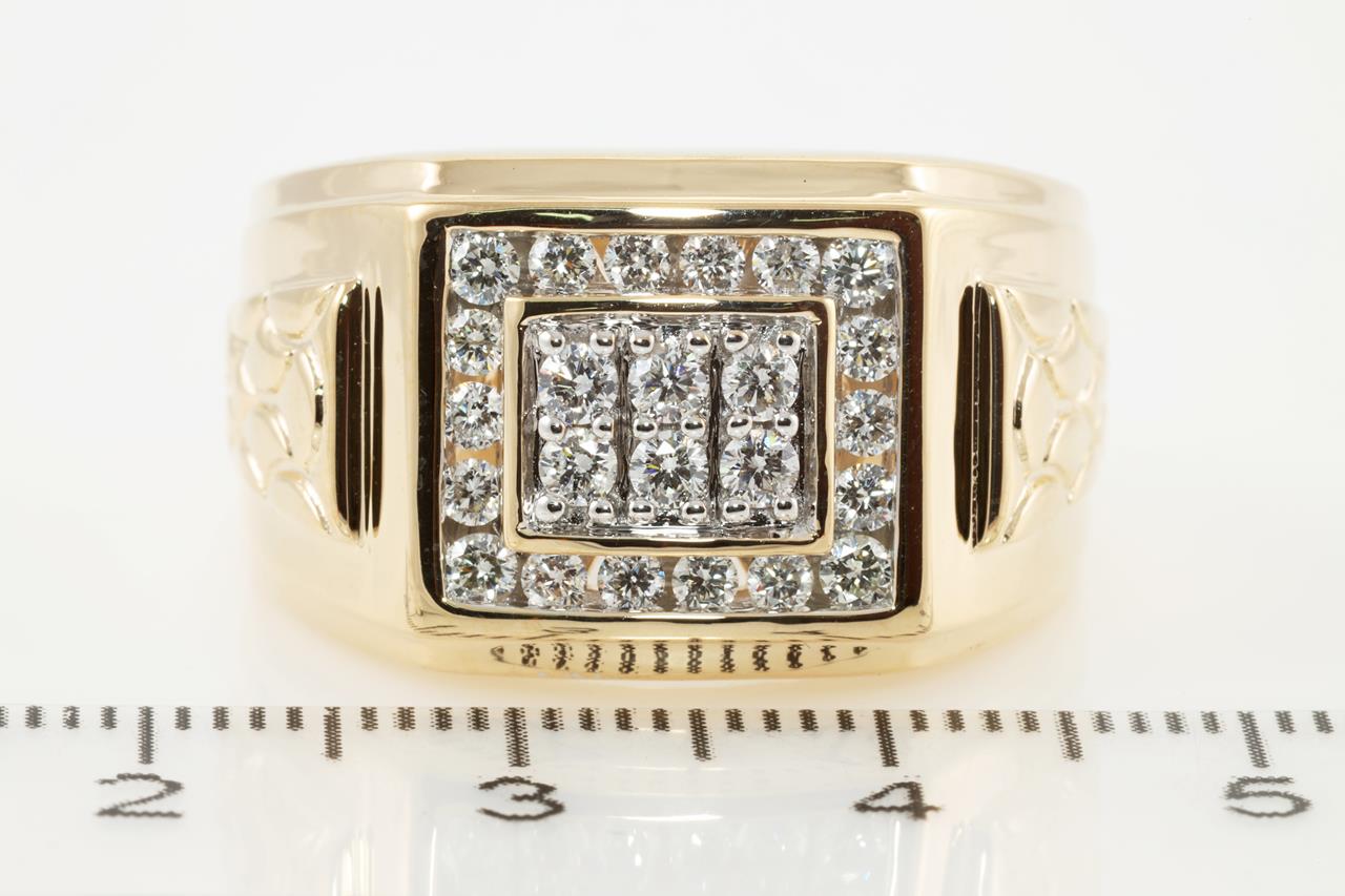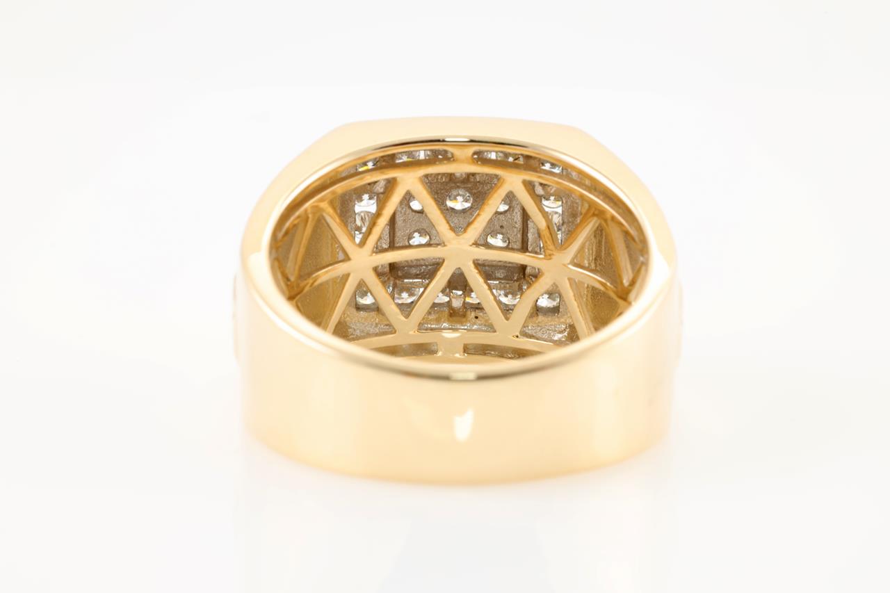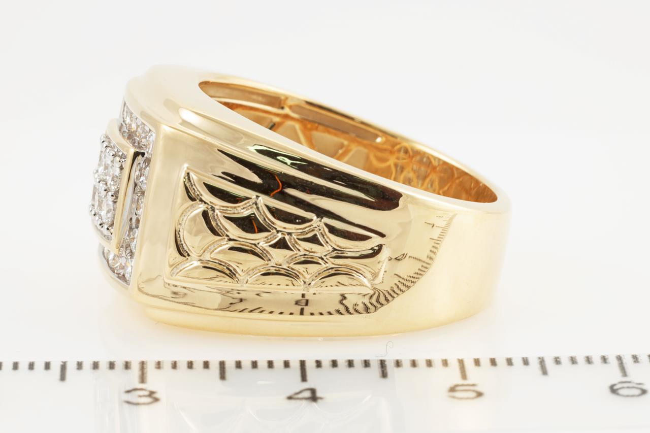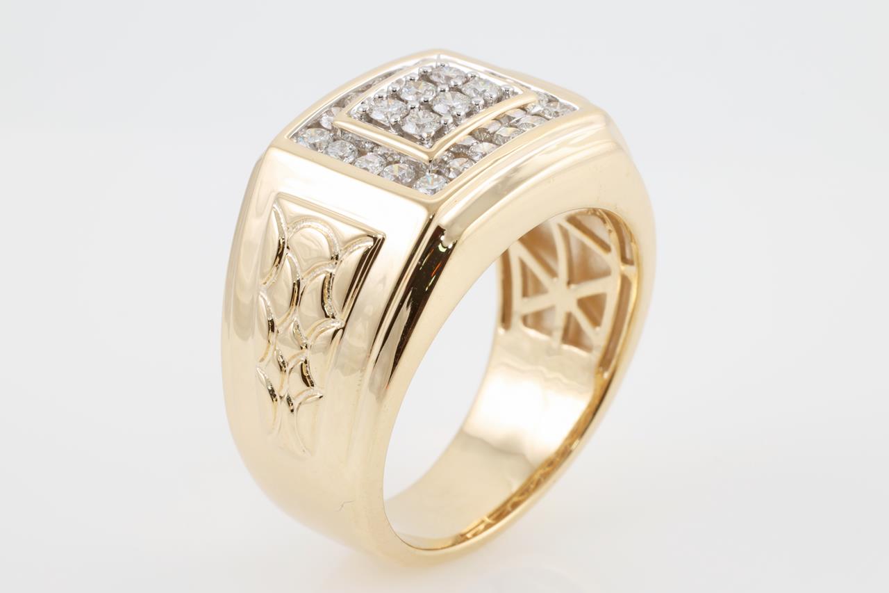 Diamond Mens ring with round Diamonds totalling 0.75cts (Estimated grading: H SI). 9ct Yellow gold. Ring size V. Weight: 14.4g (New)