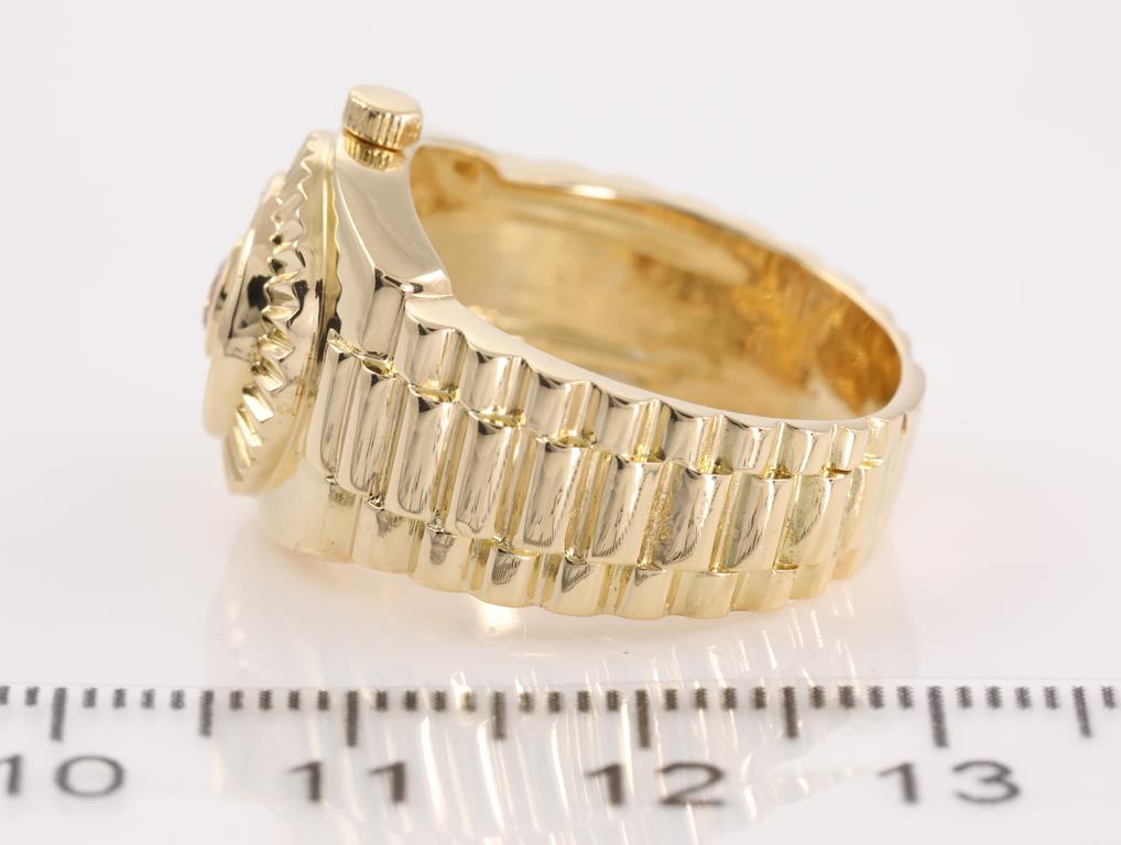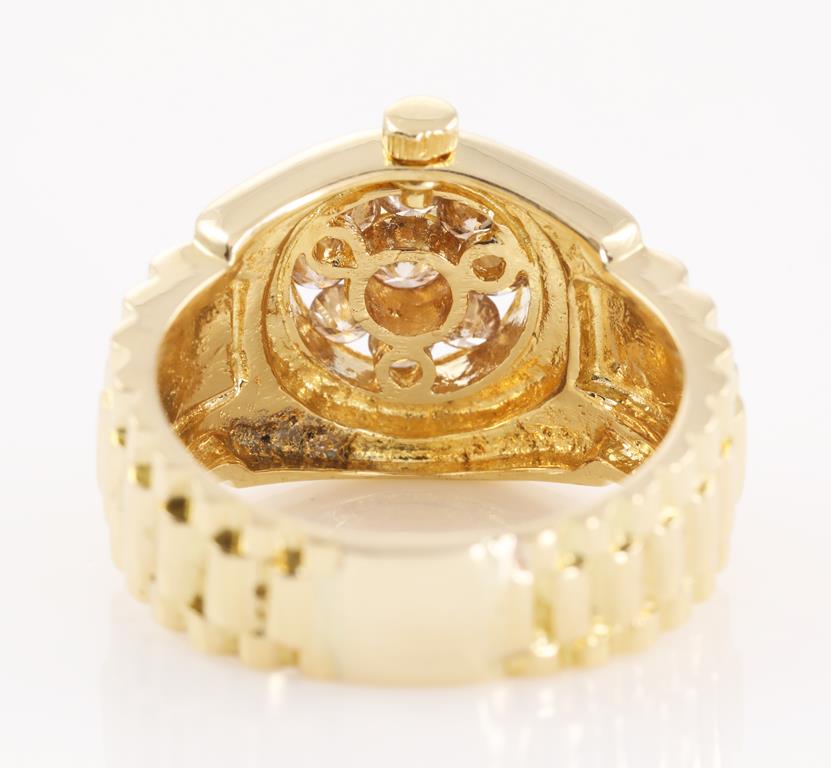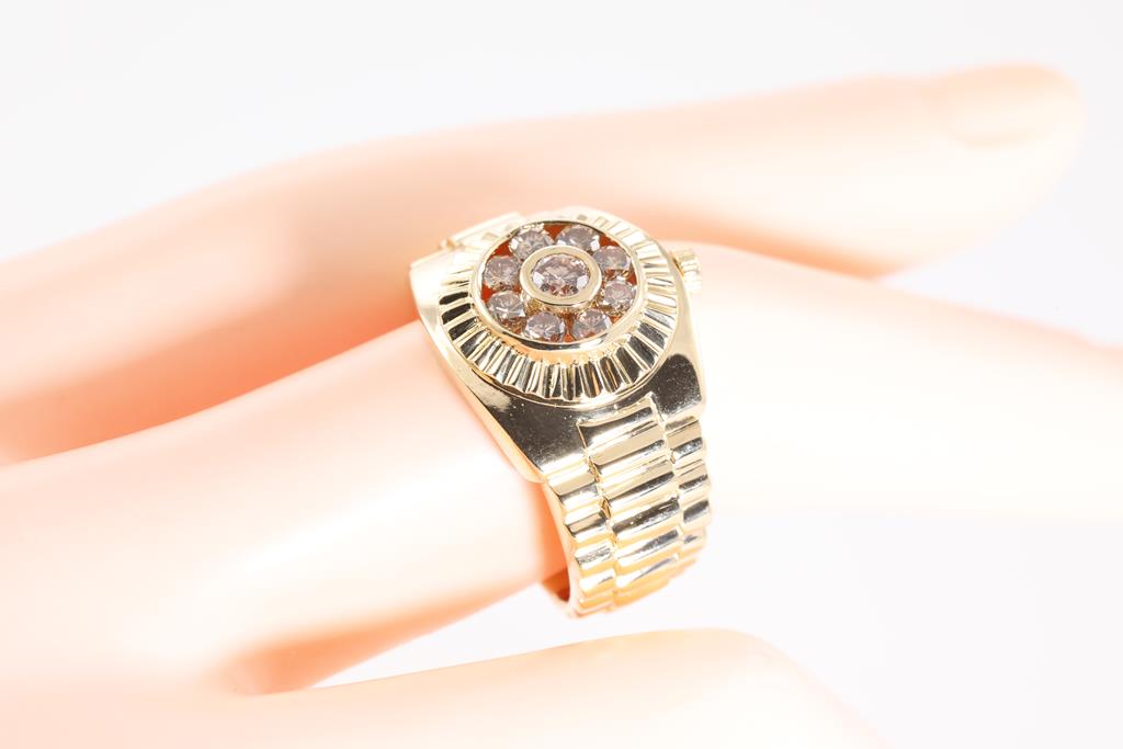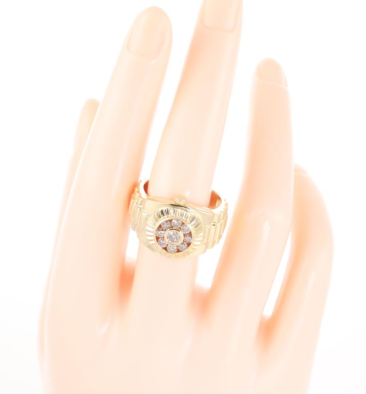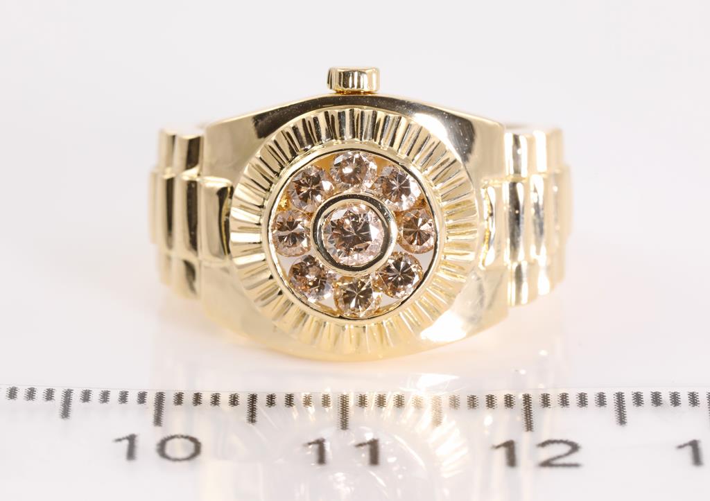Mens ring with round Diamonds totalling 0.75cts (Estimated grading: Natural Champagne SI-P1). 18ct yellow gold. Ring size R. Weight: 13.5g. (Pre-owned)