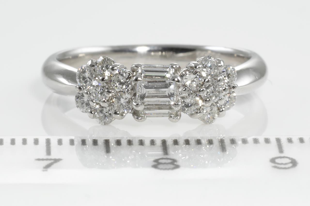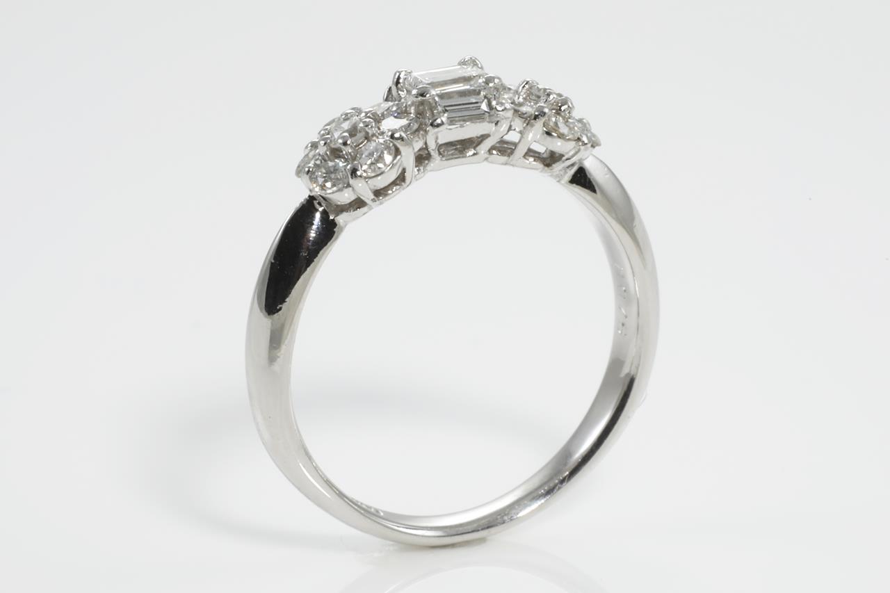 Diamond dress ring with round and baguette cut Diamonds totalling 0.75cts (Estimated grading: G VS-SI). Platinum. Ring size M1/2 - Ring resizing is not recommended. Weight:4.7g (pre-owned)