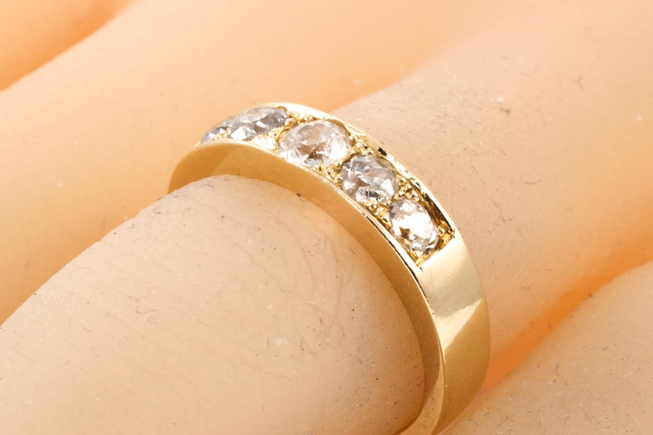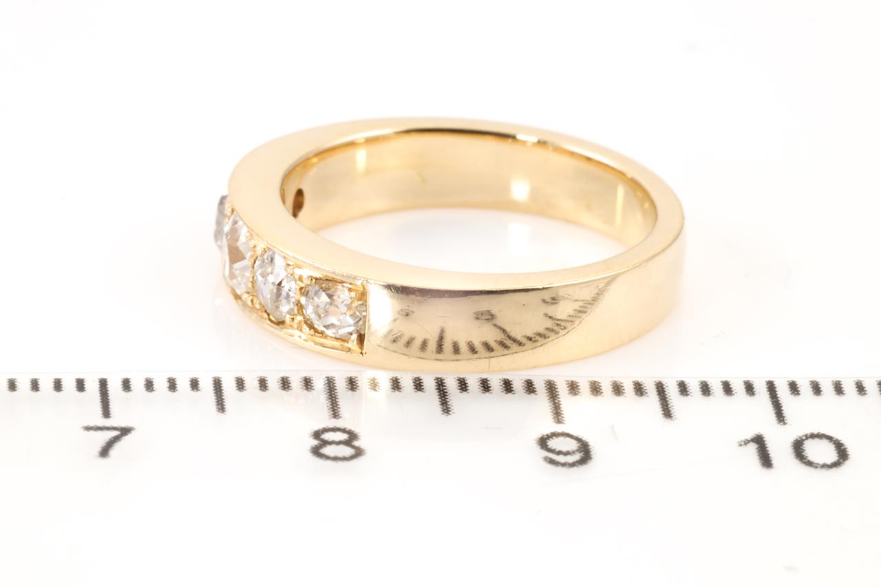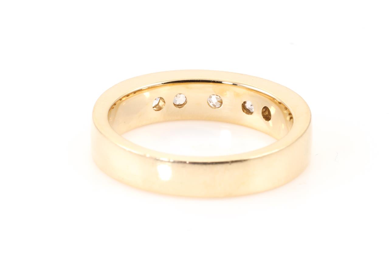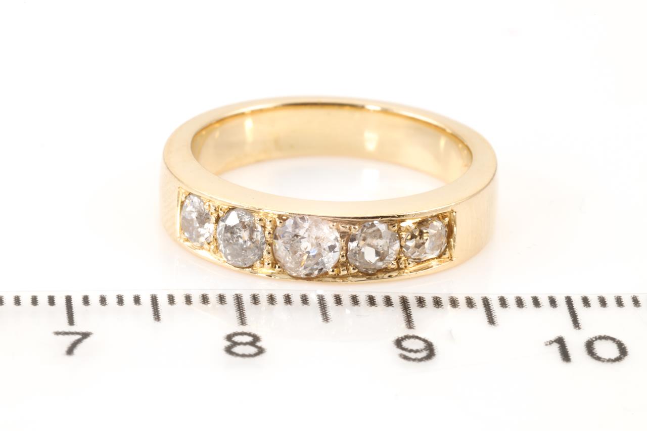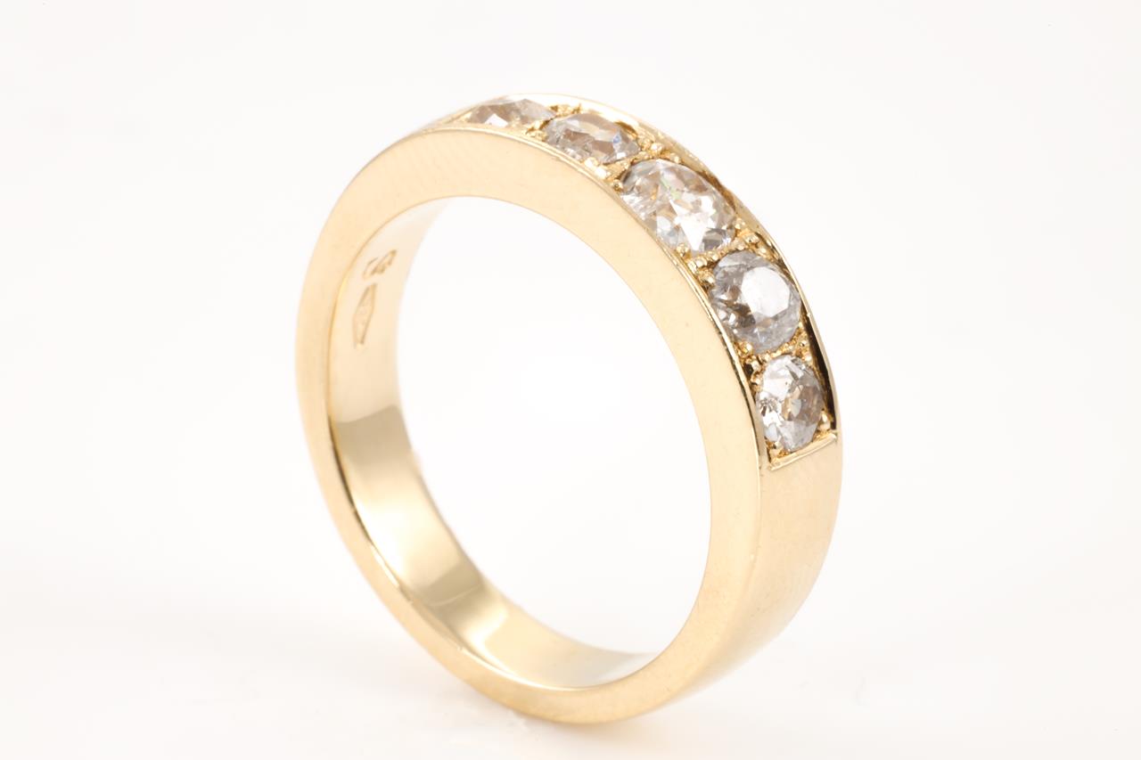 Diamond ring with 5 round Diamonds totalling approximately 0.75cts (Estimated grading: H P3 - one stone chipped). 18ct yellow gold. Ring size N. Weight: 6.5g (Pre-owned)