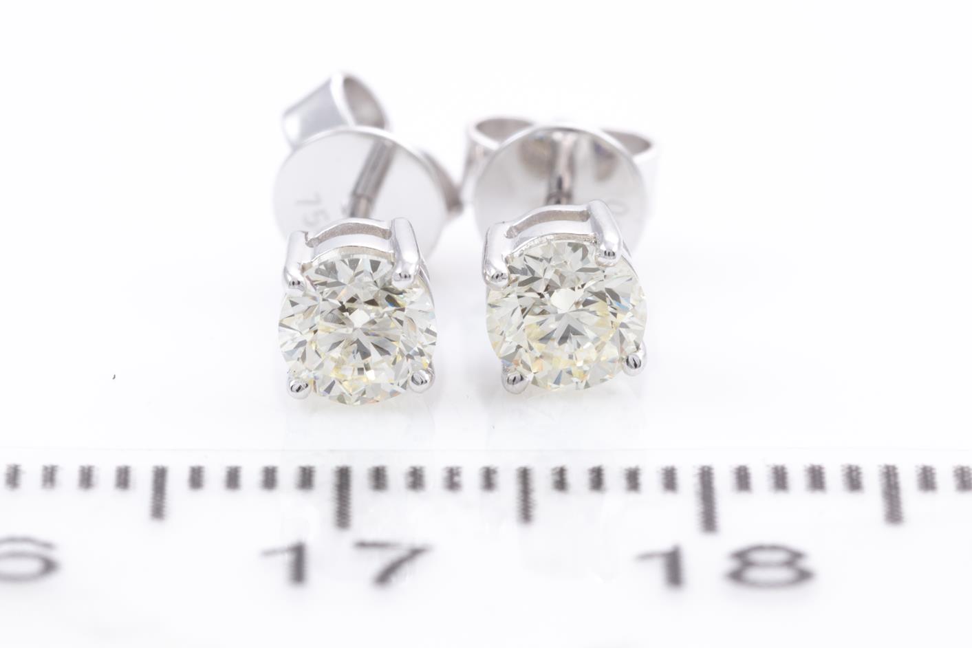 Diamond stud earrings with 2 round Diamonds totalling 0.75cts (Estimated grading: K-L SI). 18ct white gold. Weight: 1.3g. (New)