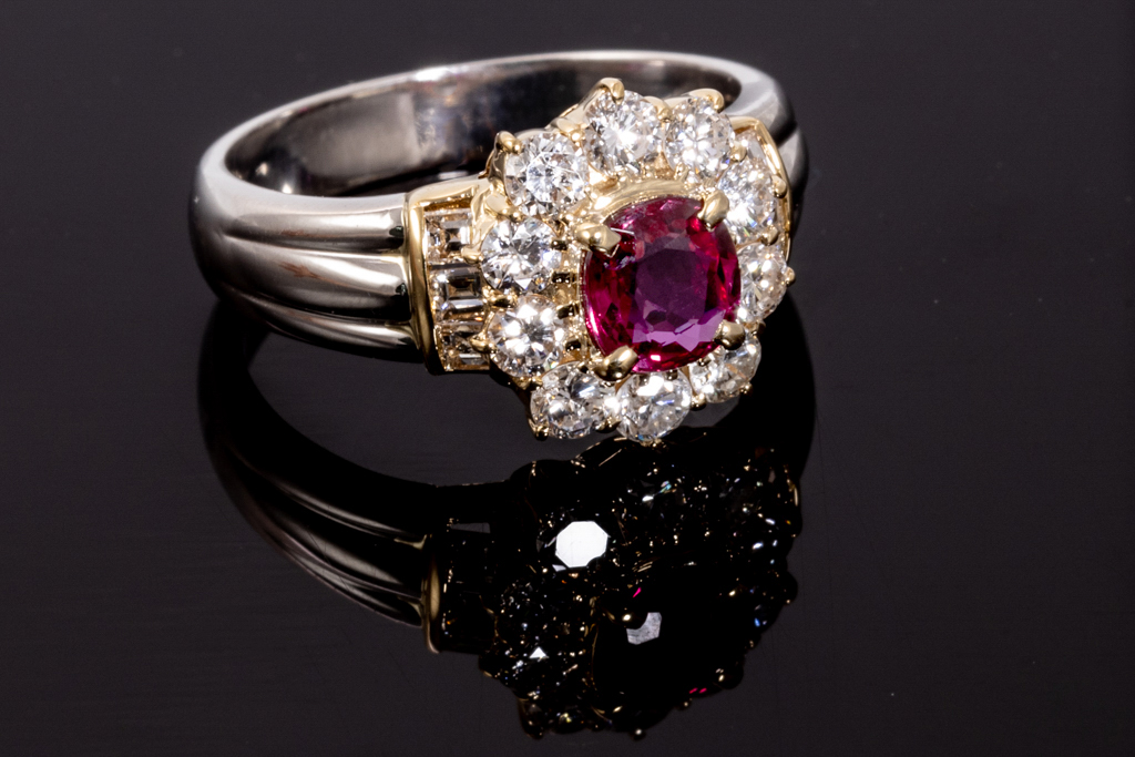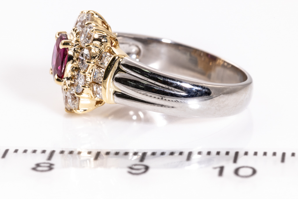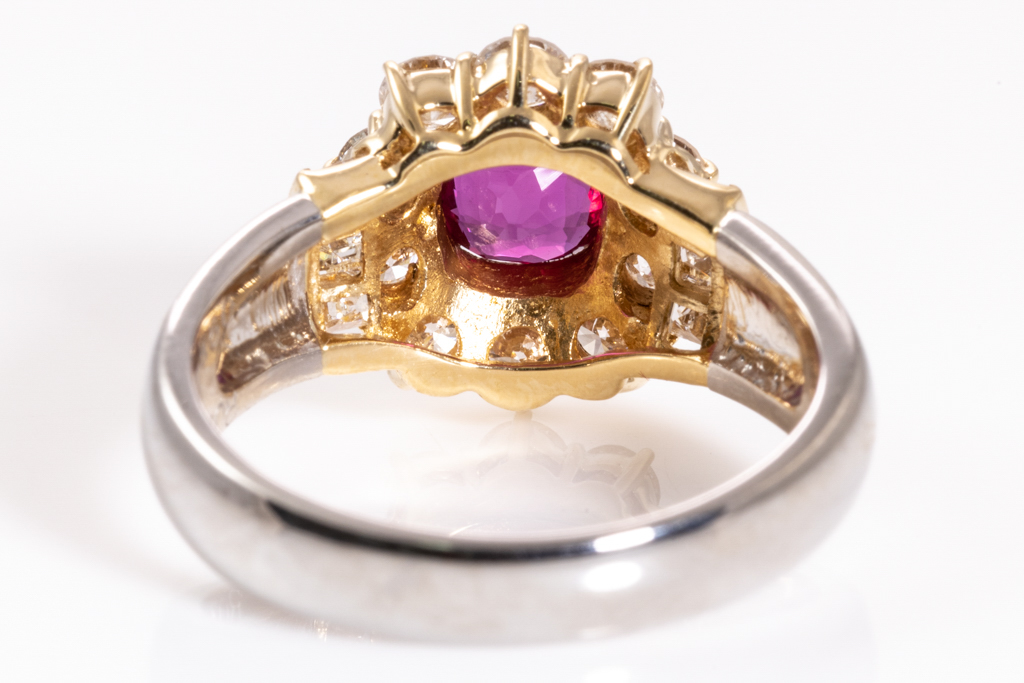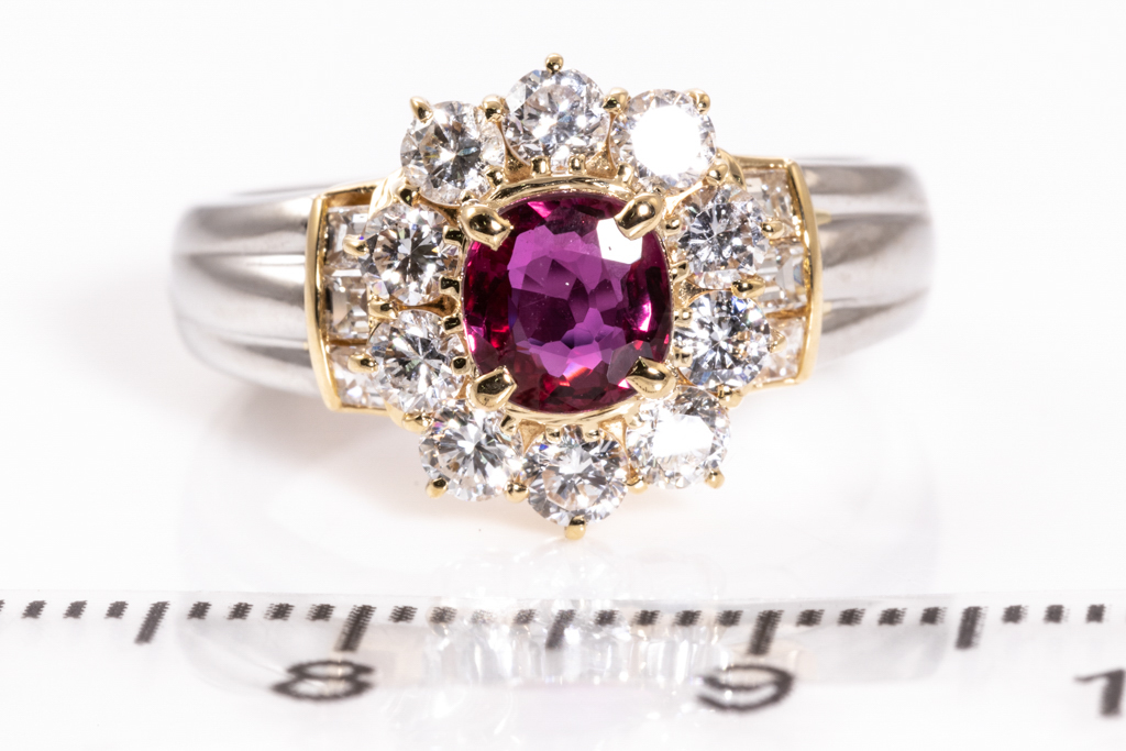 Ruby and Diamond ring with centre cushion cut Ruby of 0.75ct and round & carre cut Diamonds totalling 0.98cts (Estimated grading: H-I VS-SI). 18ct yellow gold and platinum. Ring size K - ring resizing down is not recommended. Weight: 6.4g (Pre-owned)