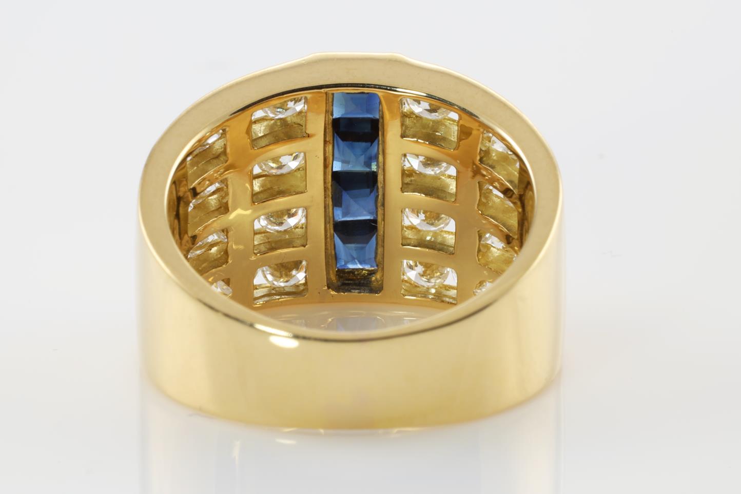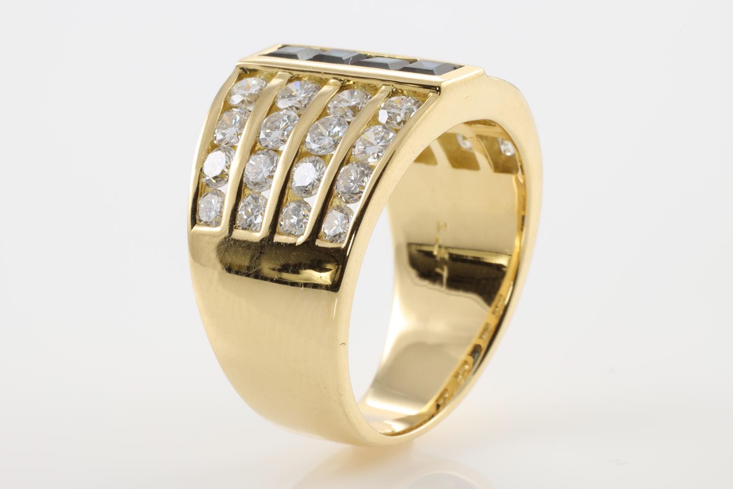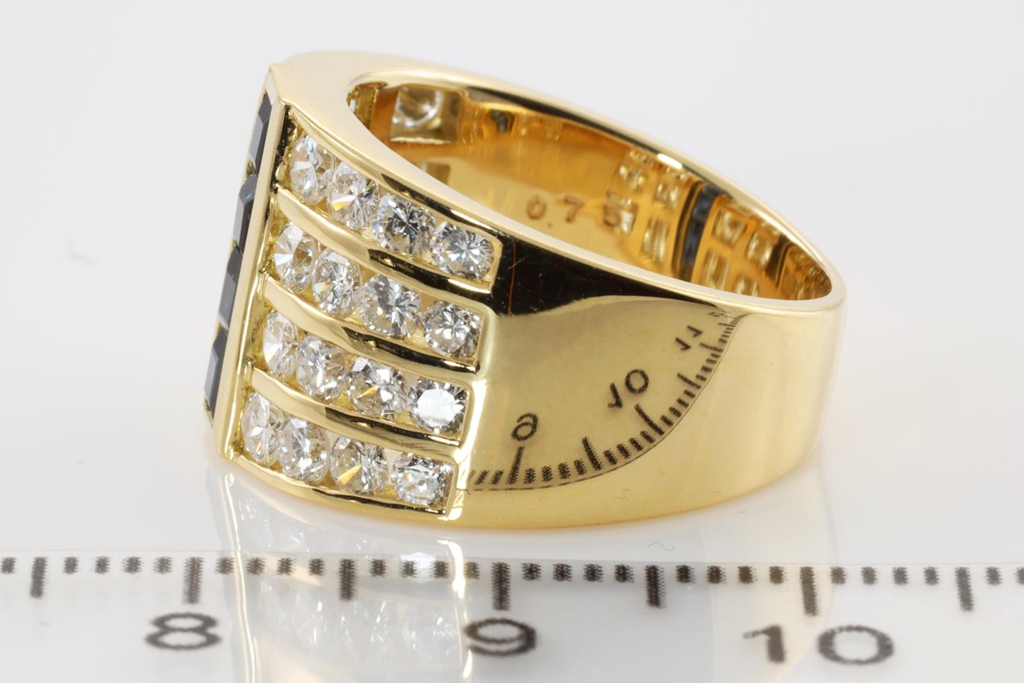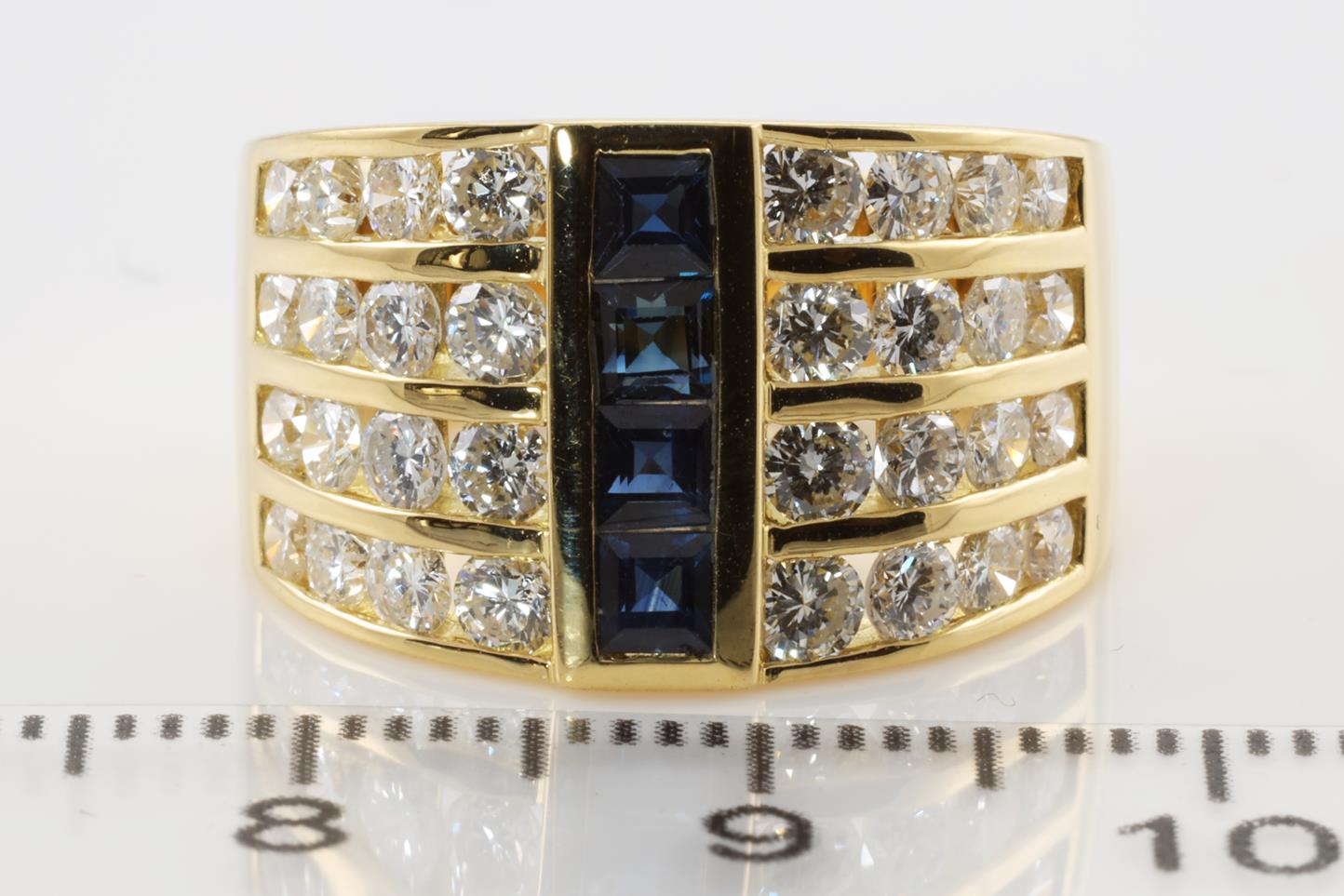 Sapphire and Diamond ring with square cut Sapphires totalling 0.75cts and round Diamonds totalling 1.17cts (Estimated grading: H VS-SI). 18ct yellow gold. Ring size: L1/2 - resizing up is not recommended, can only be resized down with ring clip. Weight: 9.6g (Pre-owned)