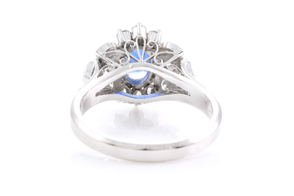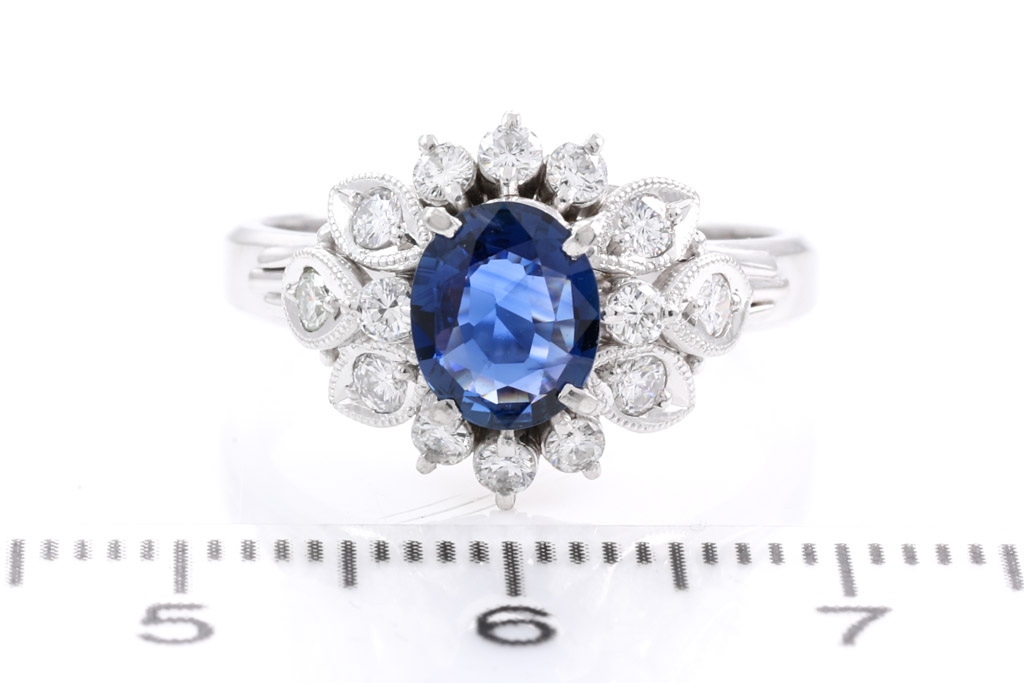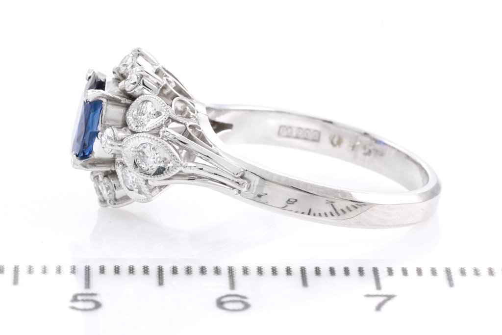 Sapphire and Diamond ring with oval blue Sapphire of 0.75ct and round Diamonds totalling 0.40cts (Estimated grading: G-H SI). Platinum. Ring size L 1/2. Weight: 6.5g. (Pre-owned)