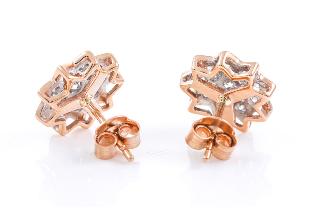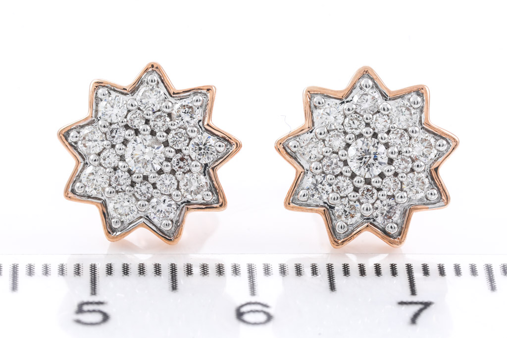 Diamond earrings with 38 round diamonds totalling 0.76cts. (Estimated grading: H SI). 14ct rose gold with rhodium plated diamond claws. Weight: 3.1g. (New)