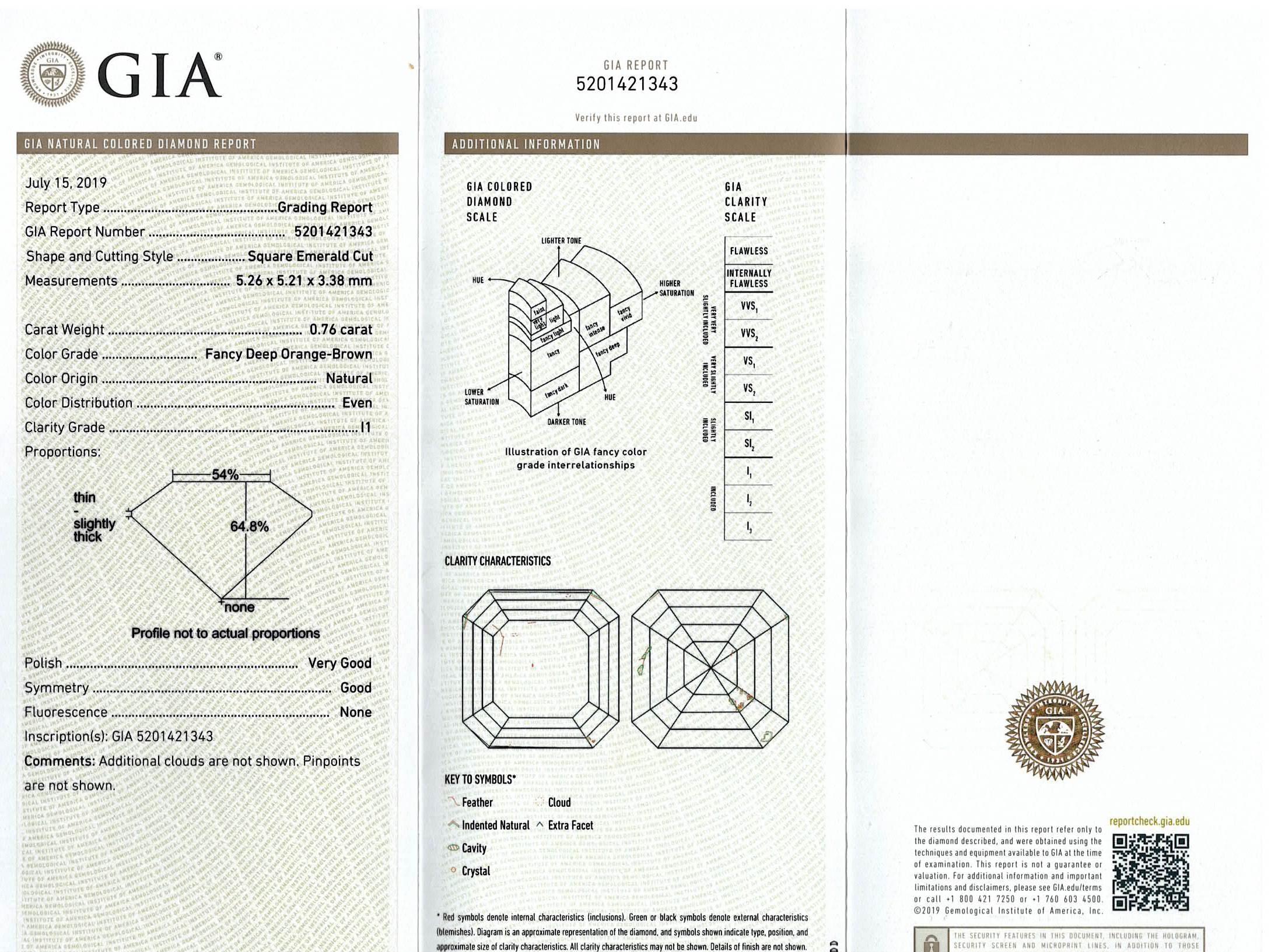 A loose square emerald cut Diamond of 0.76ct (with GIA report graded as Natural Fancy Deep Orange-Brown Even P1#5201421343). (New)
