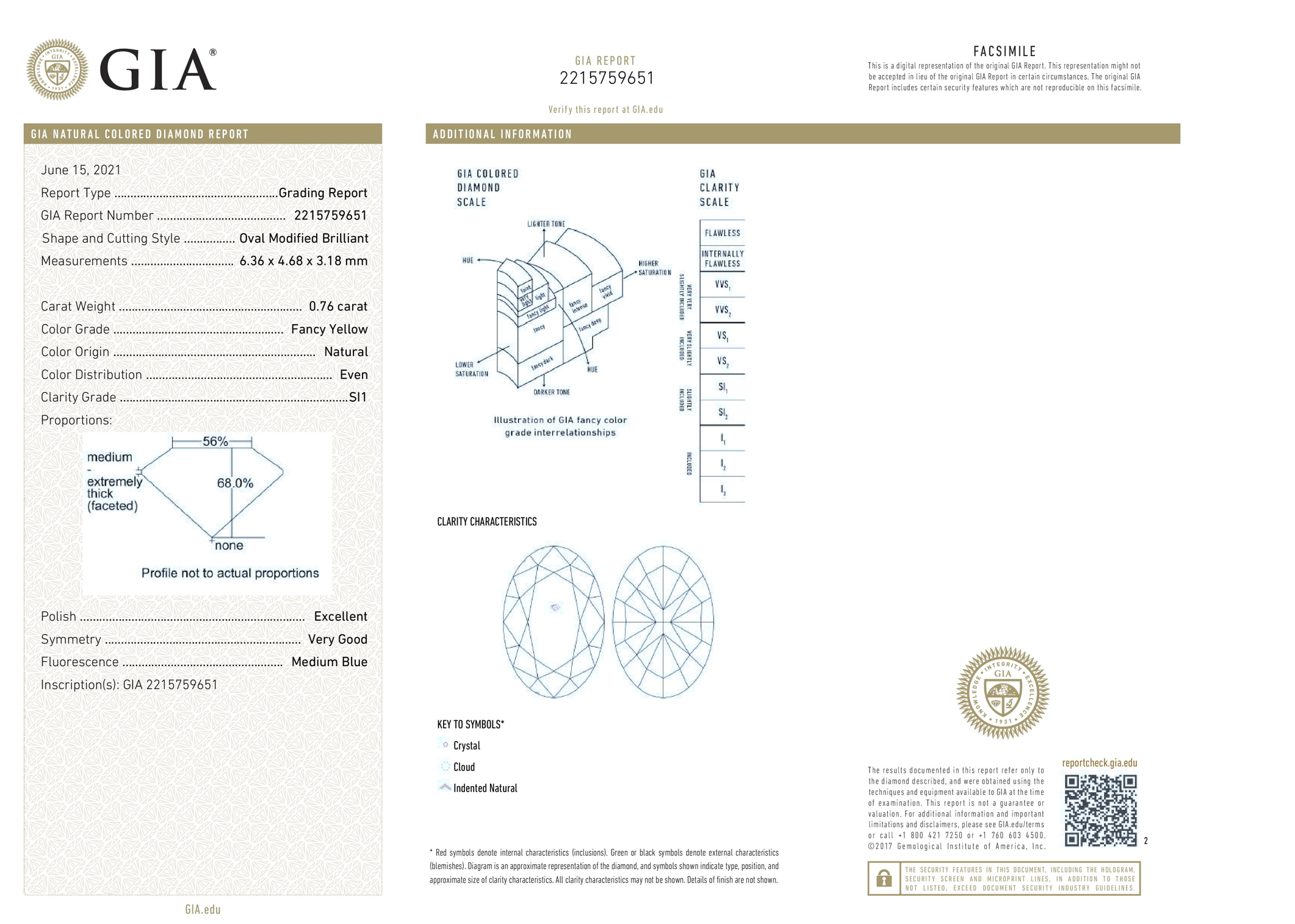 A loose oval shape Diamond of 0.76ct (with GIA report graded as Natural Fancy Yellow Even SI1#2215759651). (New)