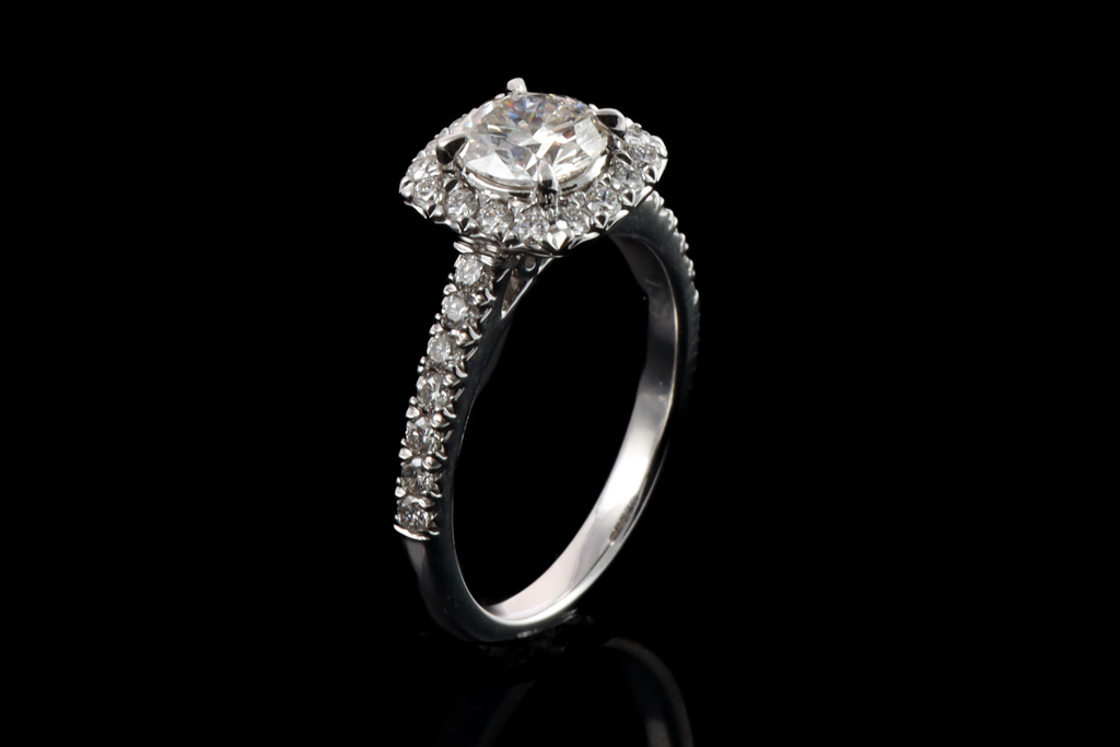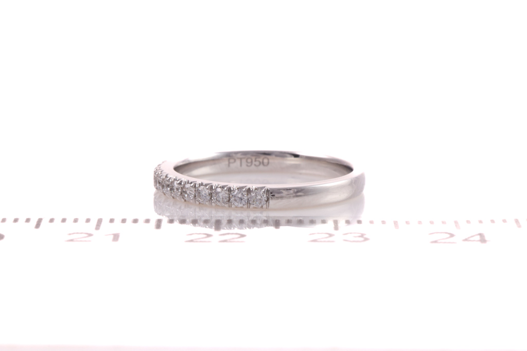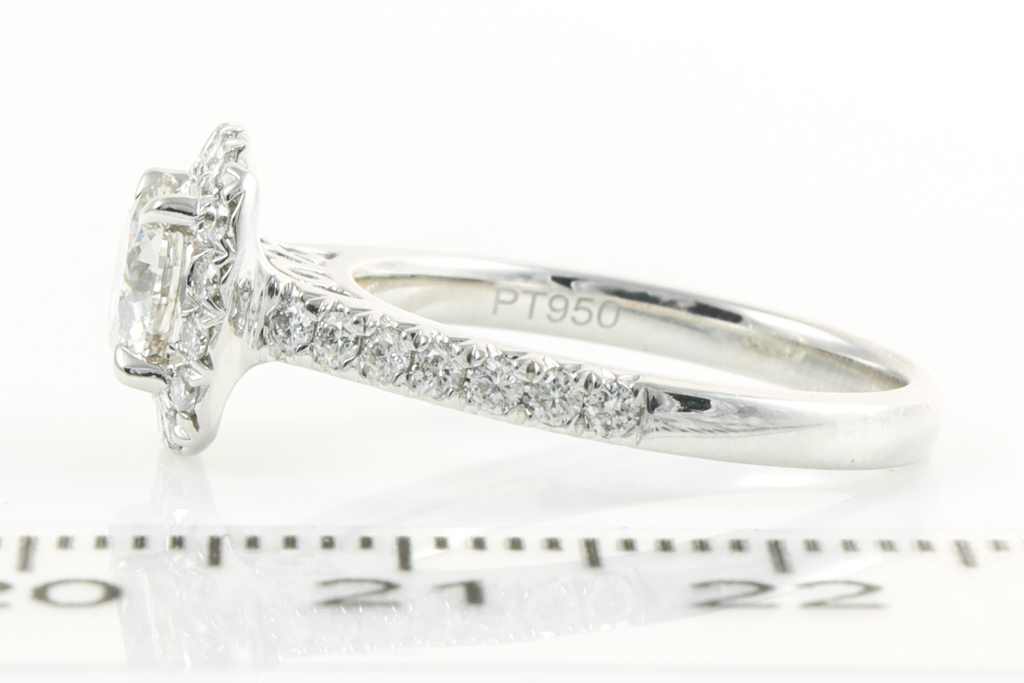 Diamond engagement ring set with Diamond halo ring set with a centre round brilliant cut Diamond of 0.77ct (Estimated grading: H SI1) and surrounding round Diamonds totalling 0.38cts (Estimated grading: G SI), platinum-950, ring size: J, weight: 4.7g. Matching Diamond eternity ring with round Diamonds of 0.26cts (Estimated grading: G SI), platinum-950, ring Size: J, weight: 2.8g. Total weight: 7.5g. (Pre-owned)