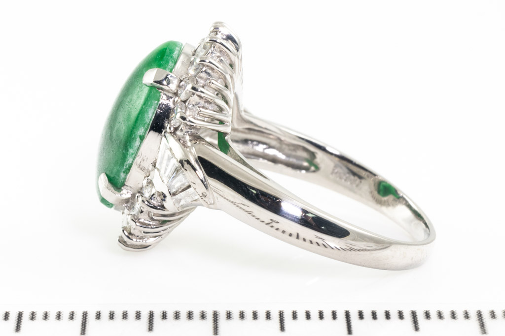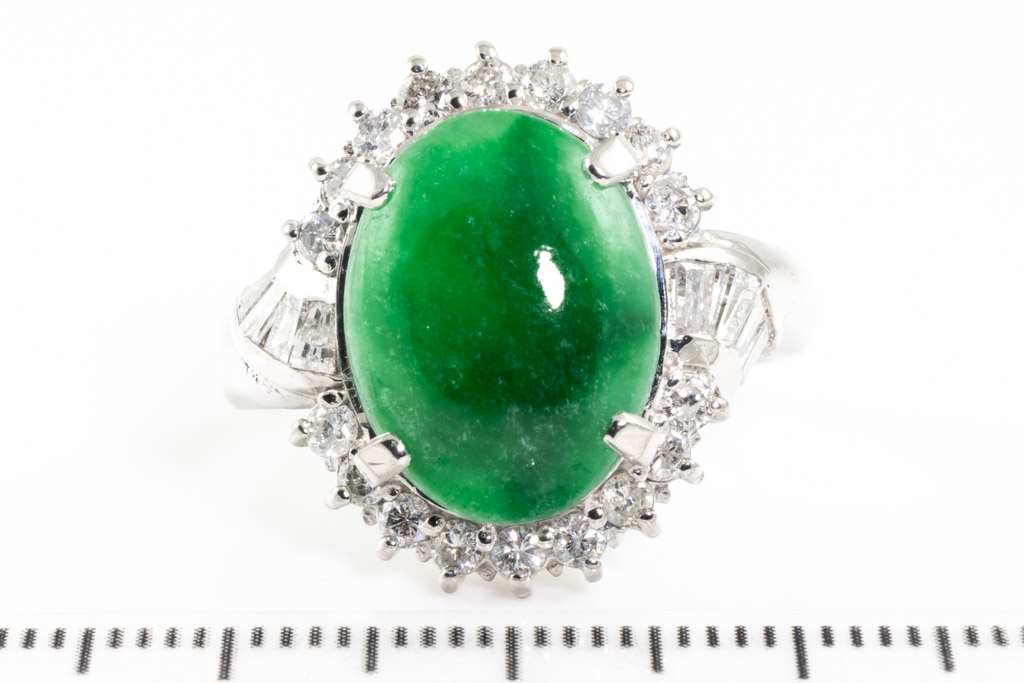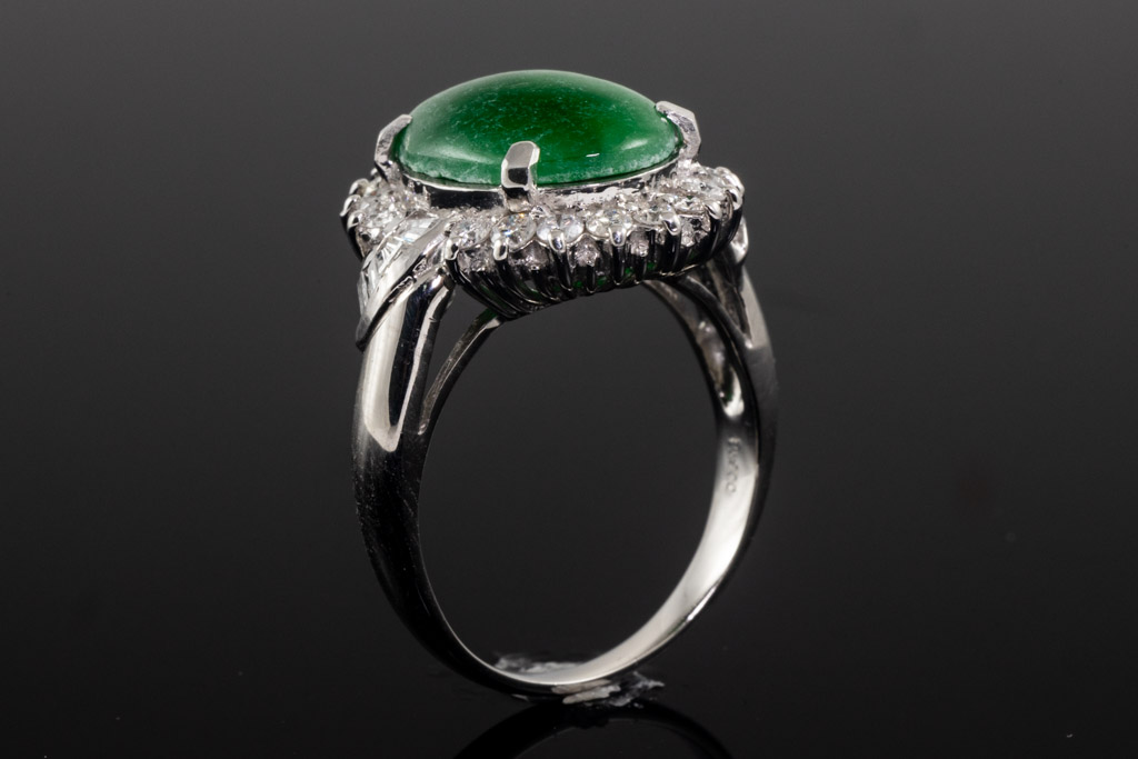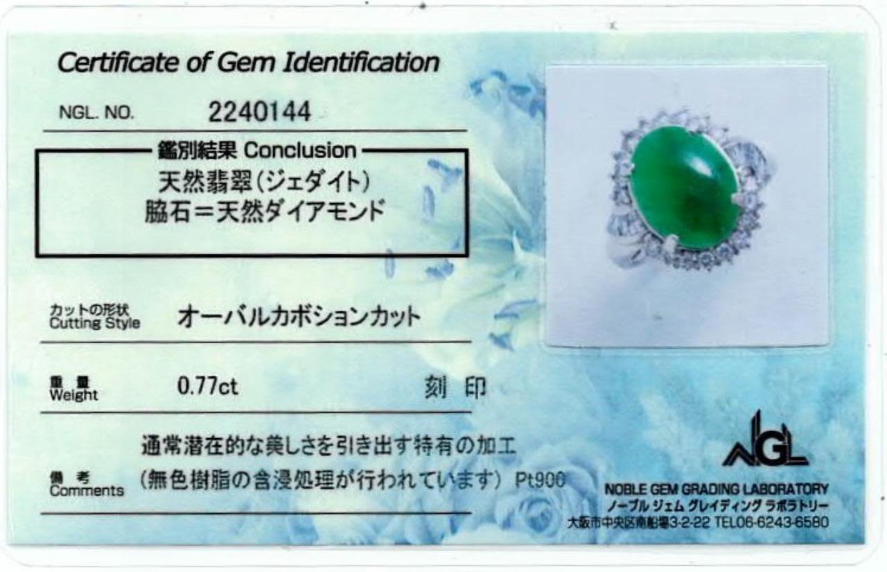 Jade and Diamond ring with an oval cabochon cut green Type A natural Jadeite Jade of 0.77ct and round & baguette cut Diamonds totalling approximately 1.00cts (Estimated grading: G-H SI-P1). Platinum. Ring size Q½. Weight: 10.9g. With Certificate of Gem Identification card #2240144. (Pre-owned)