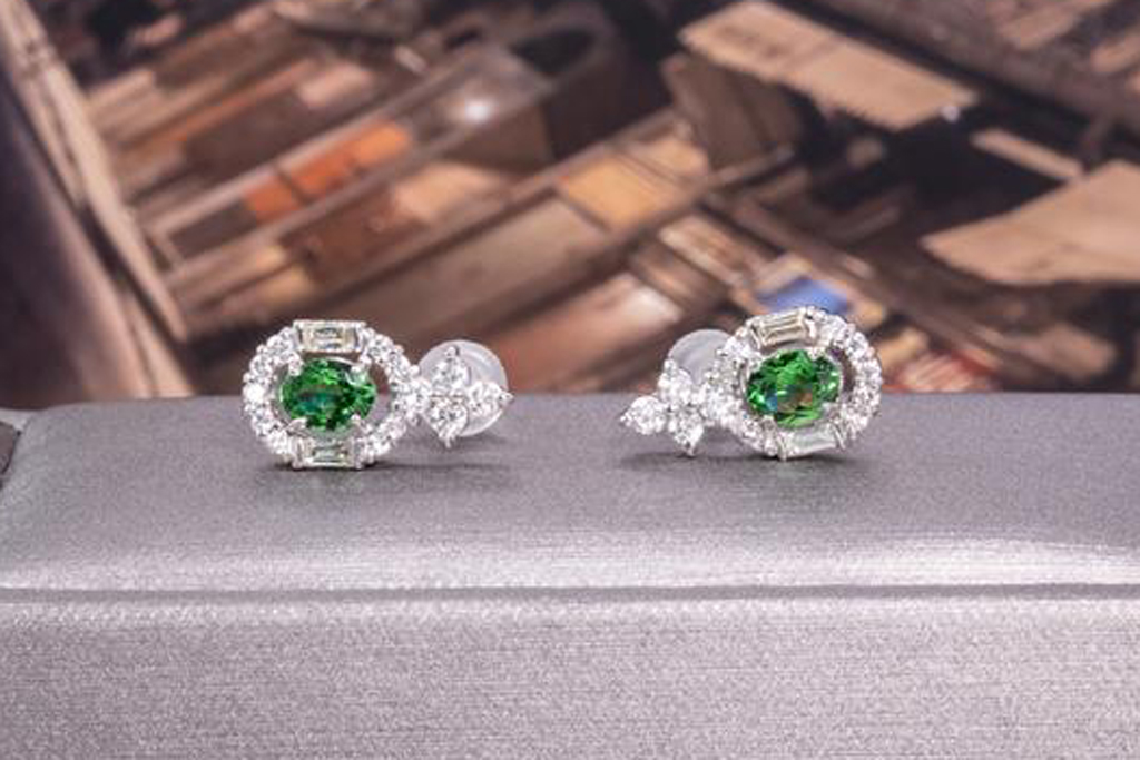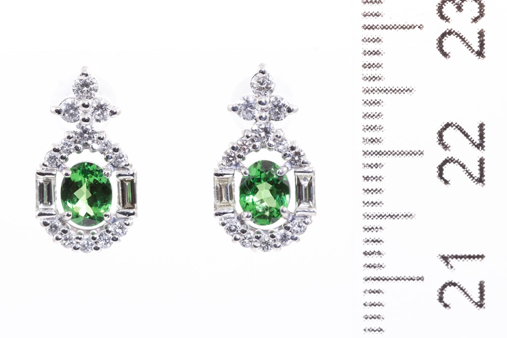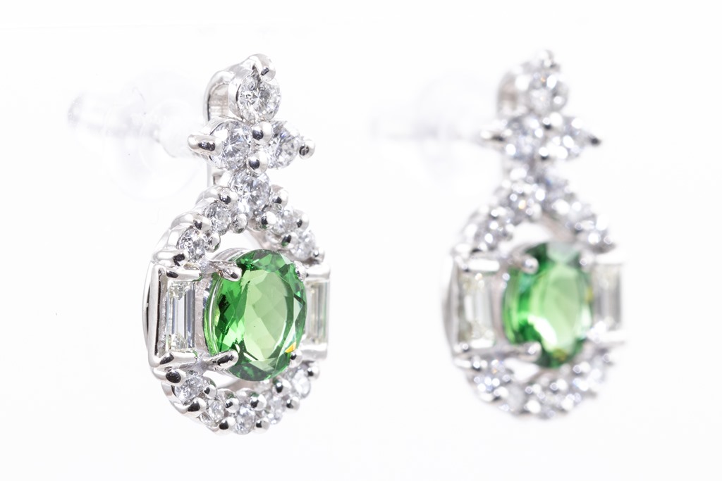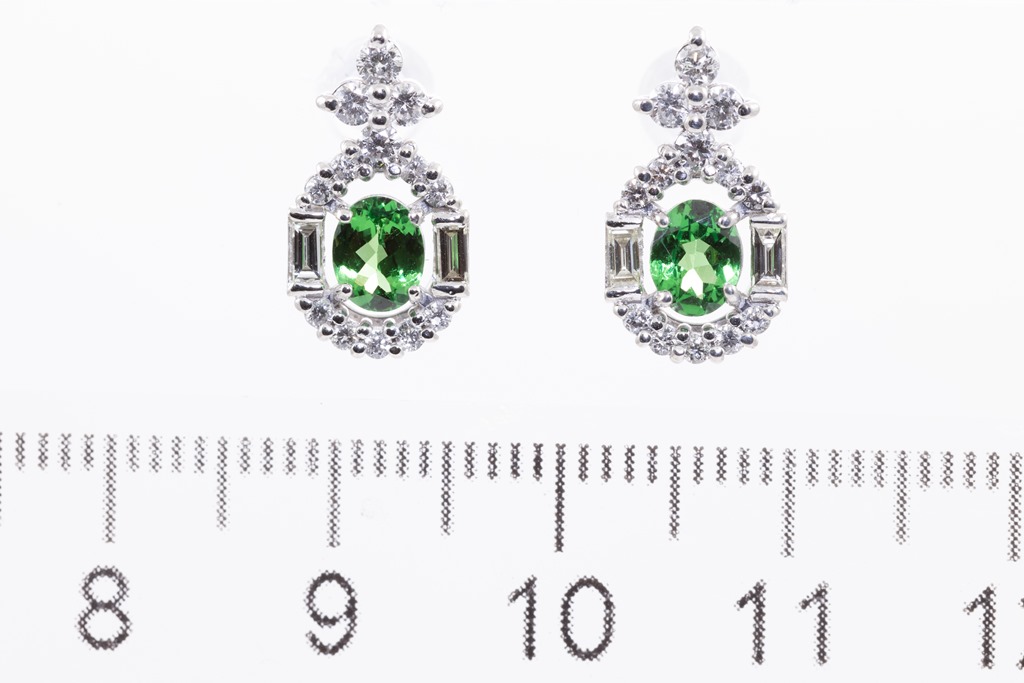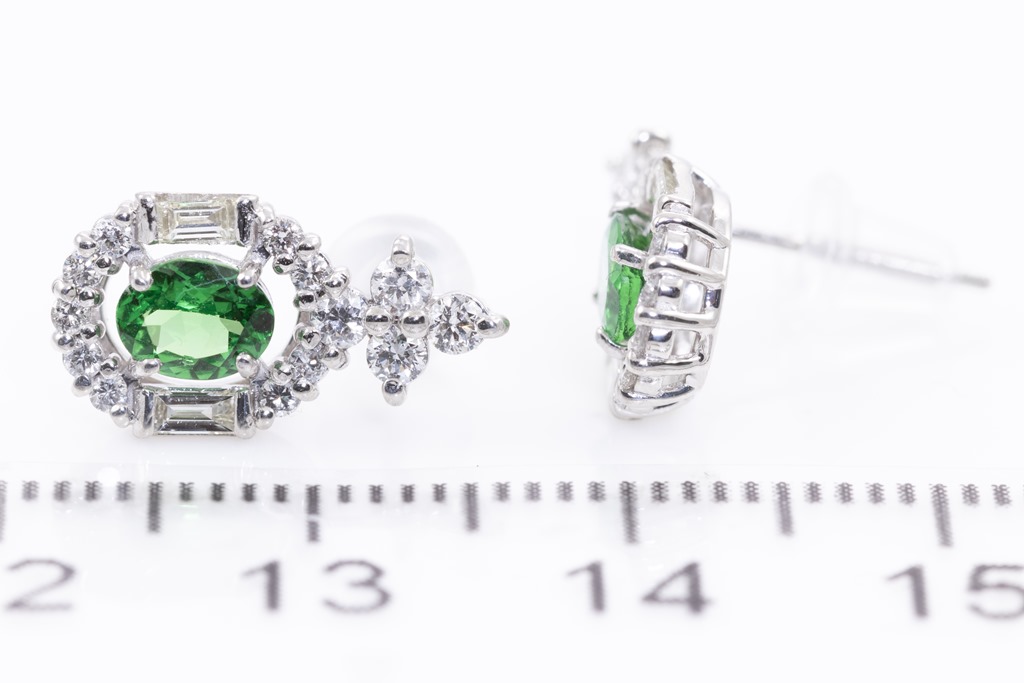 Tsavorite and Diamond earrings with oval Tsavorite Garnet totalling 0.77cts and Diamonds totalling 0.58cts (Estimated grading: HIJ VS-SI). Platinum with silicon backs. Weight: 3g. (Pre-owned)